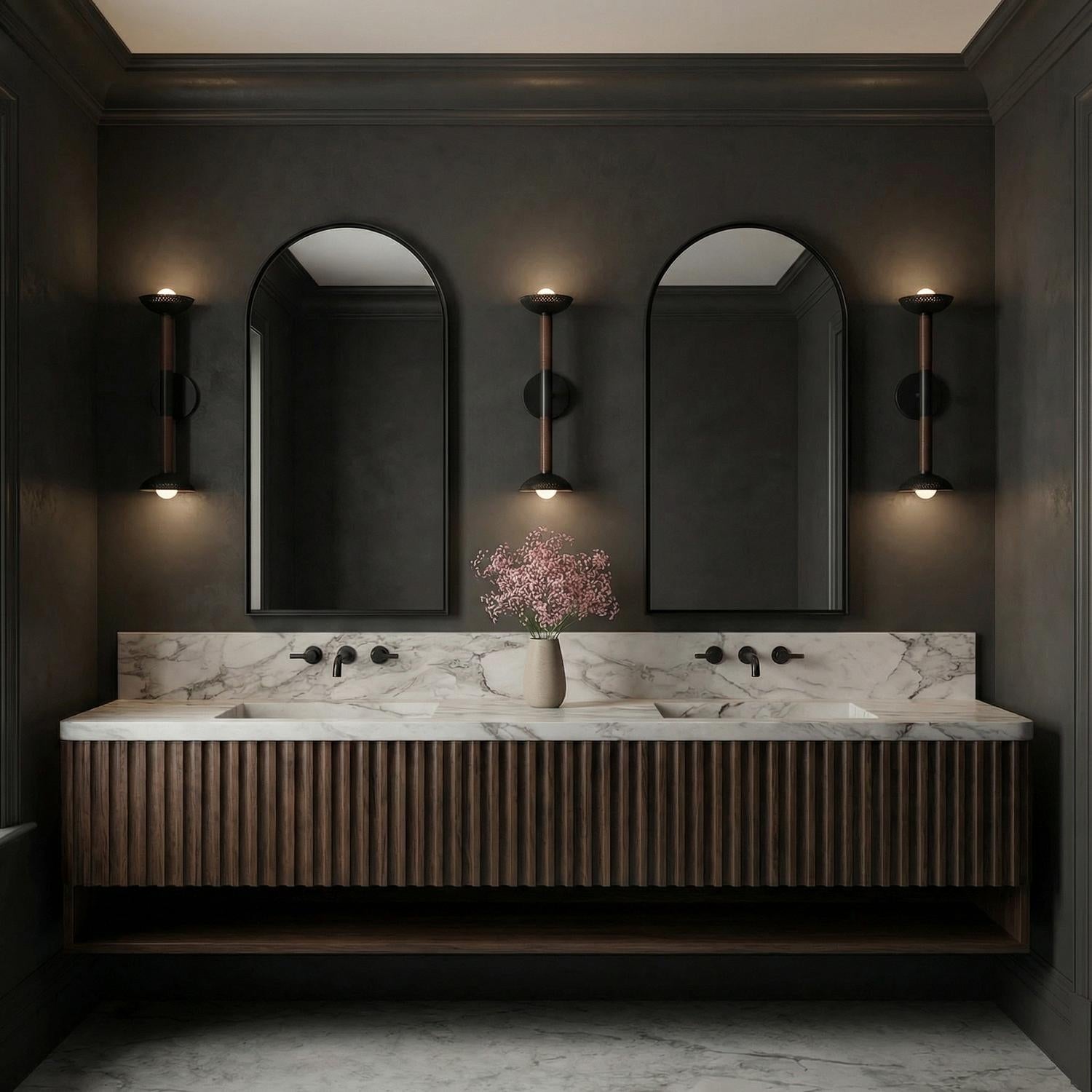 The Sheila 2 Light LED Wall Sconce brings distinctive modern style to any space with its sleek linear design and bold matte black and walnut finish. This striking fixture features slated walnut details along its elongated form, with two decorative perforated dome shades on each end. Sheila creates beautiful ambient lighting while adding contemporary visual interest to bathrooms, hallways, and living areas. The minimalist design provides clean lines and elegant presence, while the integrated LED technology delivers energy-efficient illumination with warm 3000K color temperature. At just under 23" in height, this vanity light makes a statement piece that combines refined sophistication with modern appeal for spaces that demand both style and functionality.