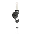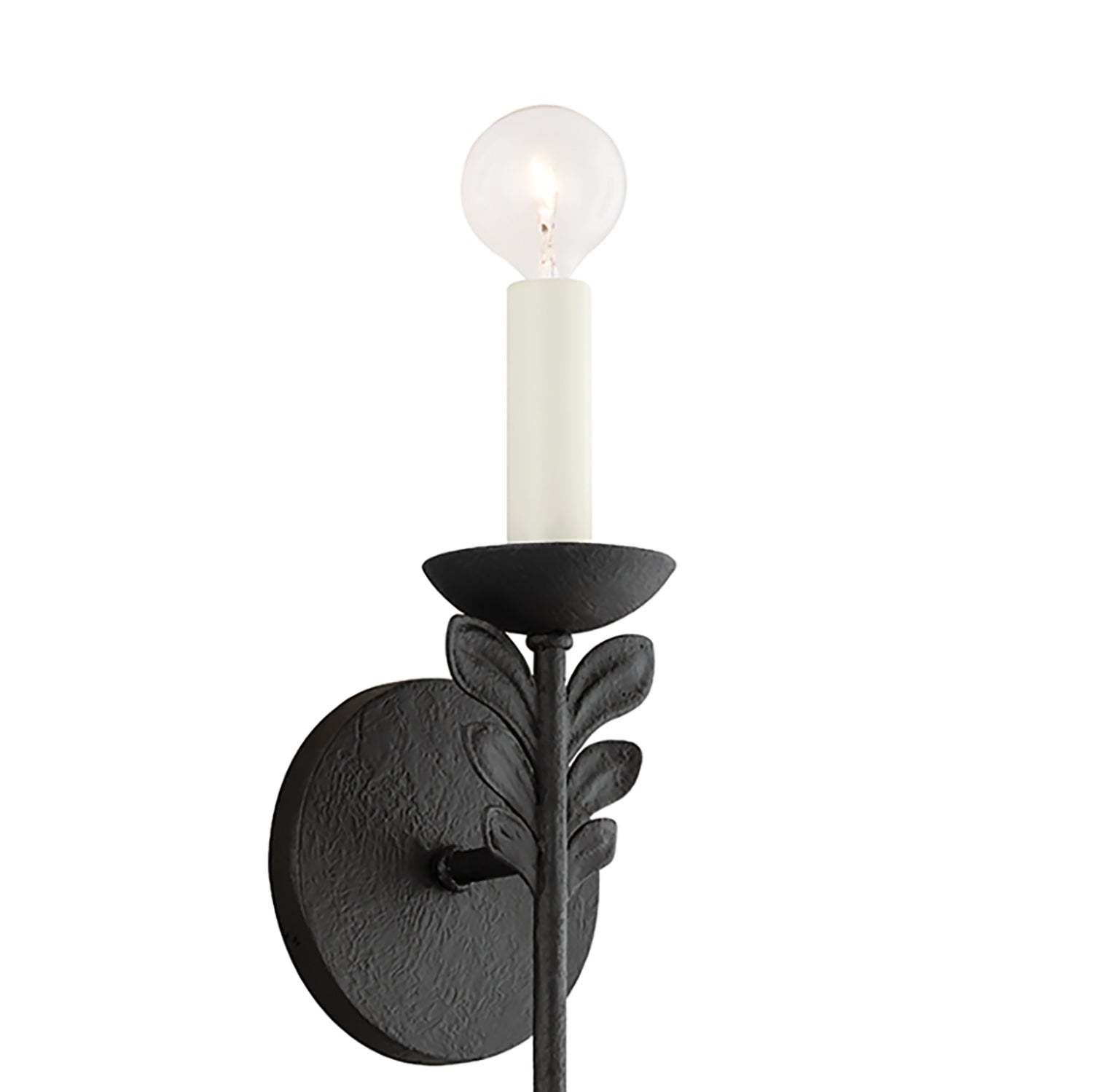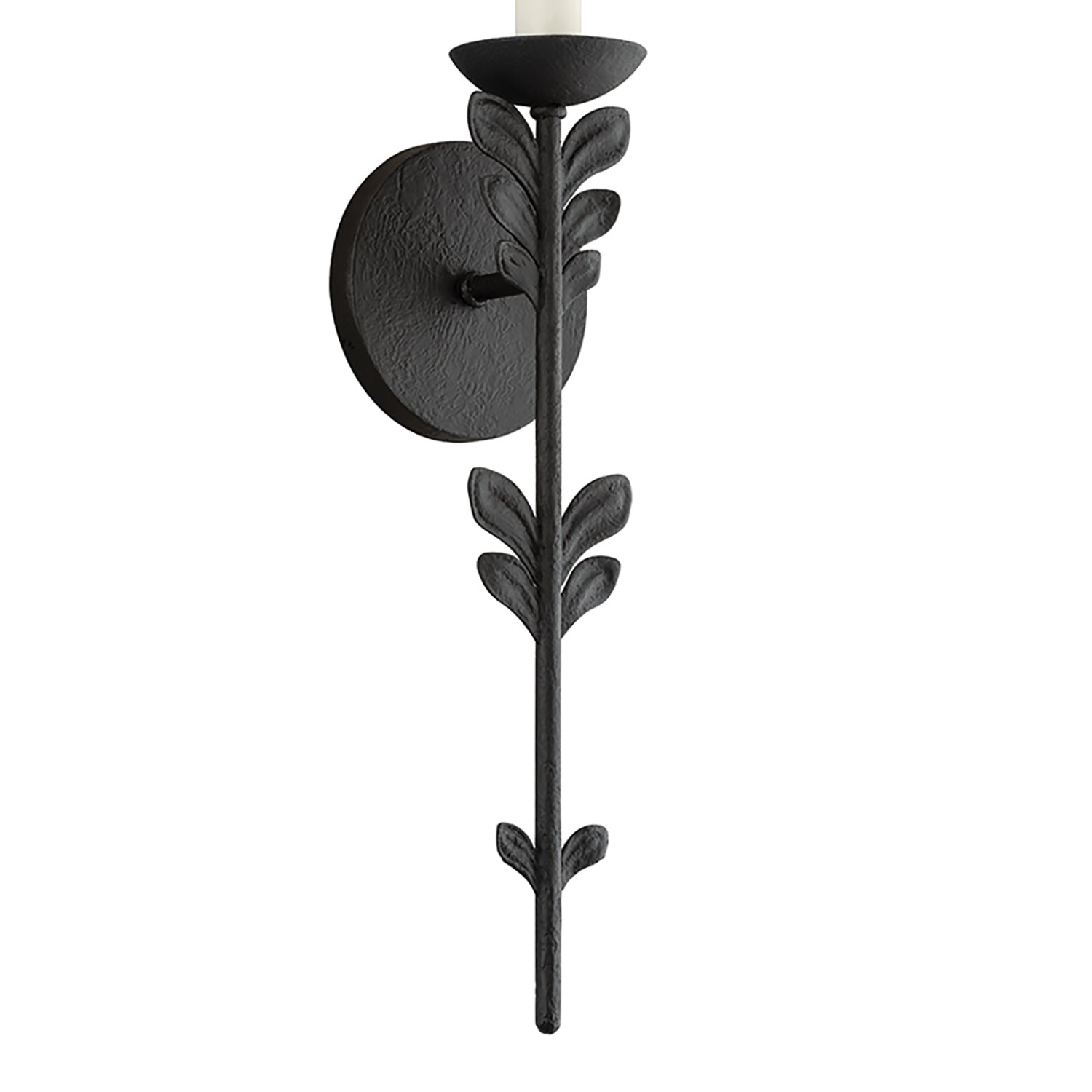 The Aviva Wall Sconce features a graceful design with an elegant stem adorned with delicate leaf motifs in a rich Antique Iron finish. This classic fixture showcases a single candle-style light arranged atop a slender botanical silhouette, creating a beautiful accent for your walls. The subtle leaf details and timeless form bring a touch of nature-inspired elegance to hallways, dining rooms, or living areas. Measuring 20" tall and extending just 4" from the wall, the Aviva creates warm, ambient illumination while adding architectural interest. The textured iron finish provides depth and character that complements both traditional and transitional interiors.