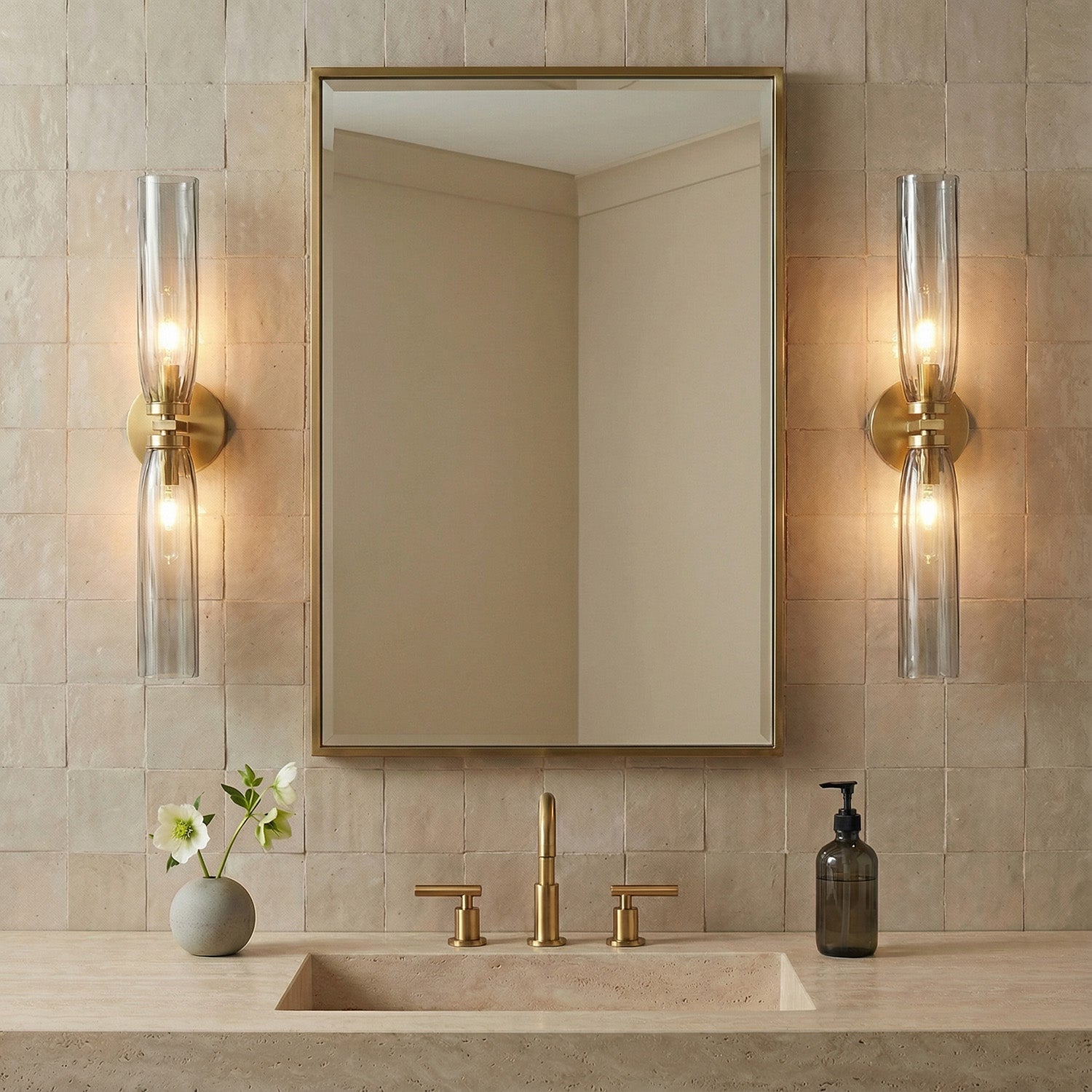 The Ernest 2 Light Wall Sconce 24" is a modern statement wall light that makes a sophisticated impression with its clean, vertical silhouette and striking stacked glass shades. The fixture features two stacked ribbed glass shades, each surrounding an exposed bulb, which are elevated by the subtle, cool tint of smoke glass. This tall vertical sconce is thoughtfully designed to add a layer of elegant, ambient light, making it an ideal choice for flanking a bathroom vanity or providing height to a hallway. With its UL damp rating, it offers both functional beauty and versatile appeal. The rich Aged Brass finish enhances the fixture's clean lines, delivering enduring style and a perfect blend of modern elegance and functional simplicity.