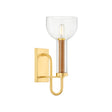 The Esther Wall Sconce 14" is a modern transitional wall light that makes a sophisticated statement with its unique blend of tailored metalwork and natural texture. The fixture features a tall, clear glass shade supported by a sleek, curved arm, with a central element wrapped in Rattan Accents. This detail adds organic, transitional style to the modern form, creating a soft, welcoming glow that is ideal for a bathroom vanity or hallway. With its UL damp rating, it offers both functional beauty and versatile appeal. The rich Aged Brass finish enhances the fixture's clean lines, delivering enduring style and a perfect blend of elegance and simplicity.