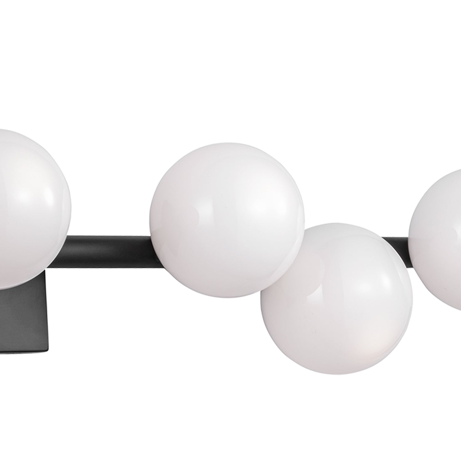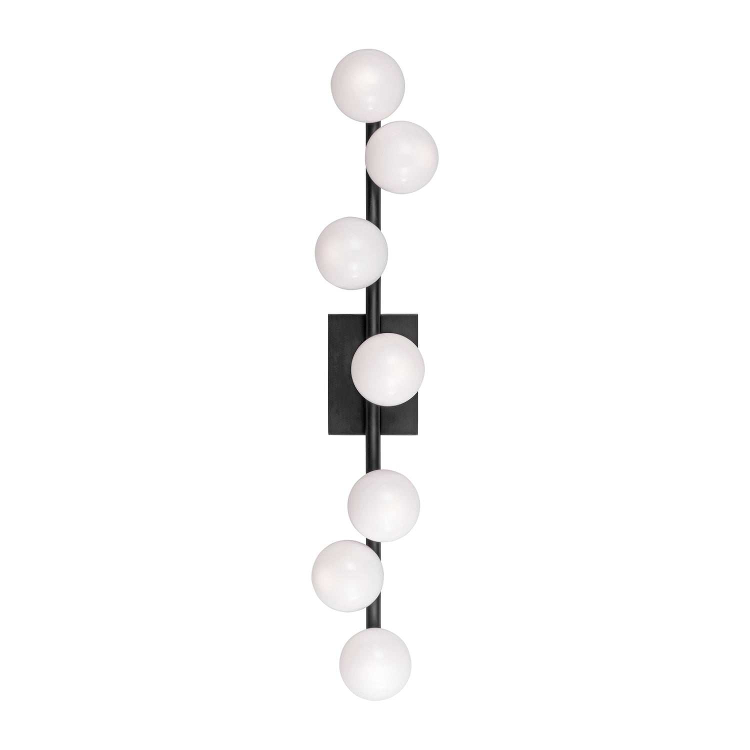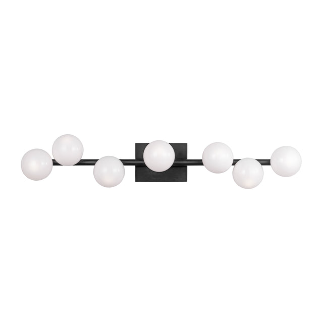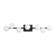 The Veya 7 Light Wall Sconce combines simple metal structures with elegant milk glass globes that draw inspiration from floating bubbles, creating airy elegance with refined contemporary appeal. This elegant 32" linear wall sconce features seven coordinated milk glass globes positioned along a clean horizontal framework, showcasing minimalist structures that create a refined statement, perfect for hallways, bedrooms, bathrooms, living spaces, and areas seeking dramatic wall lighting with artistic character. The aged iron framework creates sophisticated depth against the streamlined design, while the milk glass globes enhance the organic charm. With its damp-rated construction and expansive linear proportions, this expertly crafted wall sconce elevates any space with contemporary style and reliable performance.
