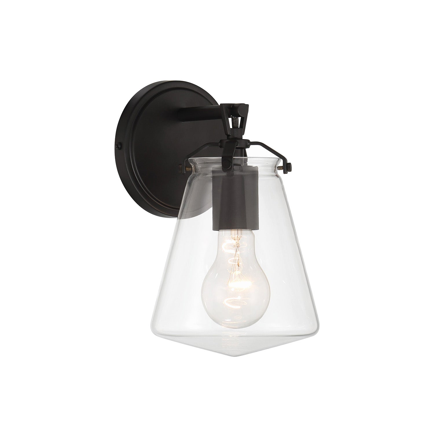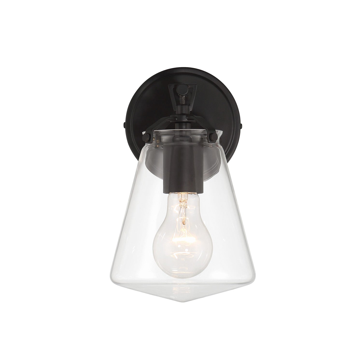 The Addison Wall Sconce brings timeless sophistication to bathrooms, hallways, and living spaces with its clean, architectural design. Featuring a tapered clear glass shade that showcases the bulb within, this fixture creates both focused task lighting and ambient illumination. The matte black backplate and fixture hardware add a bold, contemporary touch that complements both modern and industrial interiors. The Addison sconce combines classic materials with contemporary sensibility to create a versatile lighting solution that enhances your space with refined elegance.