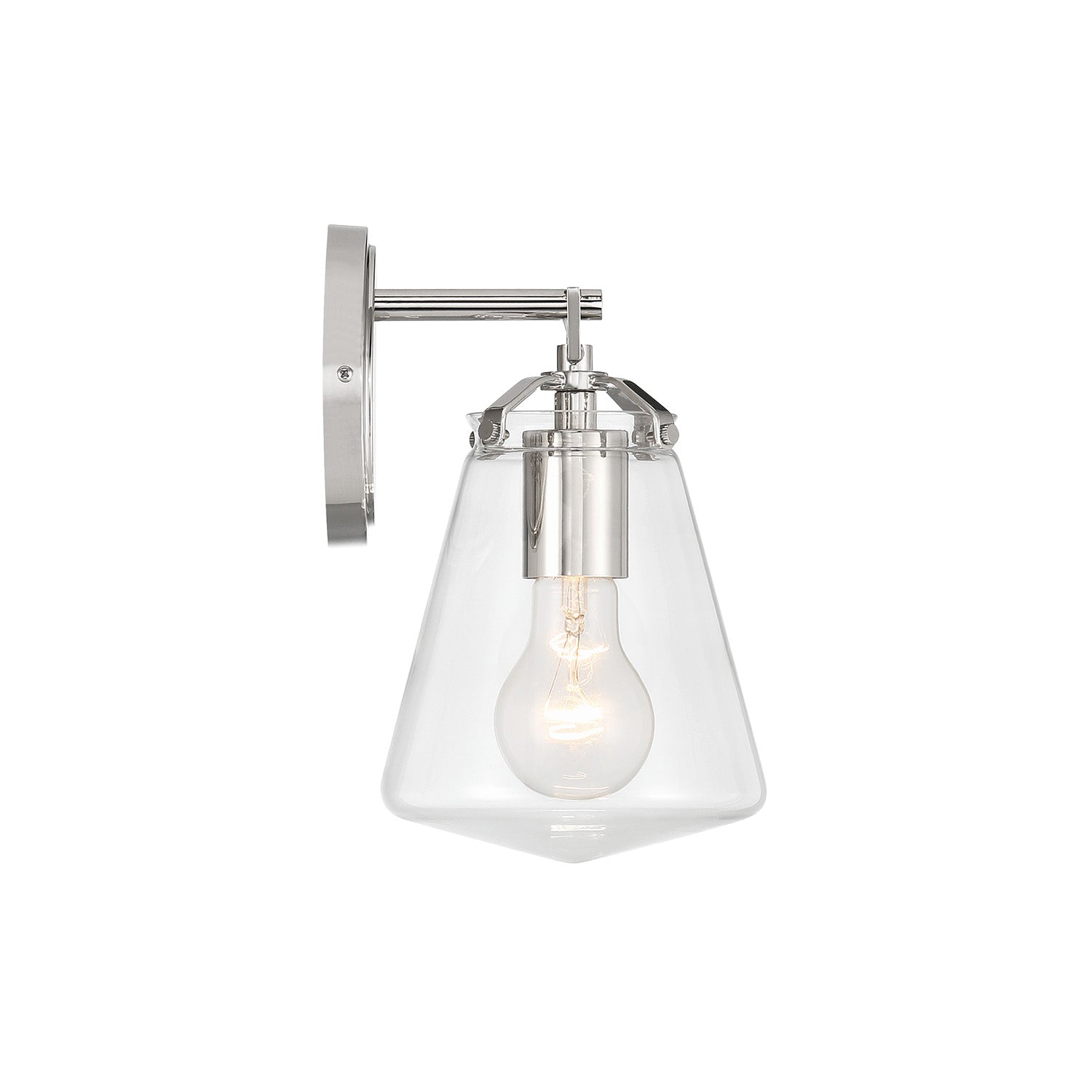 The Addison Wall Sconce brings timeless sophistication to bathrooms, hallways, and living spaces with its clean, architectural design. Featuring a tapered clear glass shade that showcases the bulb within, this fixture creates both focused task lighting and ambient illumination. The polished nickel backplate and fixture hardware add a bright, refined touch that complements both modern and traditional interiors. The Addison sconce combines classic materials with contemporary sensibility to create a versatile lighting solution that enhances your space with refined elegance.