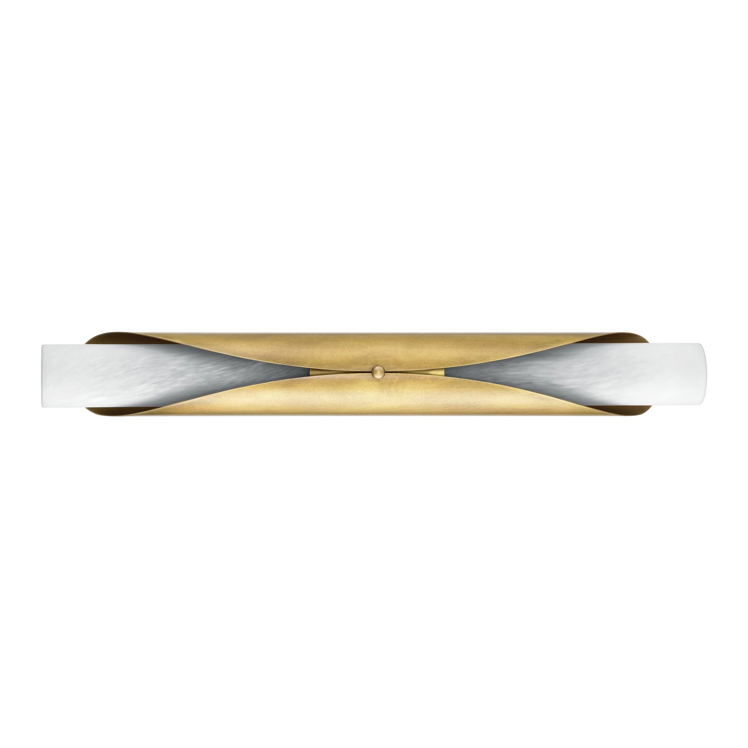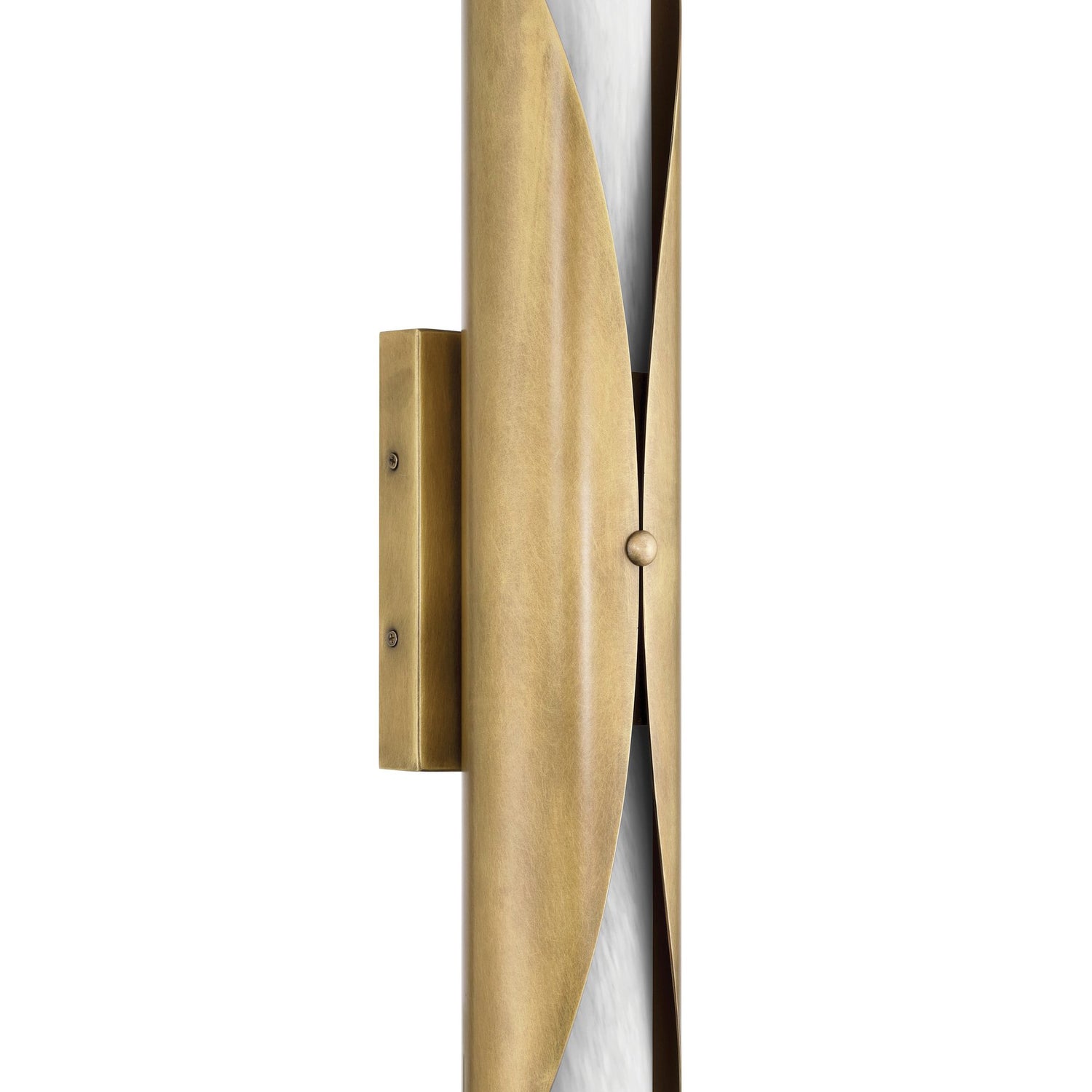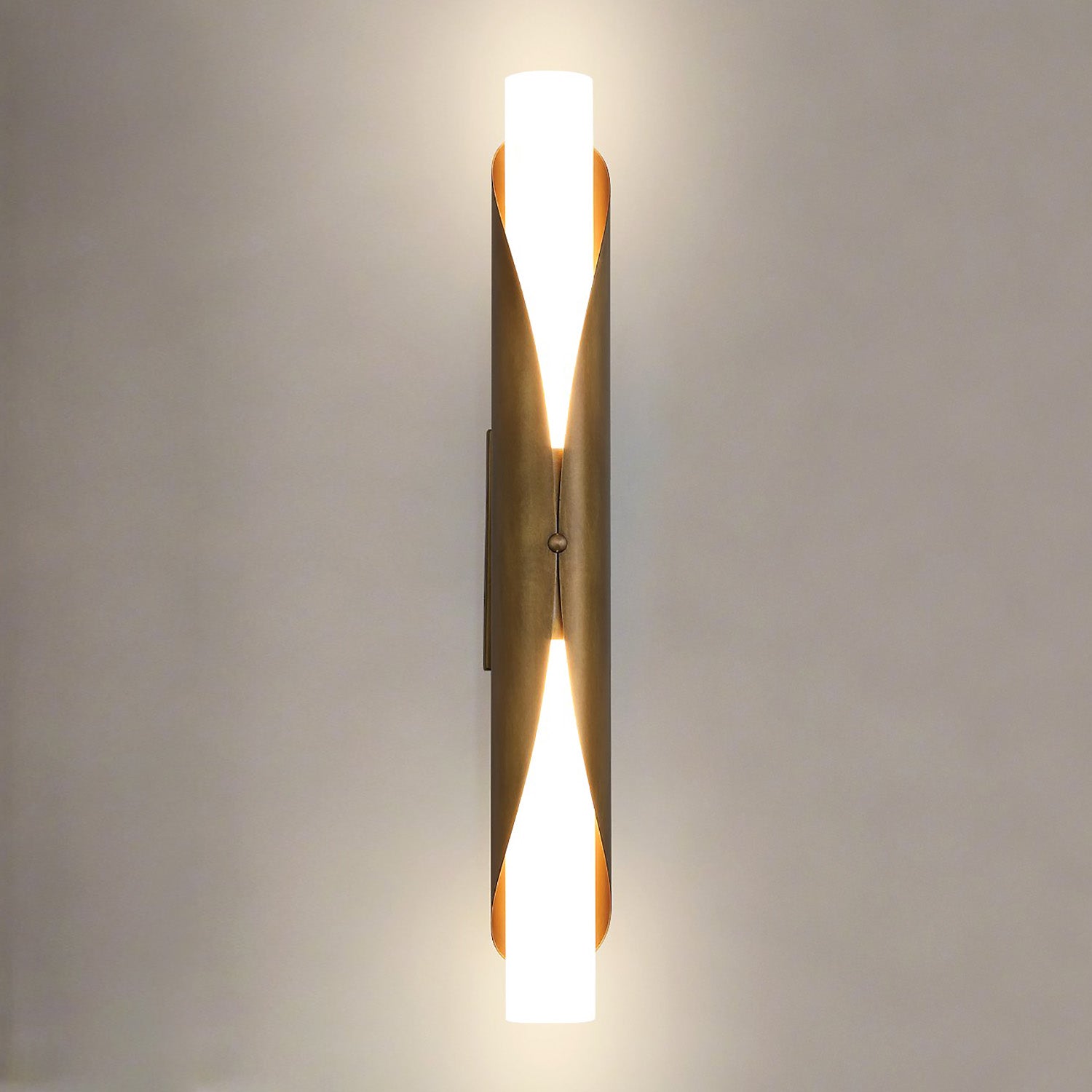 The Alessio Wall Sconce from modern Art Deco influences, featuring a sophisticated distressed brass frame that folds in sweeping, rhythmic curves around a central column of faux alabaster glass. This refined design creates a dynamic interplay of light and shadow, as the metallic petals cradle the illuminated glass to provide a soft, diffused radiance. Designed for maximum versatility, this fixture serves as a captivating architectural accent whether mounted vertically or horizontally to suit the specific needs of your space. Its balanced proportions make it an ideal choice for flanking a mirror in a bathroom, illuminating a contemporary hallway, or adding a sophisticated architectural touch to a modern living area.