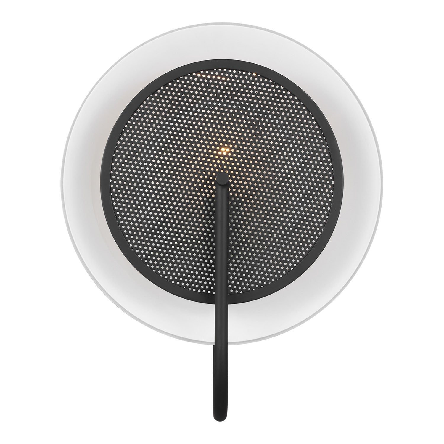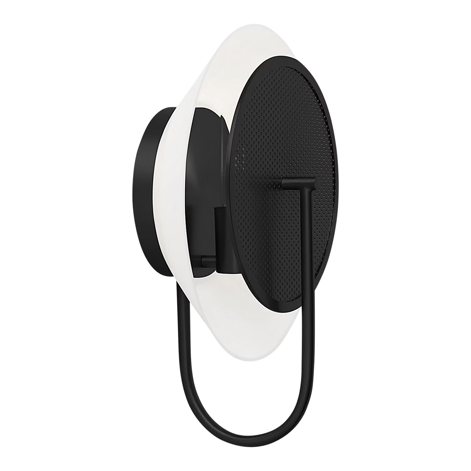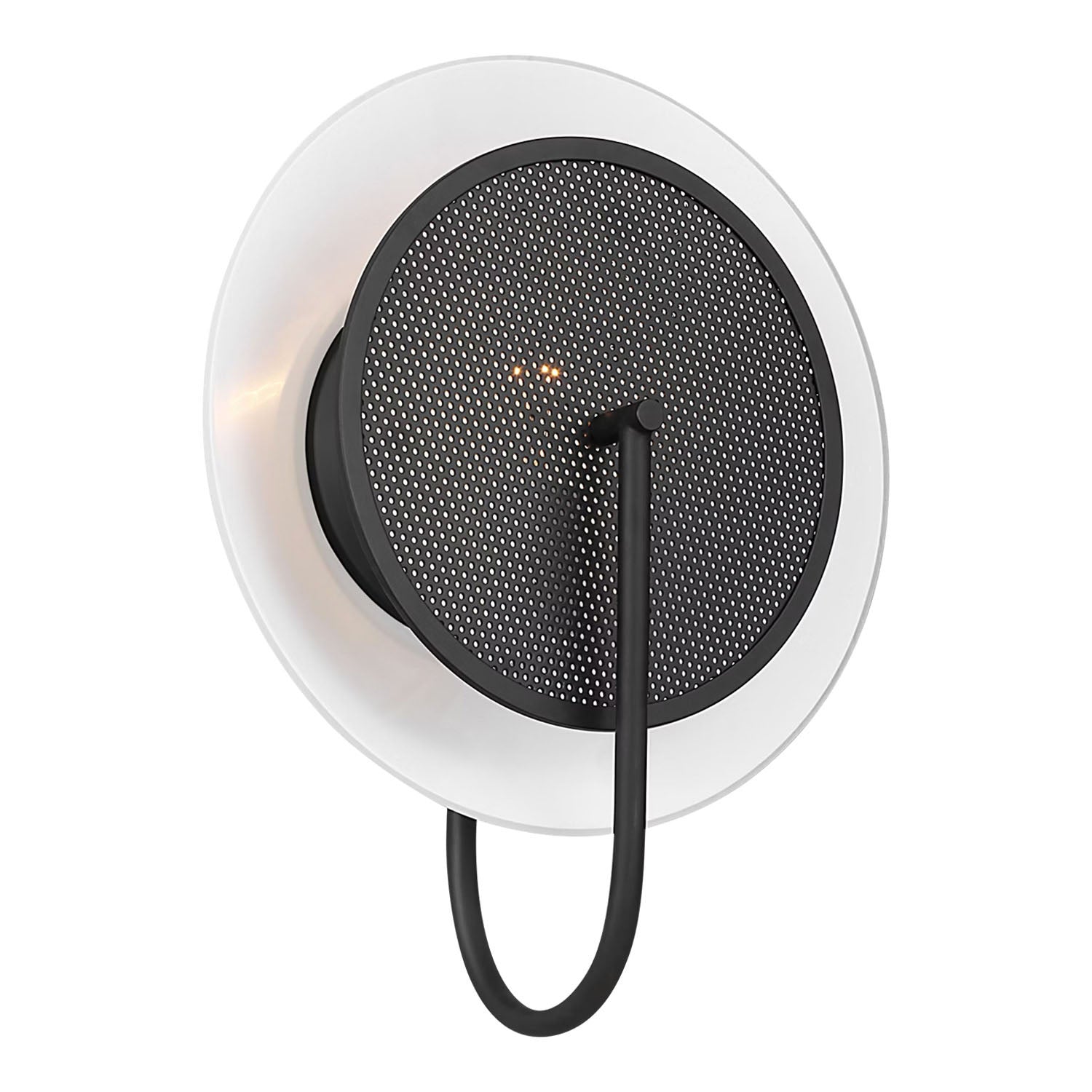 • Artful wall sconce featuring a layered design of a milk glass shade and a perforated matte black metal disc