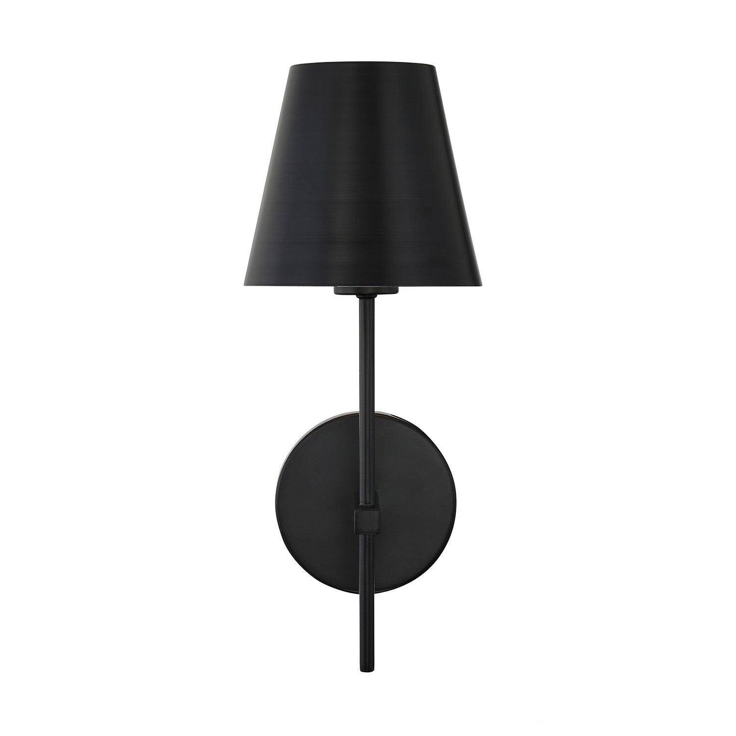 • A sleek metal wall sconce with a slender profile, featuring a matte black steel shade for a clean, modern look