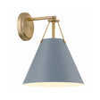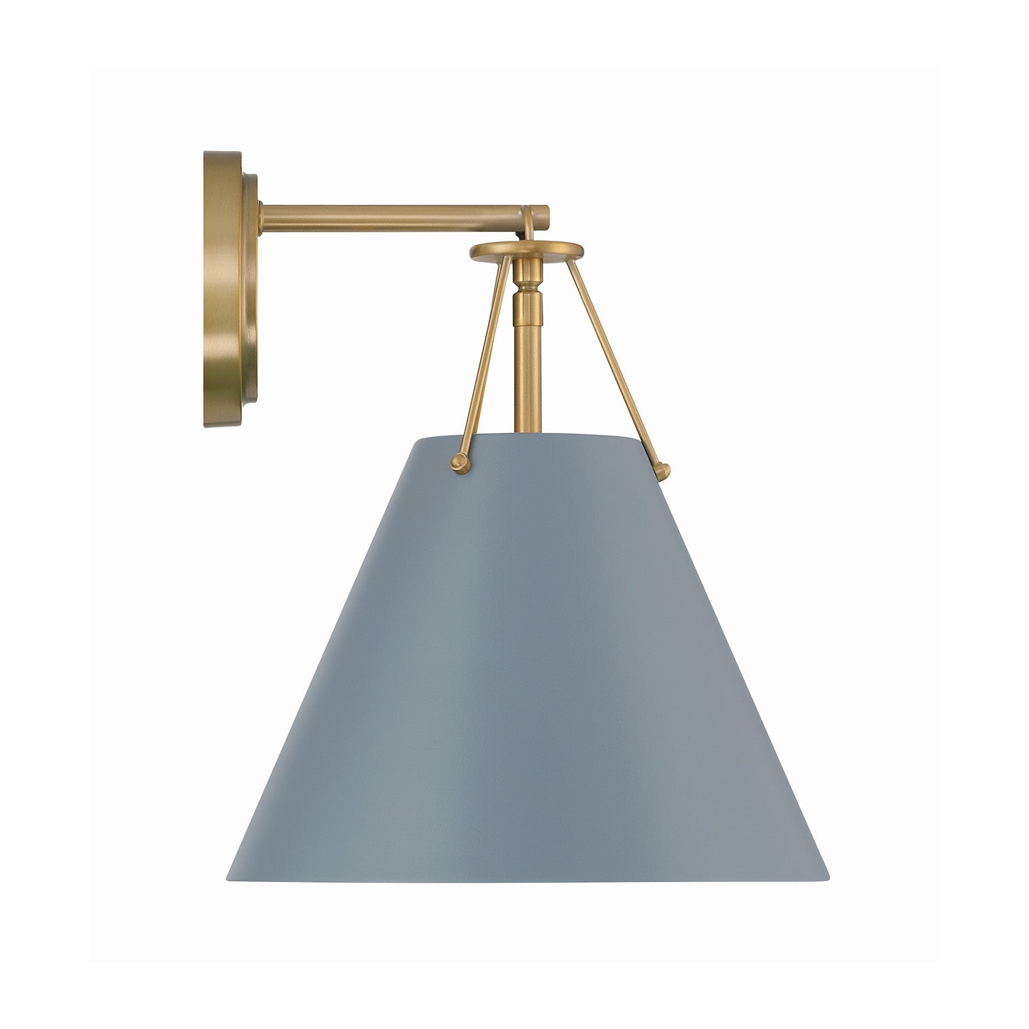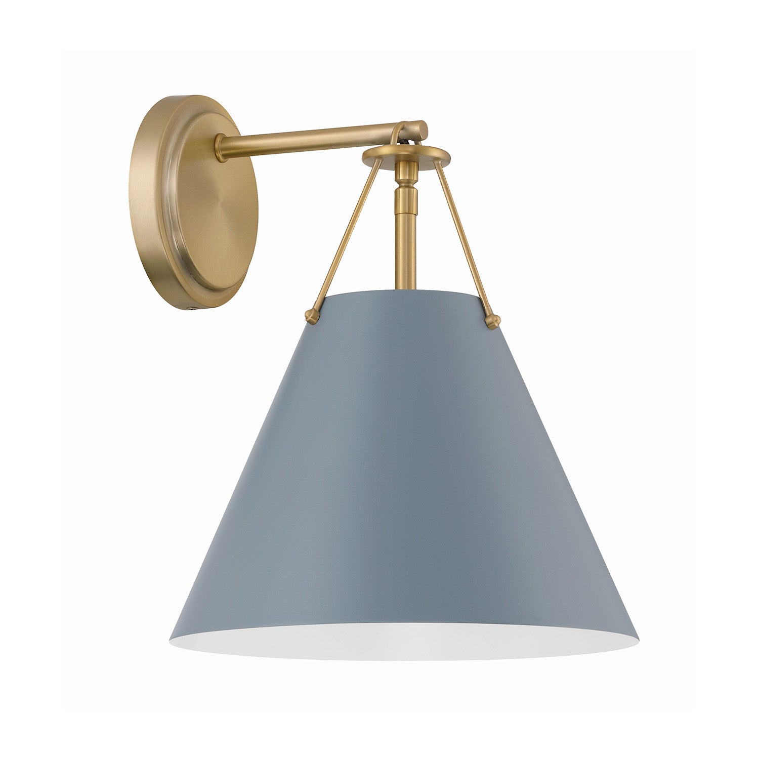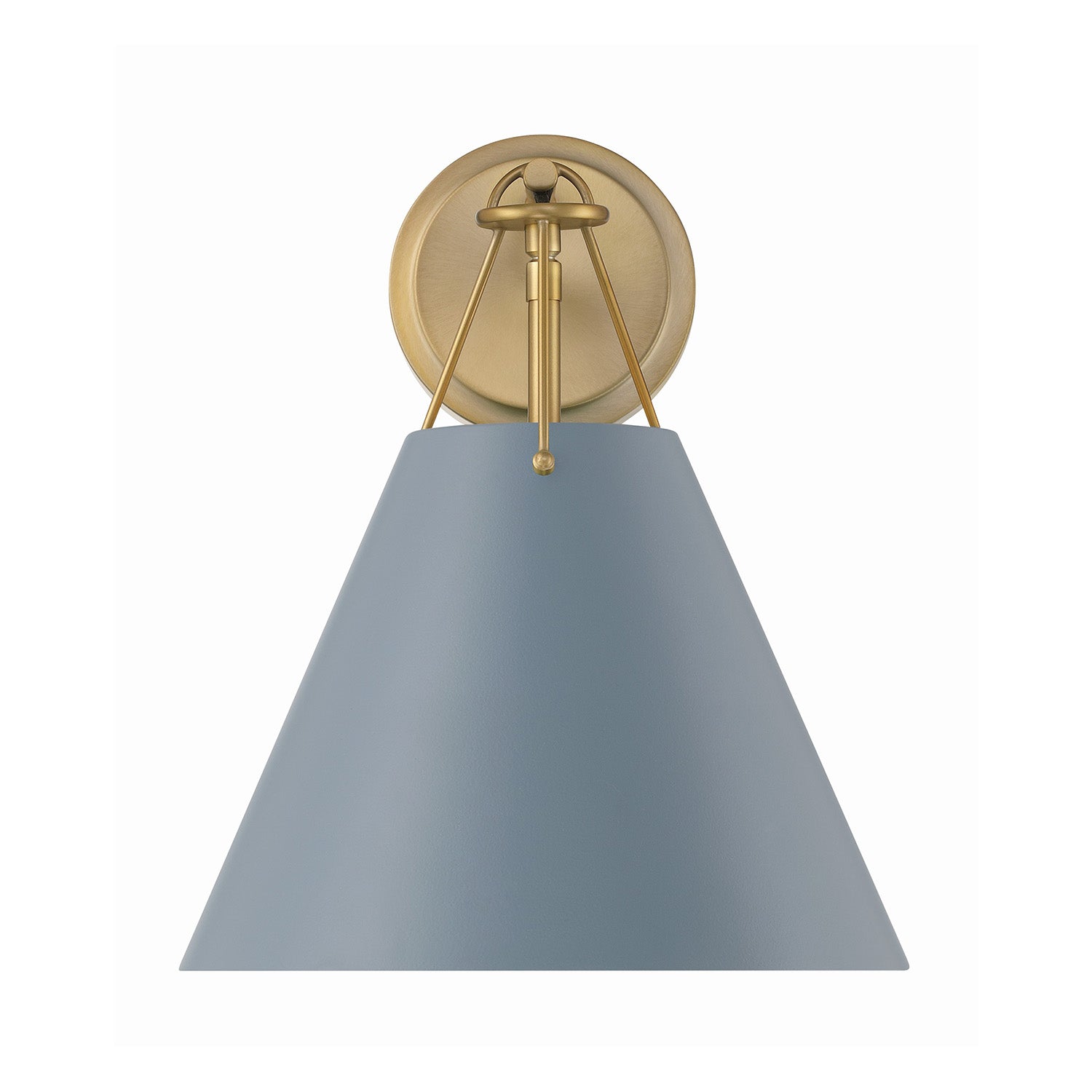 The Bowie Wall Sconce in French blue and brass brings a refined, architectural touch to your walls with its clean lines and modern design. The conical metal shade, featuring a French blue exterior and white interior, directs light downward for ideal task illumination, perfect for hallways, bedside reading, or highlighting entryways and mirrors. The aged brass accents add warmth and contrast, blending effortlessly into a range of interior styles. Damp-rated for use in bathrooms, this versatile sconce fits beautifully in bedrooms, living rooms, or foyers, offering both style and function for a variety of settings.