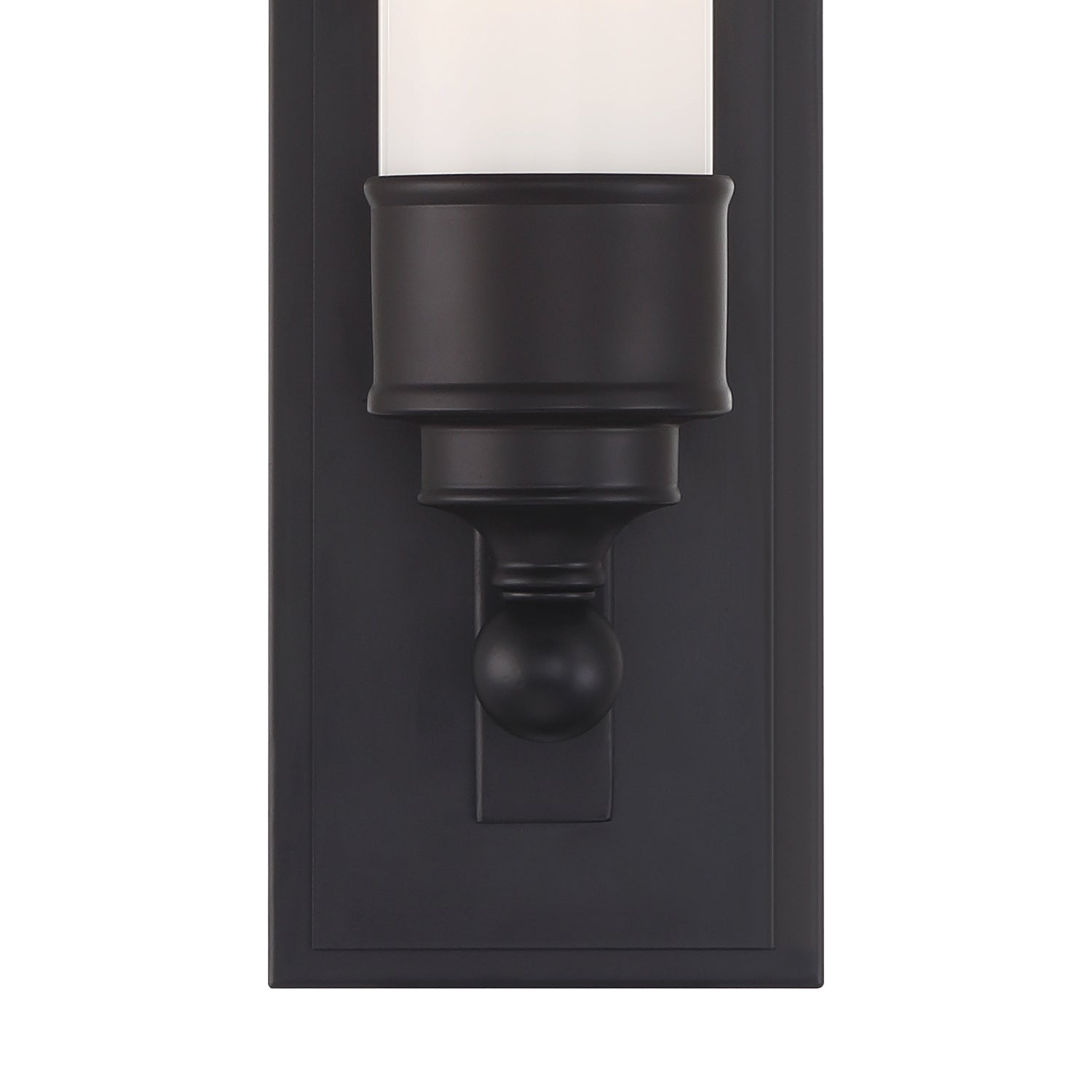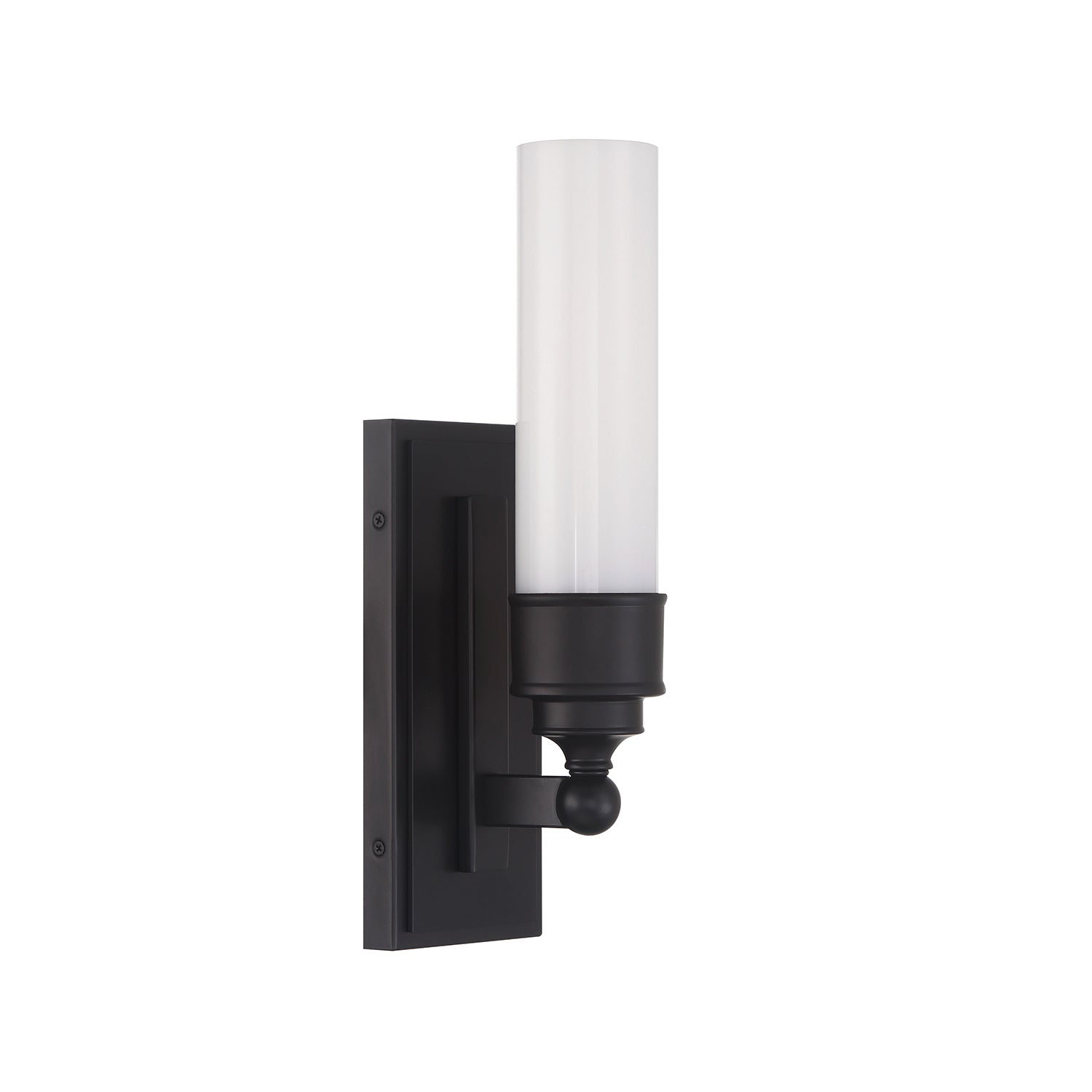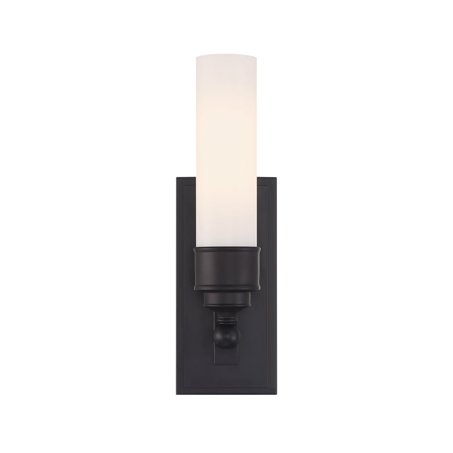 • Elegant wall sconce featuring a 10.25" opal glass cylinder with sleek matte black accents for a sophisticated, timeless look