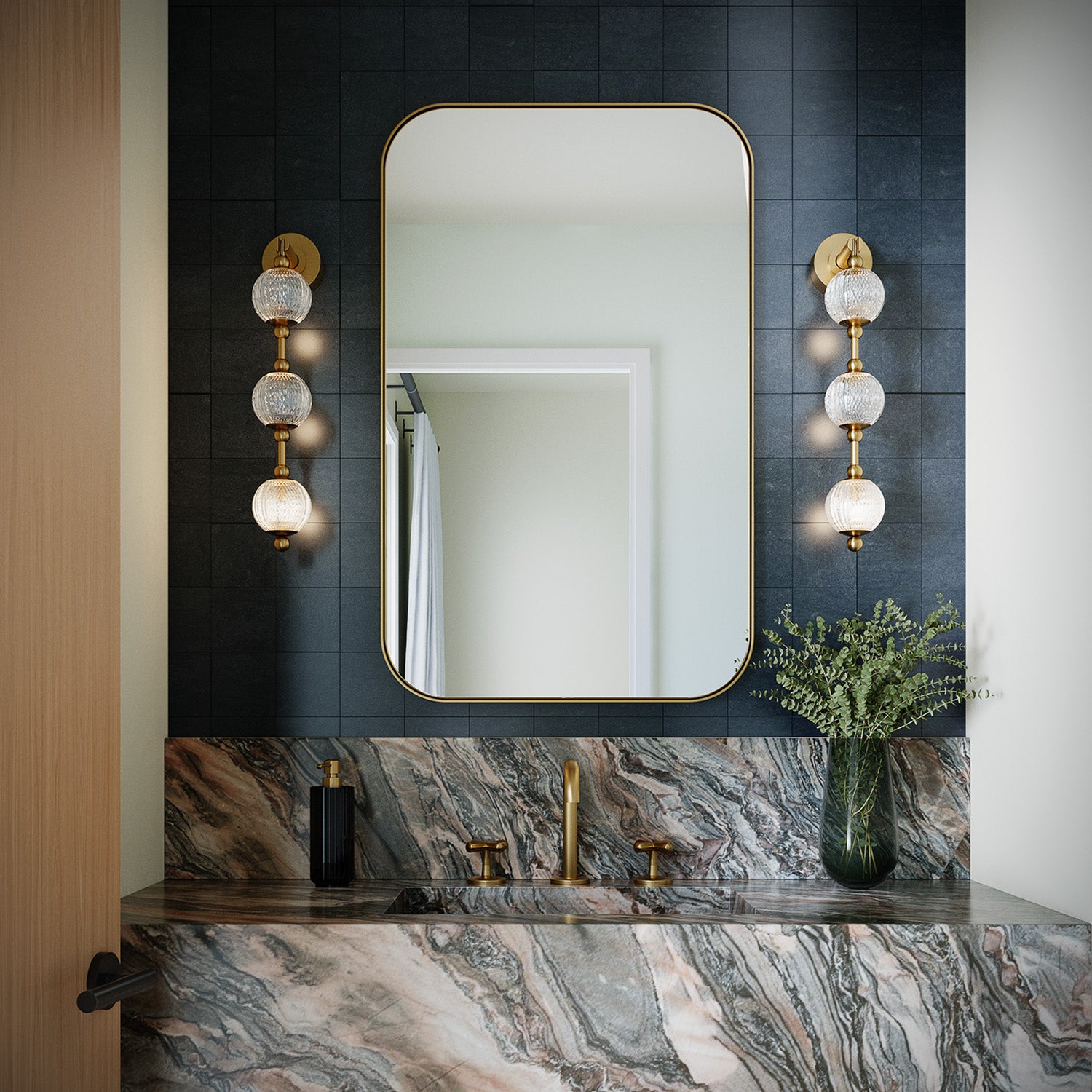 The Evelyn Wall Sconce brings a touch of refined glamour to any interior with its elegant vertical design. This sophisticated fixture features three intricately cut spherical shades that create mesmerizing light patterns when illuminated. Each crystal-clear globe contains integrated LED technology that radiates through the detailed texture, casting shimmering beams of light throughout the space. The warm, natural brass finish complements the three luminous globes, connected by a slender metal rod extending gracefully from a round backplate. At nearly 24 inches tall, this statement sconce creates a dramatic visual presence, perfect for enhancing hallways and dining areas, or as a distinctive accent beside mirrors and artwork.