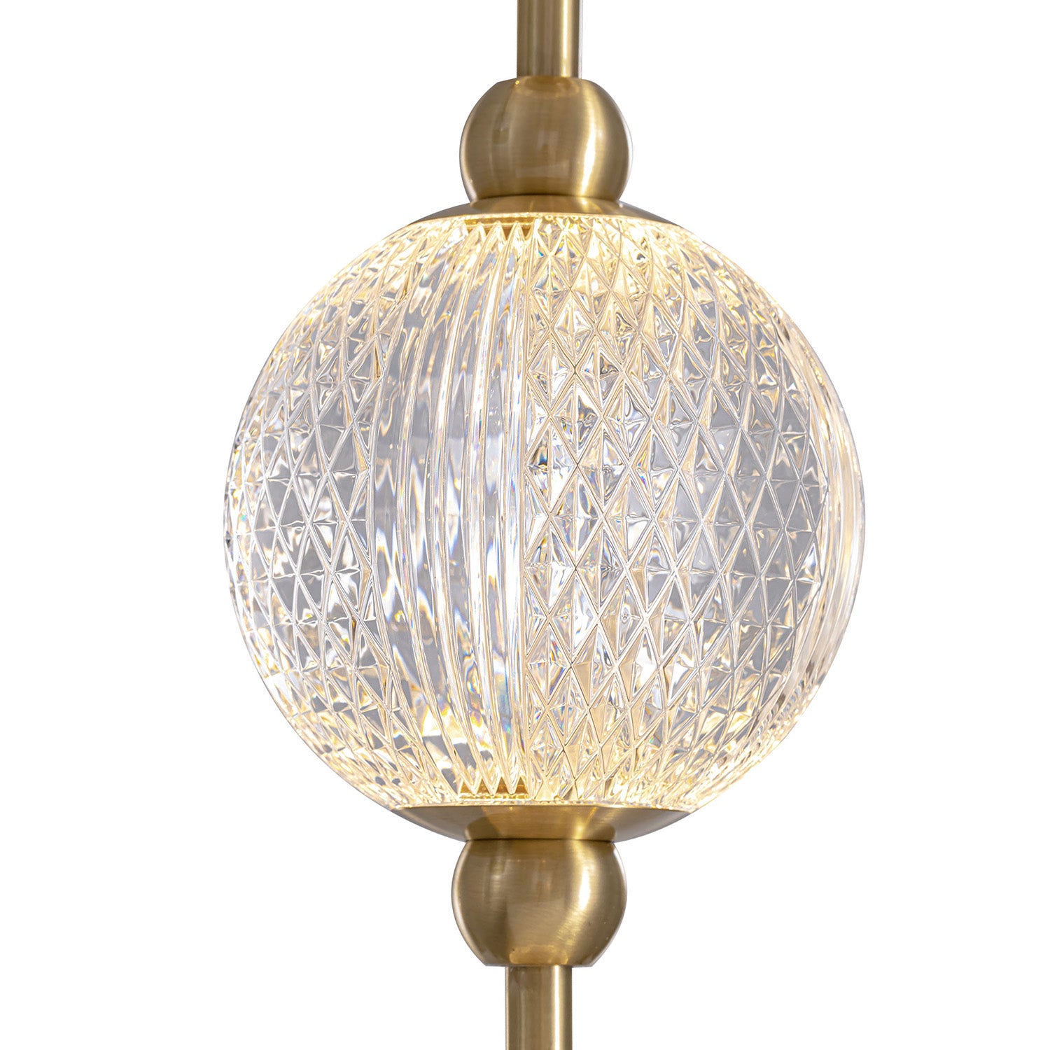 • Evelyn features three crystal clear, intricately cut spherical shades, suspended vertically from a round natural brass frame