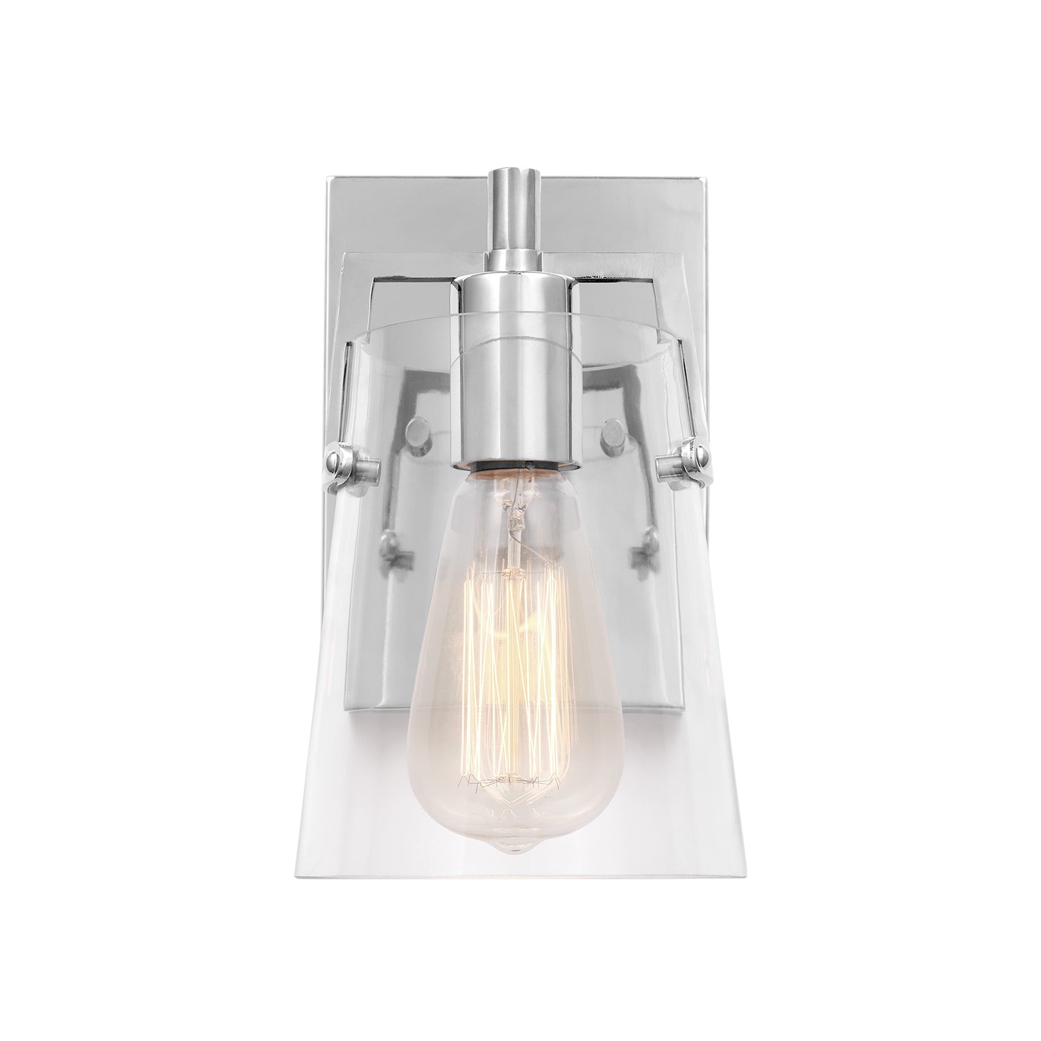 The Glyn Wall Sconce delivers a clean-lined silhouette with a clear glass shade, making an elegant statement with its modern simplicity. Its sleek, rectangular backplate and thoughtfully designed frame beautifully showcase an exposed bulb, providing a bright and refined glow. This fixture is a perfect lighting solution for any space, with the versatility to be mounted in either the up or down position. Its ETL damp rating makes it an ideal choice for a bathroom vanity, hallway, or entryway. The brilliant Chrome finish provides a sleek, reflective sheen that enhances the clean lines, adding both functional beauty and versatile appeal.