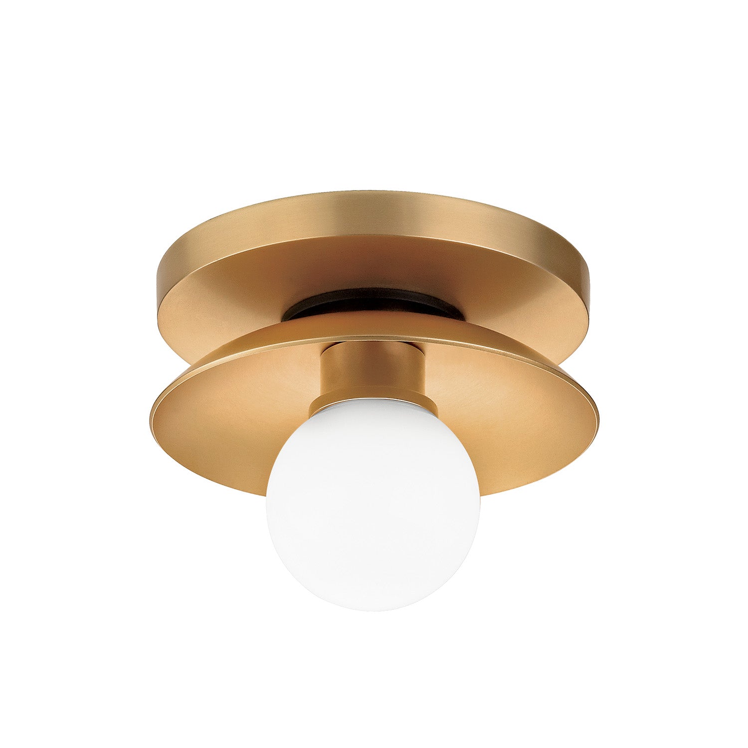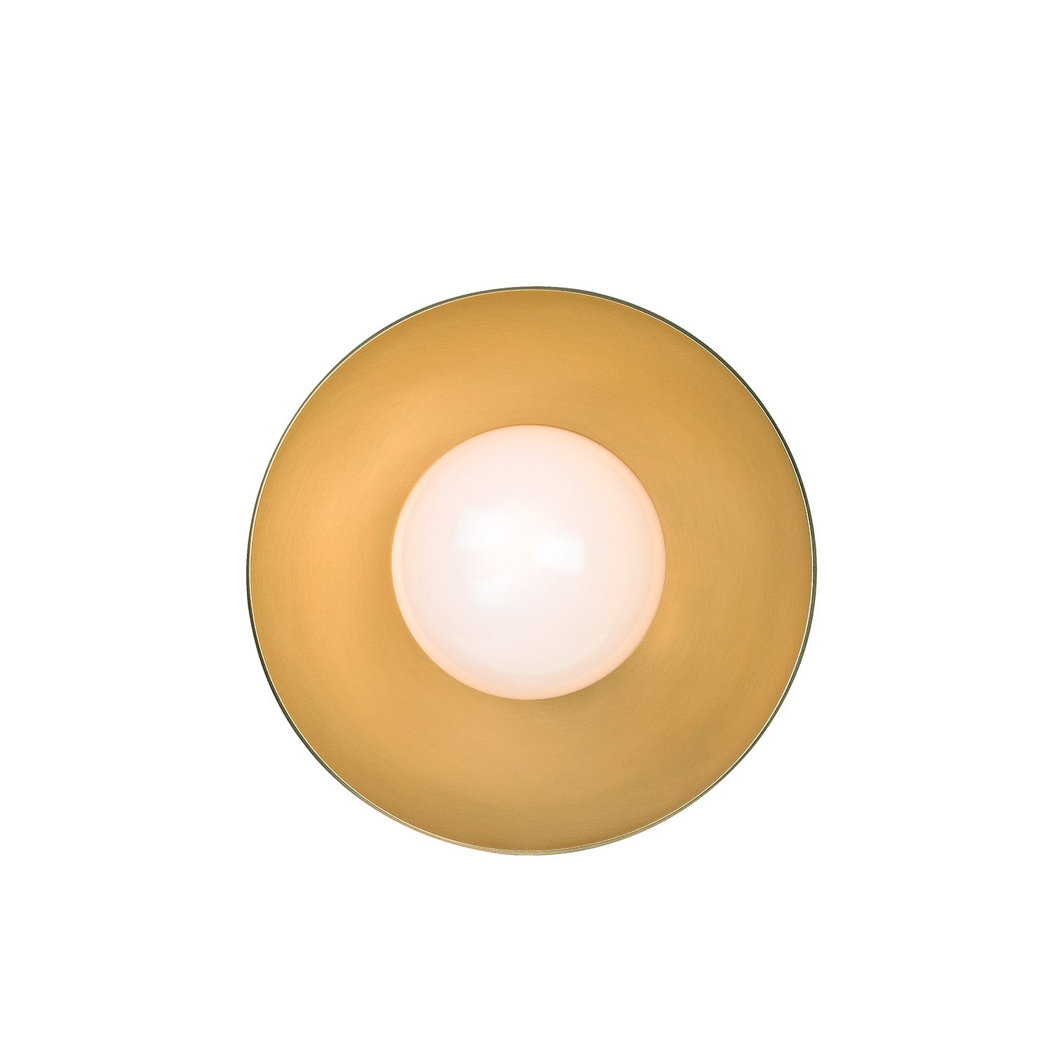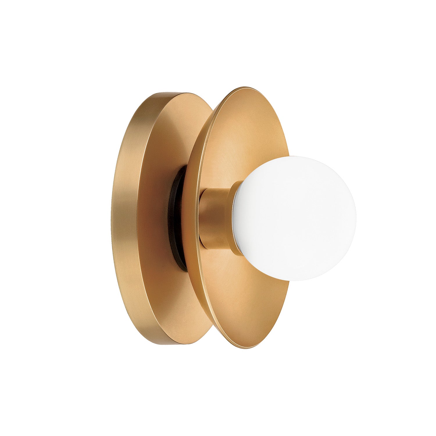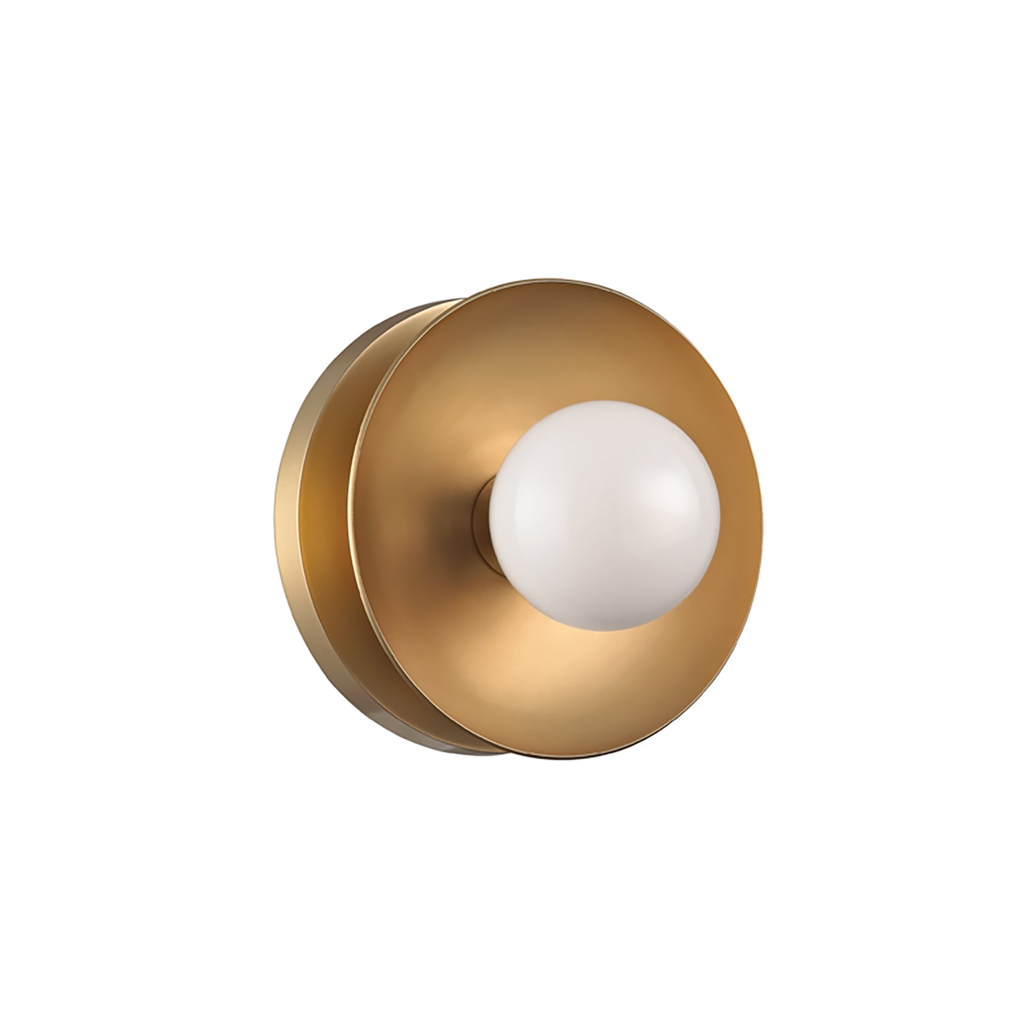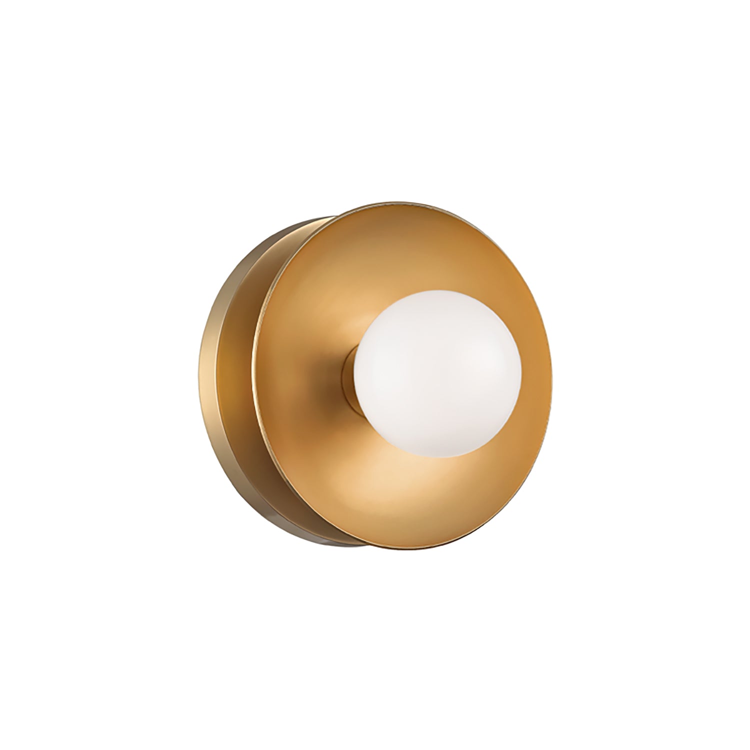 The Liam 1 Light Wall Sconce brings minimalist elegance to your home with its clean, sculptural design. Featuring a spherical opal matte glass globe nestled within a concave aged brass dish, this compact fixture creates a beautiful balance of light and form. The warm metallic backplate adds depth and visual interest while serving as a reflective surface that enhances the soft, ambient glow. The Liam sconce combines contemporary styling with timeless materials to create a versatile lighting solution that enhances your space with understated luxury.