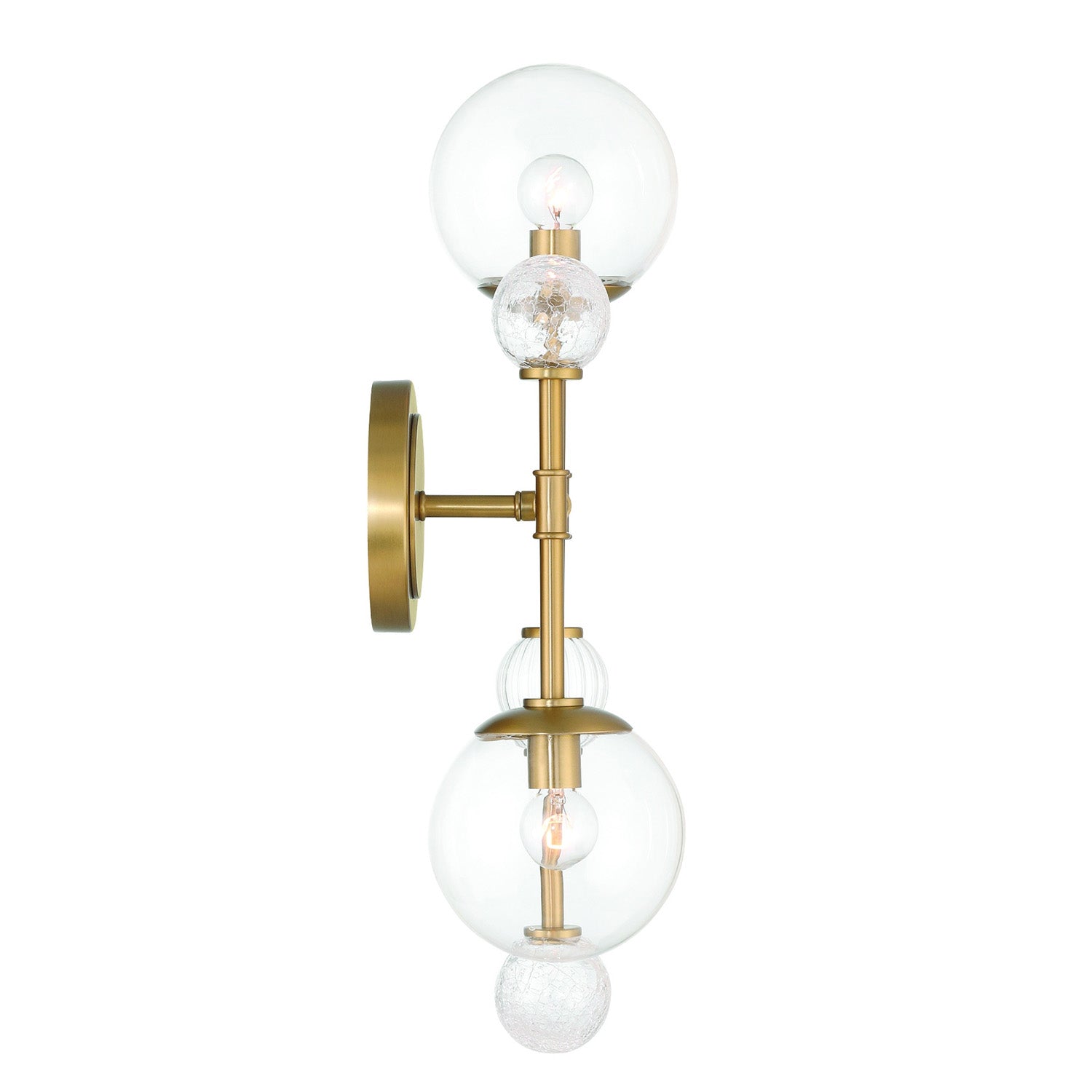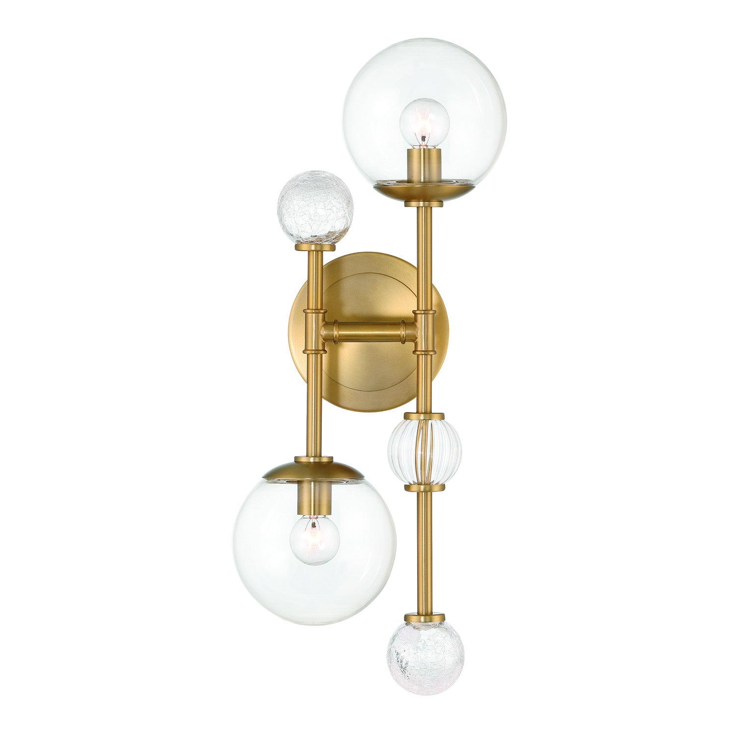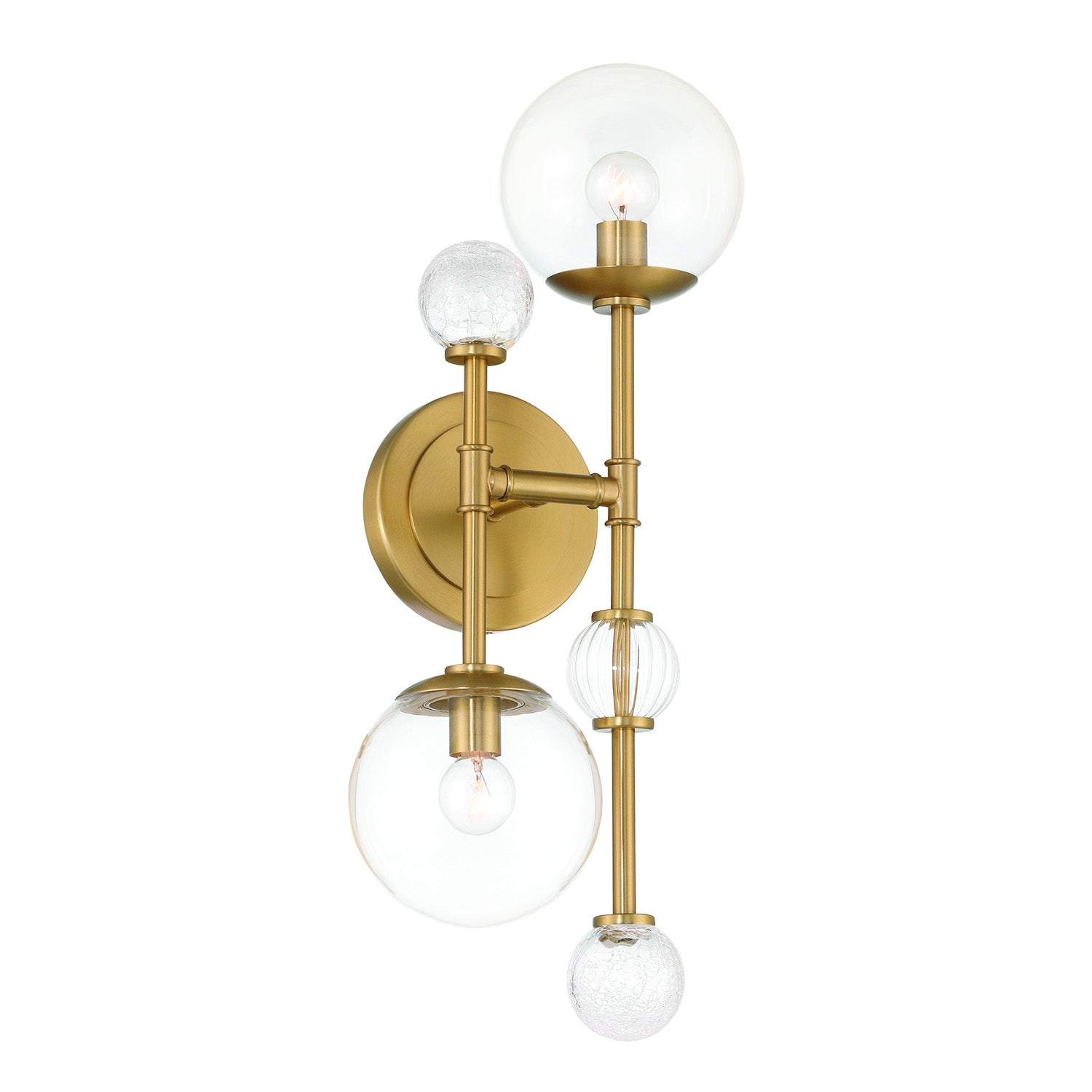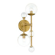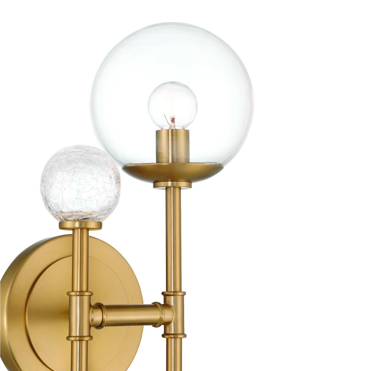The Lumi 2 Light Wall Sconce brings modern sophistication to any space with its clean geometric design and warm brass finish. This striking fixture features two perfectly proportioned clear glass globes mounted on sleek brass arms, showcasing decorative bulbs inside, while additional fluted and crackle glass spheres add a dramatic sculptural presence to hallways, bedrooms, and living areas. The contemporary silhouette provides elegant impact, while the clear glass spheres allow your choice of bulbs to become part of the design. At 20" in height with a generous 6" extension, this wall sconce makes a bold statement that combines modern shapes with timeless appeal for spaces that demand both style and personality.