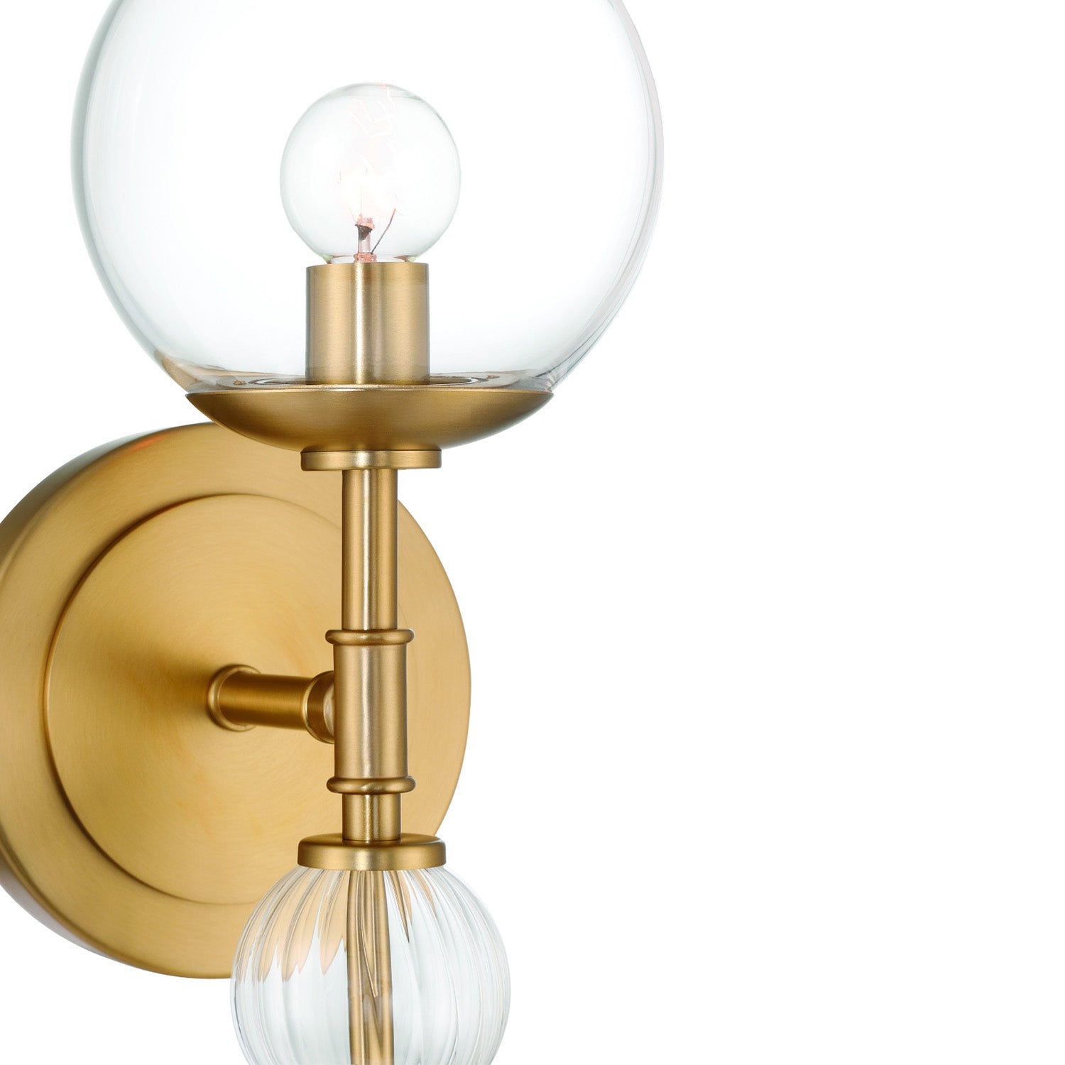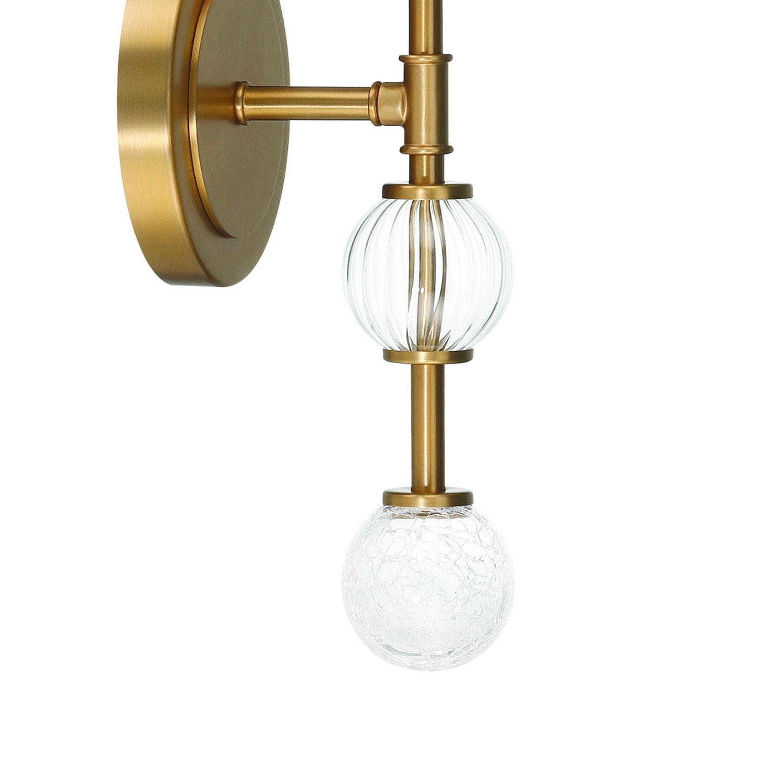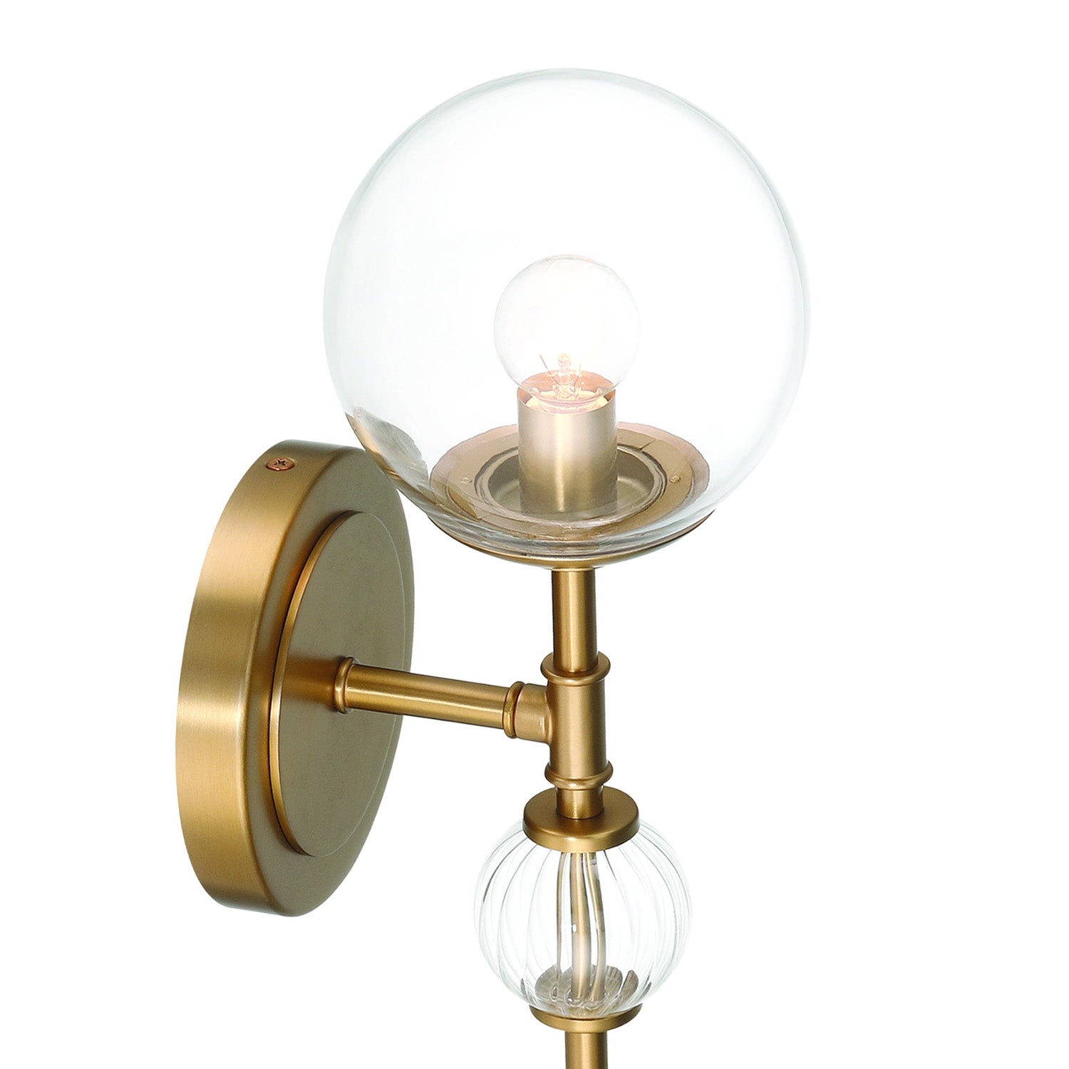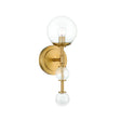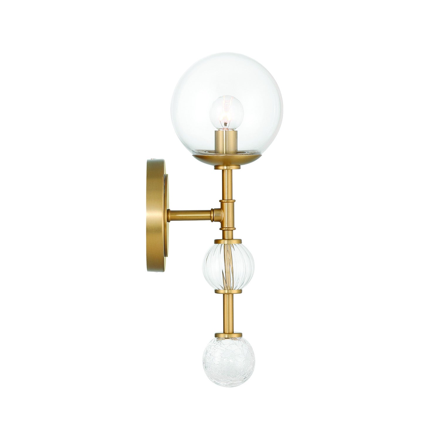 The Lumi Wall Sconce brings modern sophistication to any space with its clean geometric design and warm brass finish. This striking fixture features three textured glass globes mounted on a sleek brass arm, creating ambient lighting that showcases the beauty of the decorative bulb. Clear, fluted, and crackle glass accents add a sculptural presence to hallways, bedrooms, and living areas. The contemporary silhouette provides elegant simplicity, while the clear glass sphere allows your choice of bulb to become part of the design. At 15" in height with a generous 6" extension, this wall sconce makes a refined statement that combines modern shapes with timeless appeal for spaces that demand both style and personality.
