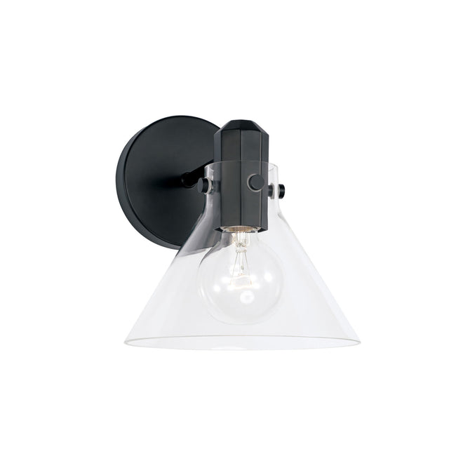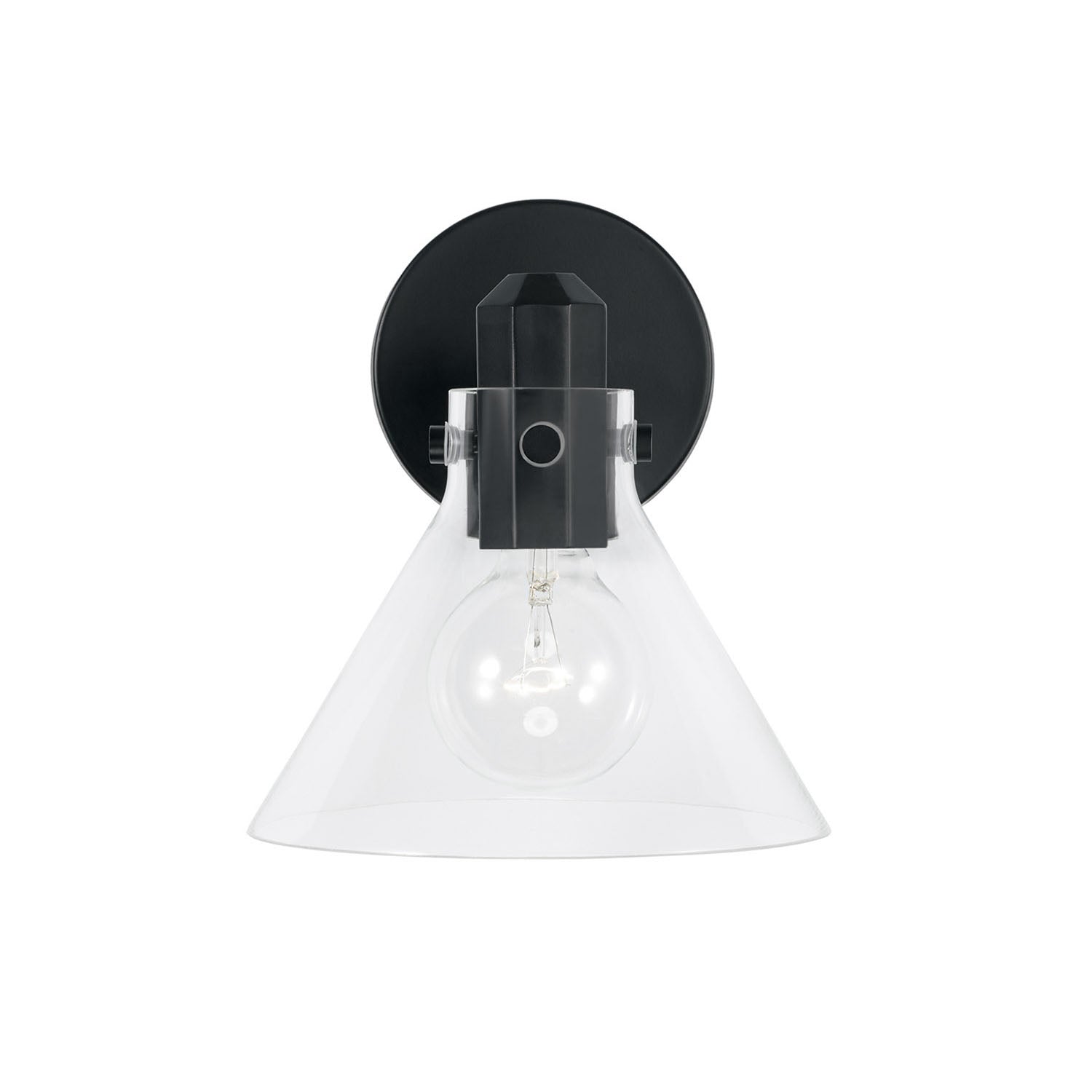 A modern take on midcentury style, the Nash Wall Sconce brings understated sophistication to any space with its clean, minimalist design. This thoughtfully crafted fixture features a sleek round matte black backplate, faceted socket, and a clear glass shade that provides beautiful ambient lighting while showcasing the bulb within. The simple yet elegant silhouette creates striking illumination that works beautifully as a single piece or in multiples for dramatic effect, perfect for hallways, bedrooms, or living spaces where refined design meets functional lighting.