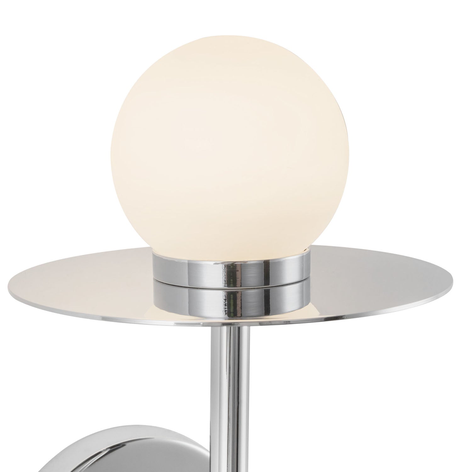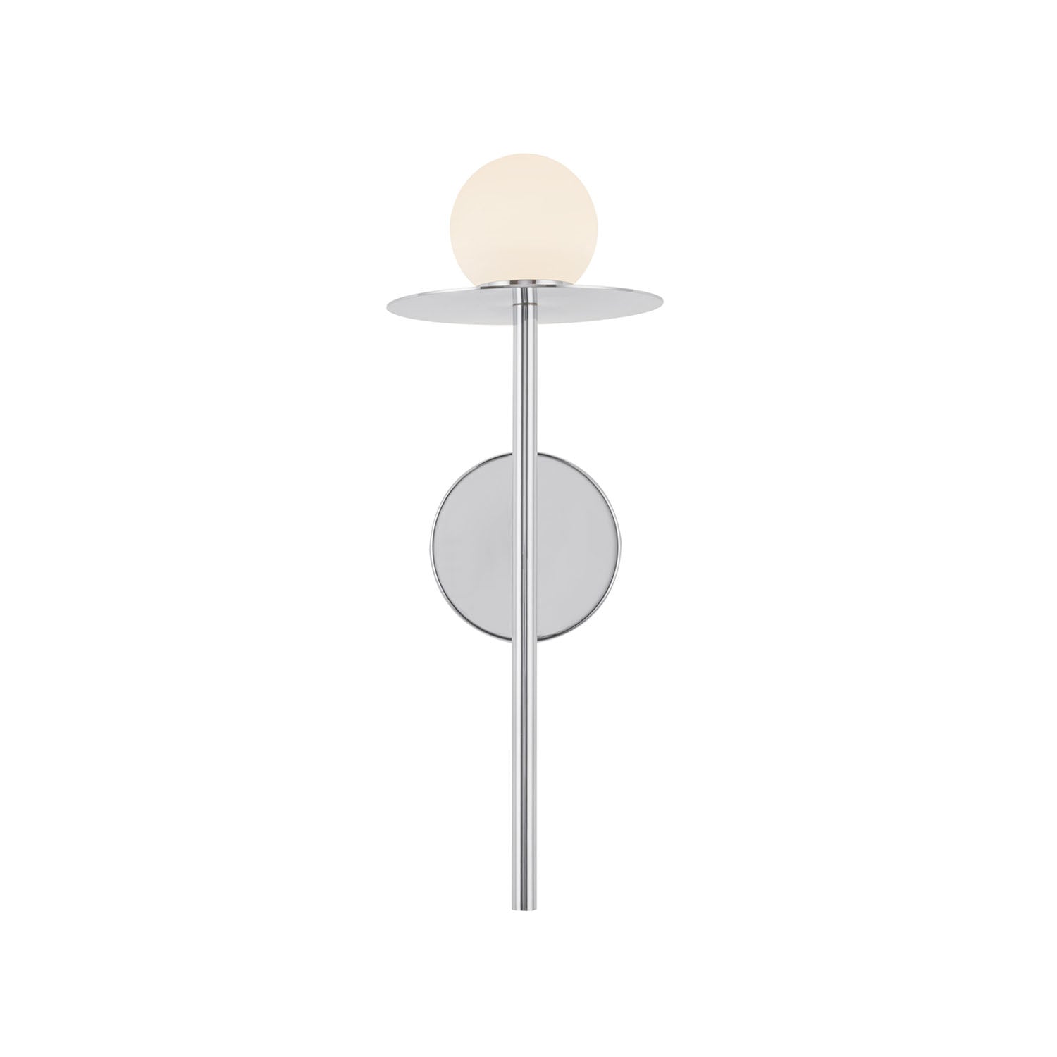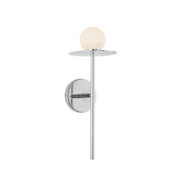 - The Sol LED Wall Sconce features a layered design with chrome tube, disk, and opal glass globe with integrated 7W LED technology