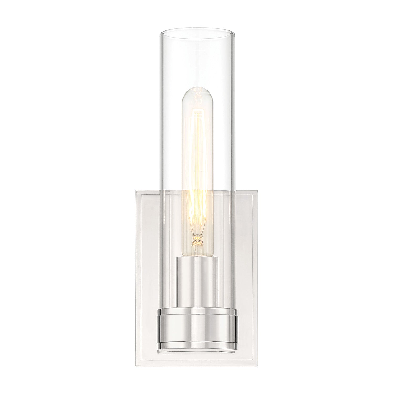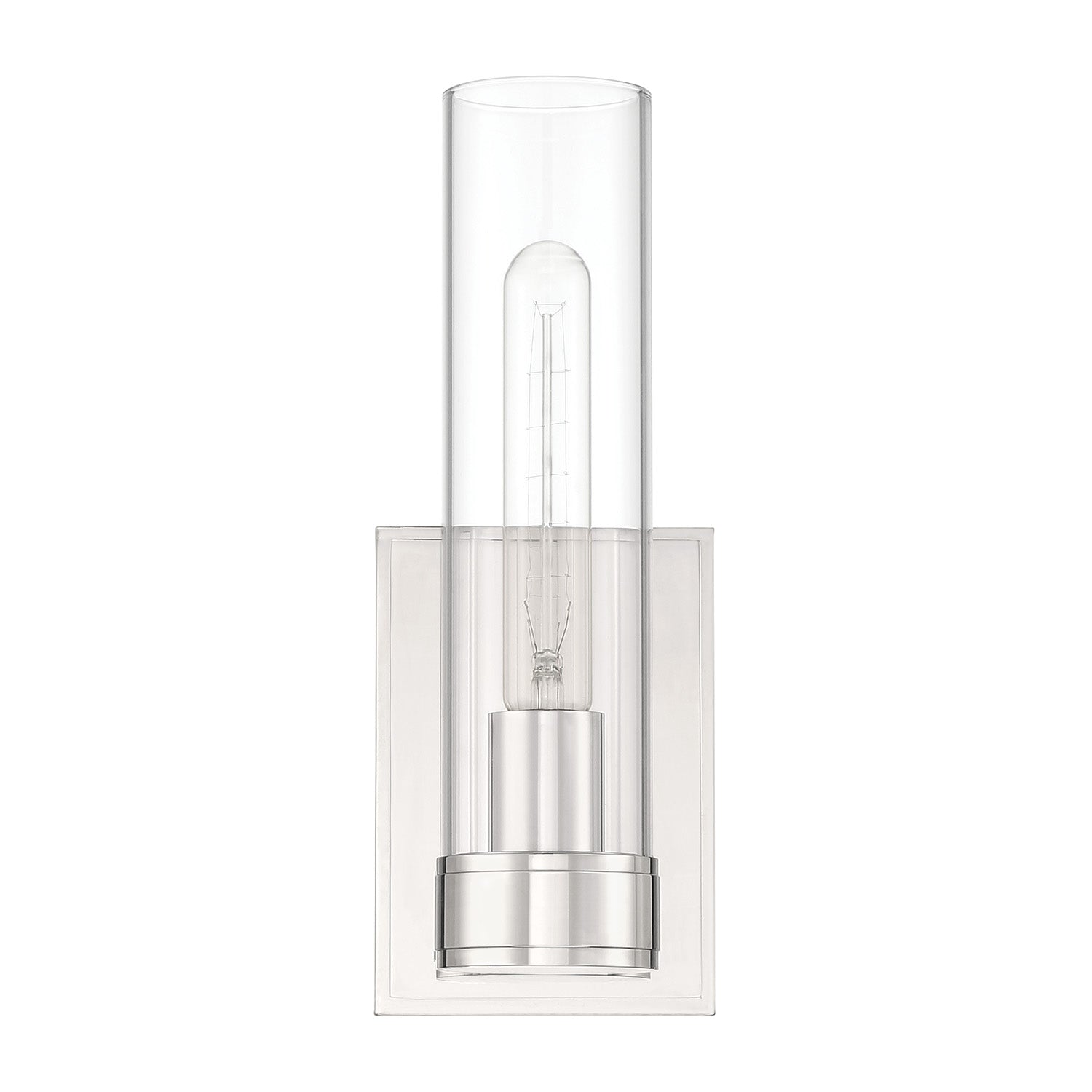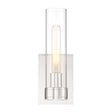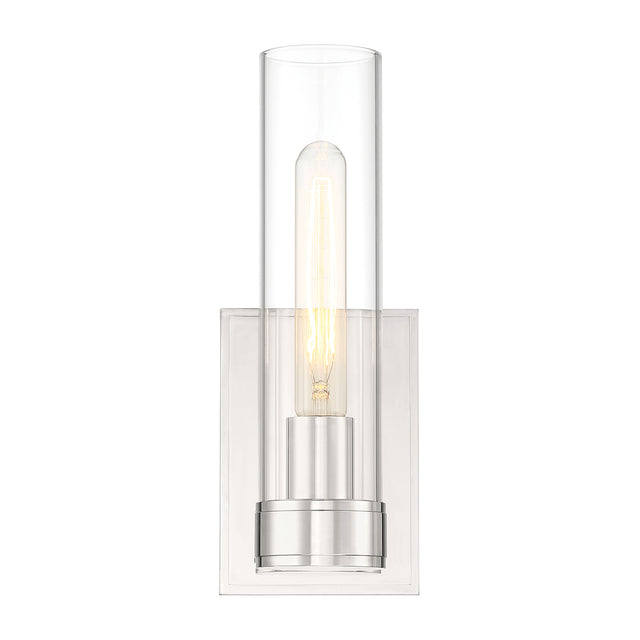 The Sutton 1-Light Wall Sconce embodies a sophisticated and classic design. This stately 12" tall wall light pairs an elegant cylindrical, clear glass shade, showcasing a single bulb, with an equally stylish frame. The brilliant polished nickel finish enhances the contemporary aesthetic of the rectangular backplate and round base. When used in pairs, the Sutton Wall Sconce elevates the design of a bathroom, bedroom, or living room. To complete your project, the Sutton Wall light is also available in a larger two-light vanity.