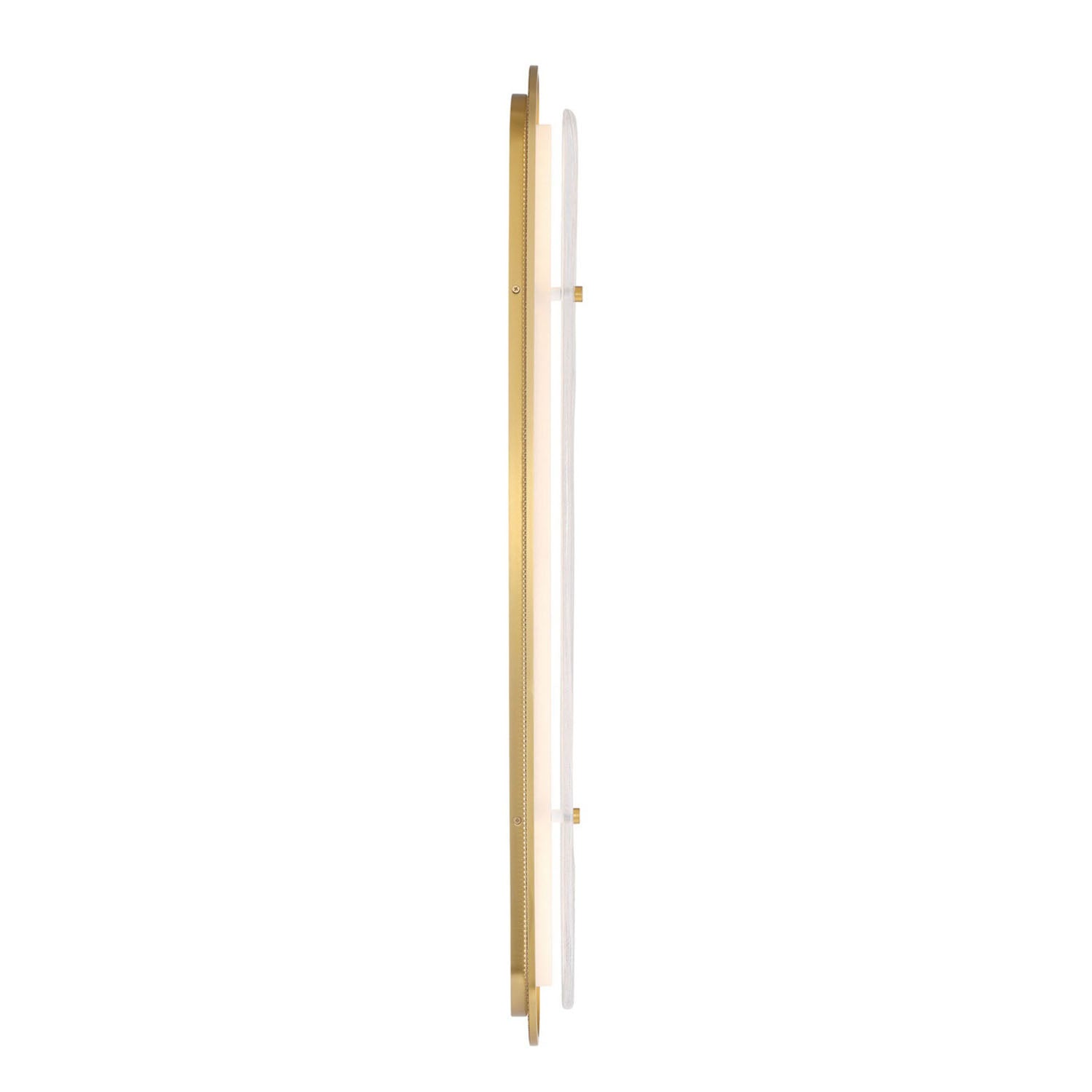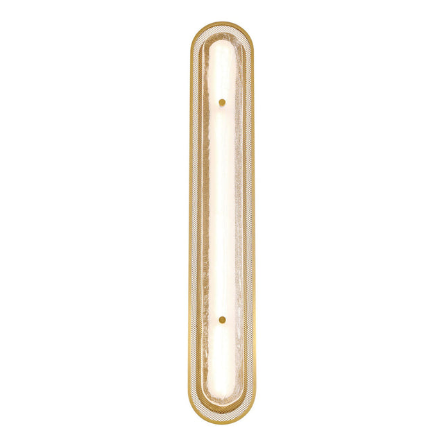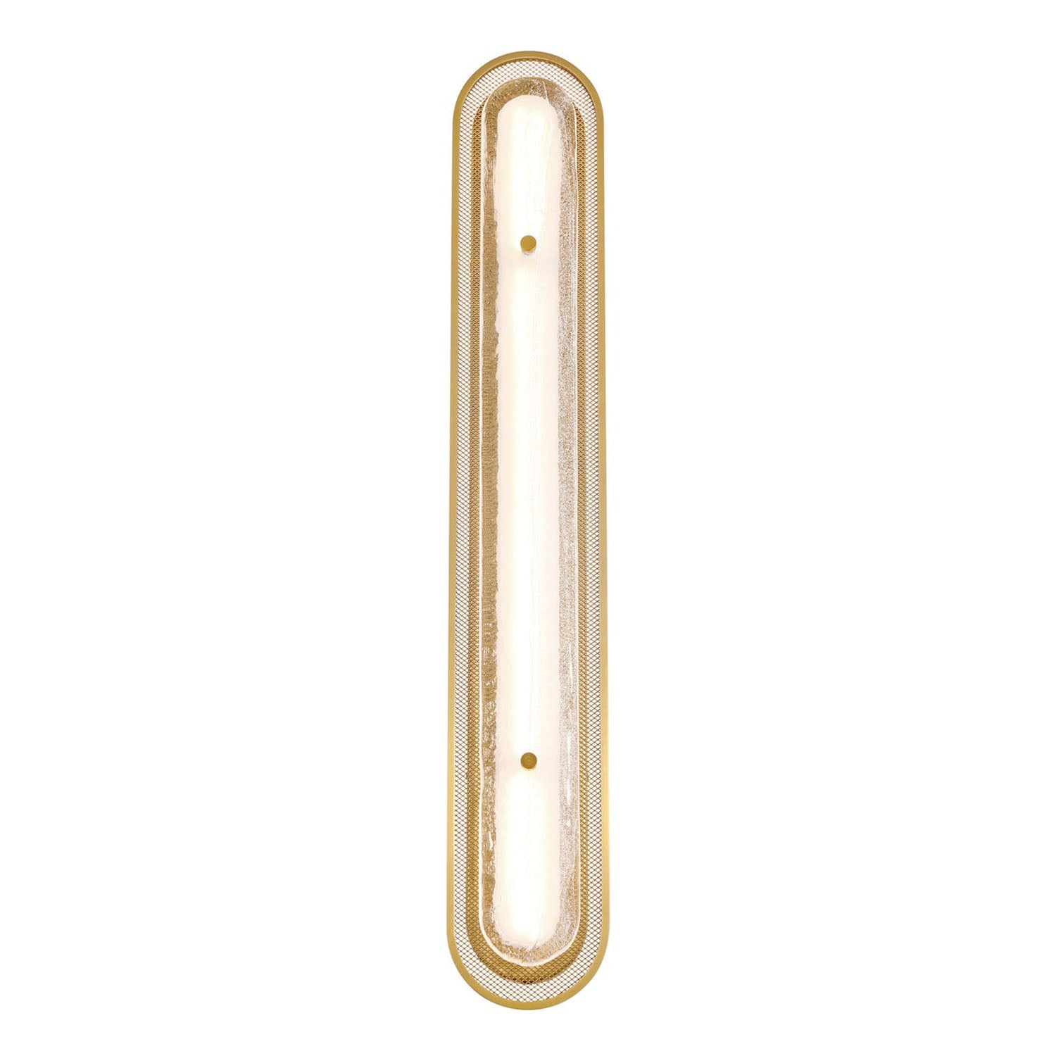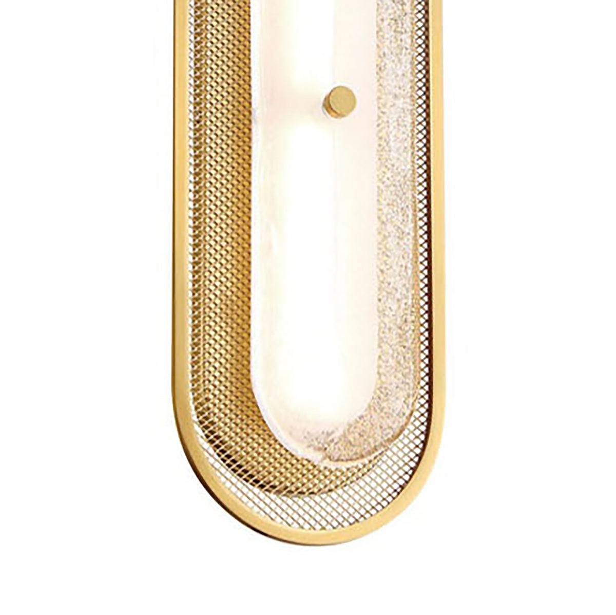 The Vance LED Wall Sconce transforms ordinary walls into illuminated art with its distinctive elongated oval form and warm brass detailing. This elegant fixture showcases a textured glass center that creates mesmerizing light patterns when illuminated, while the surrounding metal mesh brass frame casts a beautiful halo effect that makes the entire piece appear to float effortlessly against the wall. The harmonious blend between the textured glass and brass elements seamlessly merges vintage glamour with contemporary sophistication. At 38" long with ADA-compliant design, this sconce delivers both striking appeal and exceptional practical illumination for contemporary interiors.