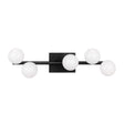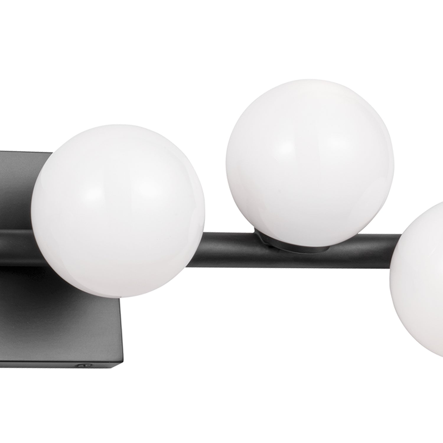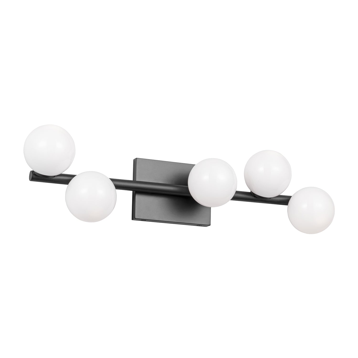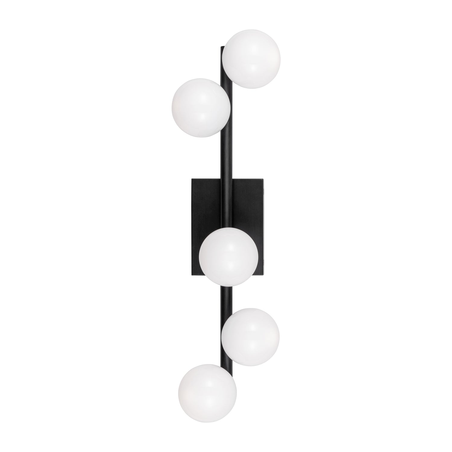 The Veya 5 Light Wall Sconce combines simple metal structures with elegant milk glass globes that draw inspiration from floating bubbles, creating airy elegance with refined contemporary appeal. This elegant 24" linear wall sconce features five coordinated milk glass globes positioned along a clean horizontal framework, showcasing minimalist structures that create a refined statement, perfect for hallways, bedrooms, bathrooms, living spaces, and areas seeking substantial wall lighting with artistic character. The aged iron framework creates sophisticated depth against the streamlined design, while the milk glass globes enhance the organic charm. With its damp-rated construction and generous linear proportions, this expertly crafted wall sconce elevates any space with contemporary style and reliable performance.