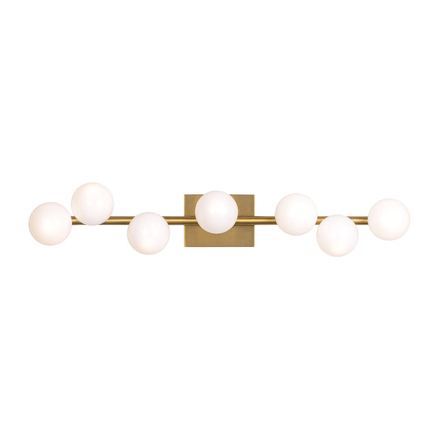 The Veya 7 Light Wall Sconce combines simple metal structures with elegant milk glass globes that draw inspiration from floating bubbles, creating airy elegance with refined contemporary appeal. This elegant 32" linear wall sconce features seven coordinated milk glass globes positioned along a clean horizontal framework, showcasing minimalist structures that create a refined statement, perfect for hallways, bedrooms, bathrooms, living spaces, and areas seeking dramatic wall lighting with artistic elegance. The modern brass framework brings warm metallic sophistication to the streamlined design, while the milk glass globes enhance the organic charm. With its damp-rated construction and expansive linear proportions, this expertly crafted wall sconce elevates any space with contemporary style and reliable performance.