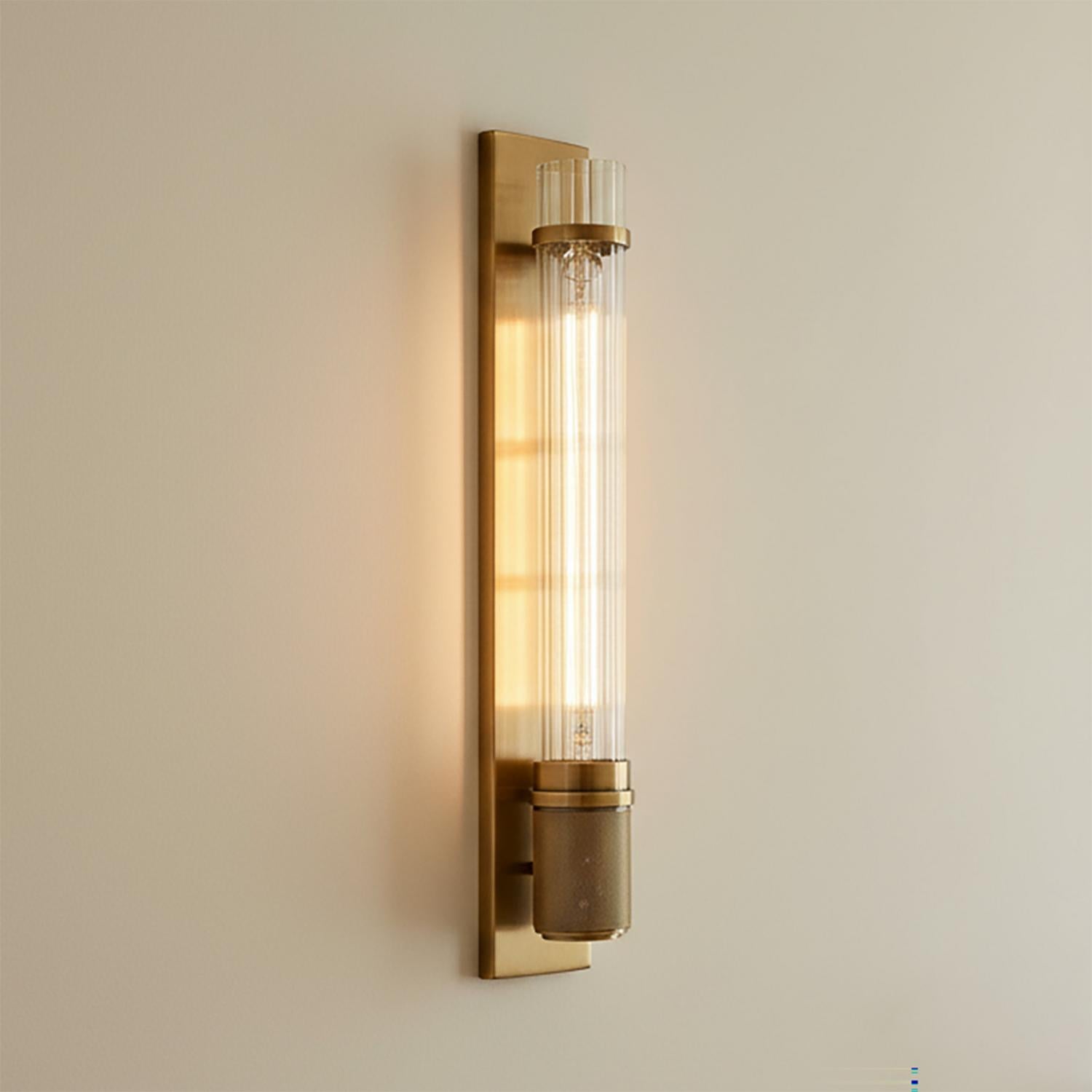 The Zeke Wall Sconce combines industrial elegance with Art Deco influences for a sophisticated lighting statement. This striking fixture features a slender reeded glass cylinder that creates beautiful light refraction patterns while providing ambient illumination. The textured glass is beautifully complemented by aged brass accents, including a knurled metal socket housing that adds refined detail and tactile interest. Mounted on a sleek rectangular backplate, this vertical sconce brings architectural presence to any wall. Standing at 15.5 inches tall with a slim profile, the Zeke makes a dramatic statement in hallways, bathrooms, or flanking mirrors and artwork, offering the perfect blend of vintage inspiration and contemporary design.