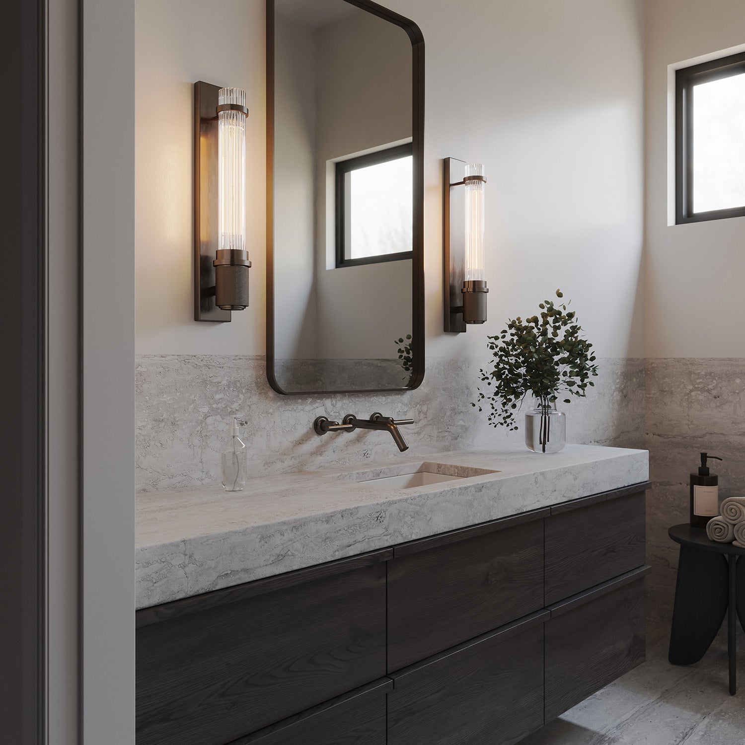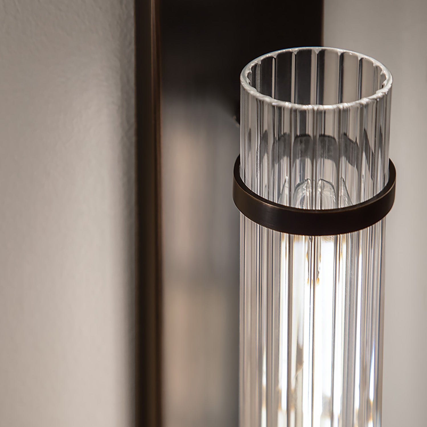 The Zeke Wall Sconce combines industrial elegance with Art Deco influences for a sophisticated lighting statement. This striking fixture features a slender reeded glass cylinder that creates beautiful light refraction patterns while providing ambient illumination. The textured glass is beautifully complemented by old bronze accents, including a knurled metal socket housing that adds refined detail and tactile interest. Mounted on a sleek rectangular backplate, this vertical sconce brings architectural presence to any wall. Standing at 15.5 inches tall with a slim profile, the Zeke makes a dramatic statement in hallways, bathrooms, or flanking mirrors and artwork, offering the perfect blend of vintage inspiration and contemporary design.