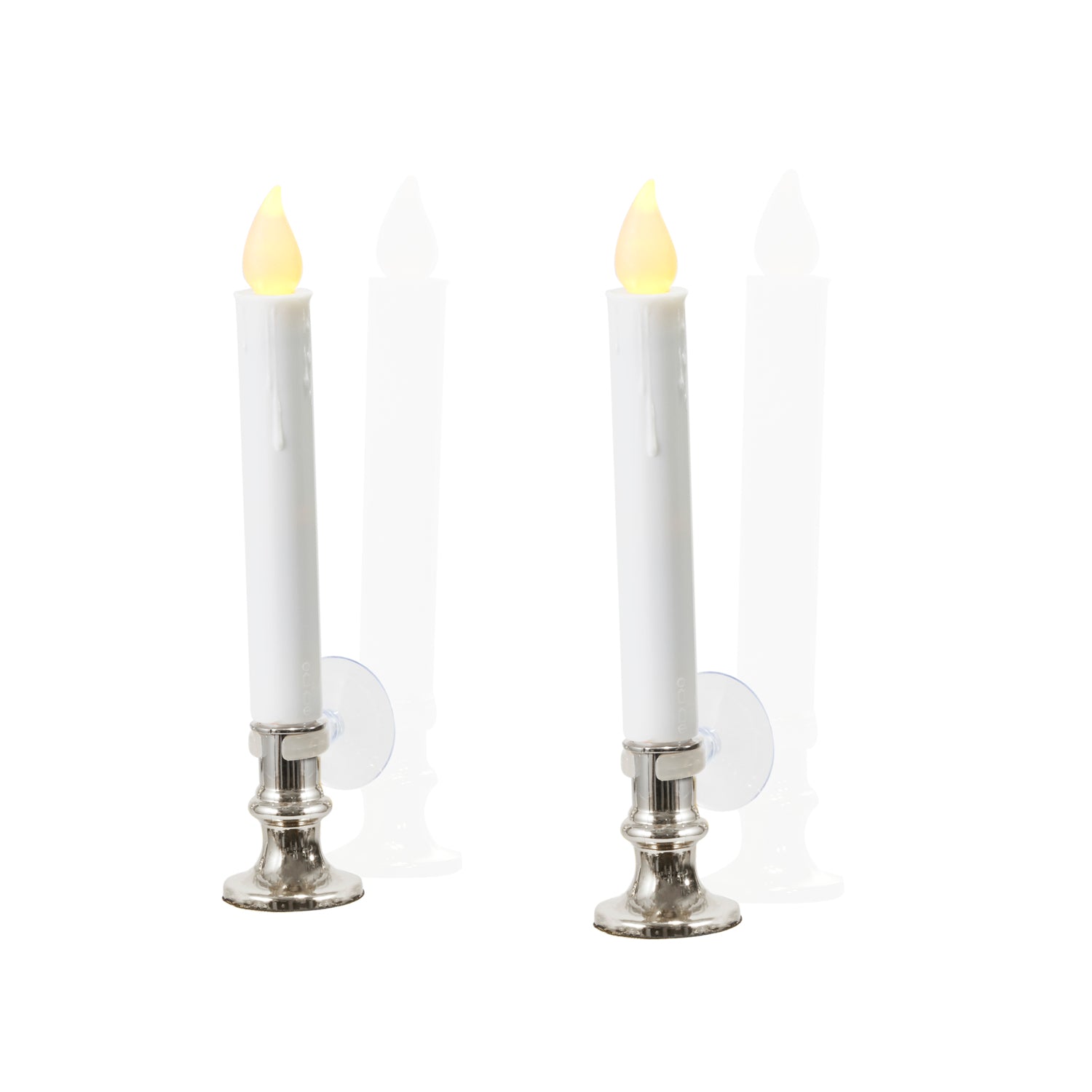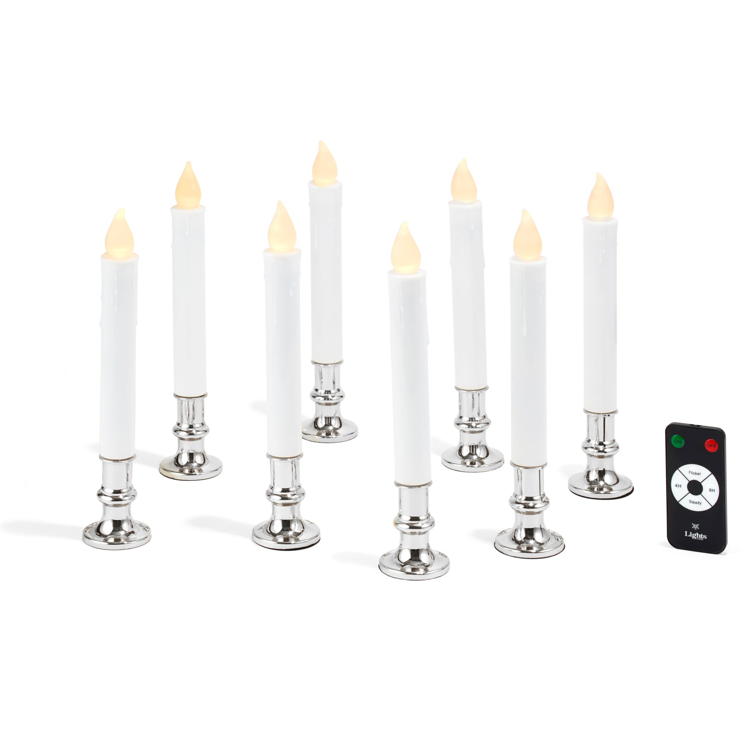 With their life-like drip effect, classic, removable silver bases, and inviting glow, this set of eight flameless taper candles will add festive ambiance to any holiday display or window sill without the mess of wax drippings or worry of open flame. Each taper activates with the simple switch at the bottom and remains on for five hours. Includes a remote for ambiance modification at a distance. Perfect for home, weddings, churches, restaurants, and events.