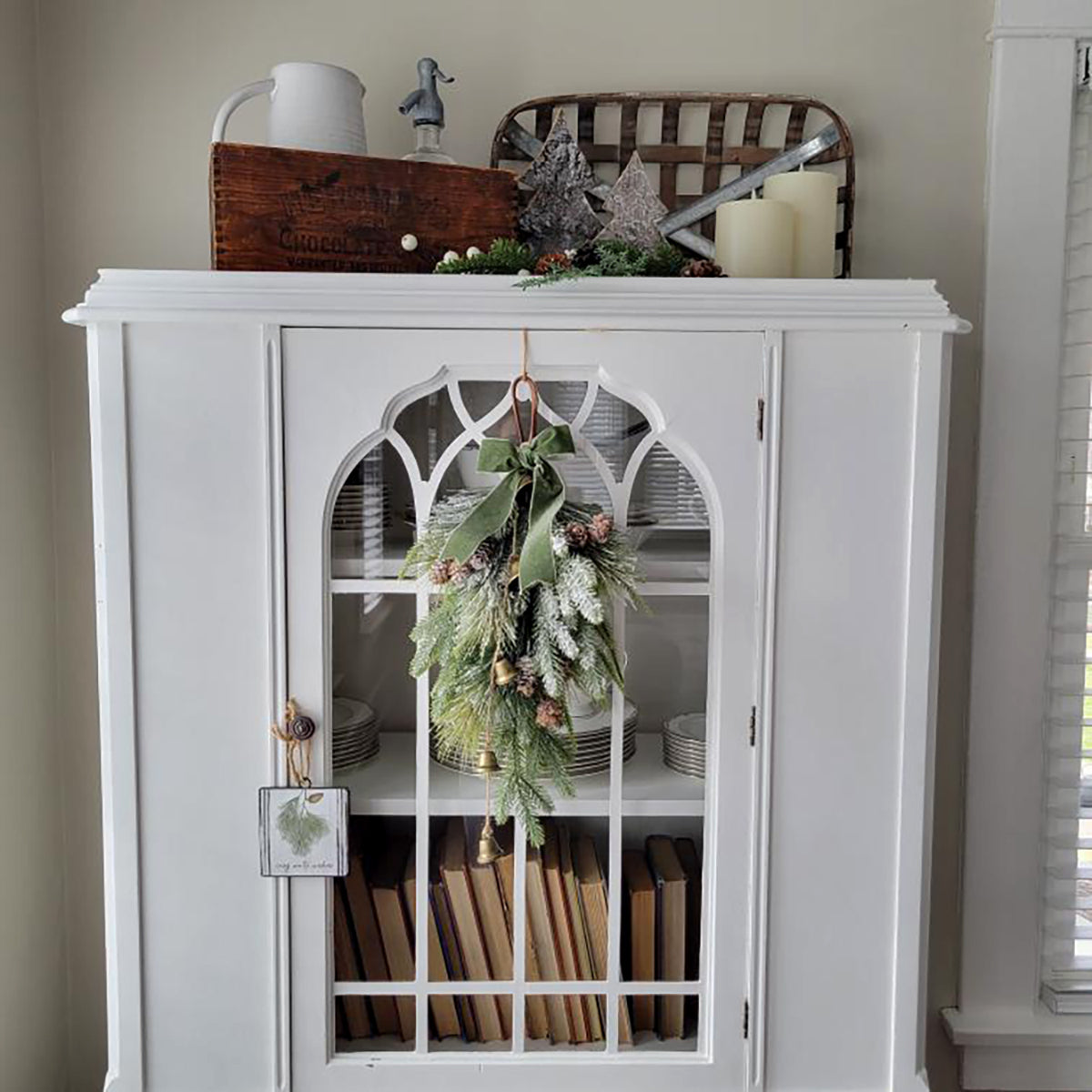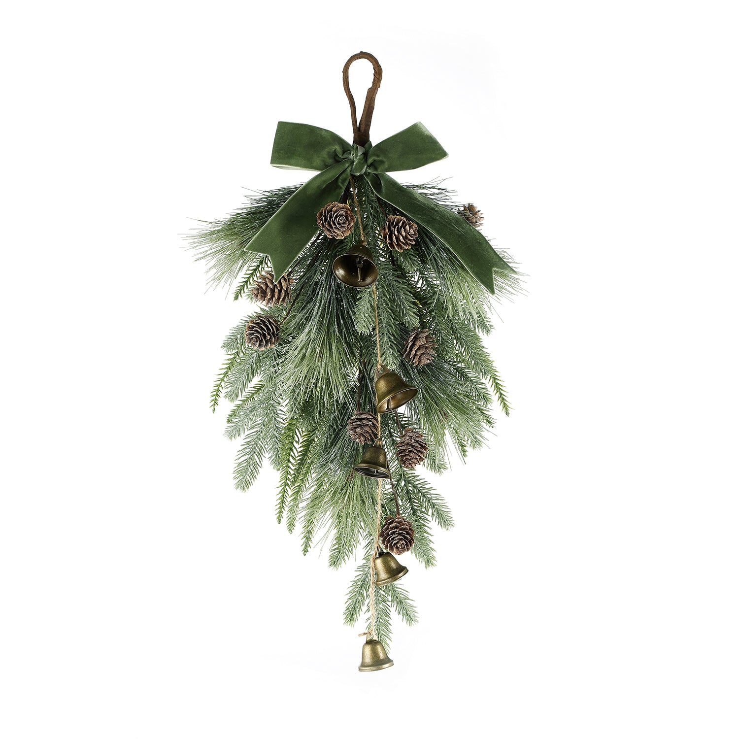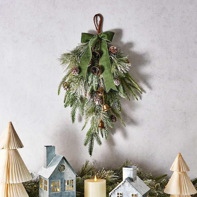 • One swag comprised of realistic faux pine and spruce, real mini pinecones, and brass bells, topped with a dark green velvet bow