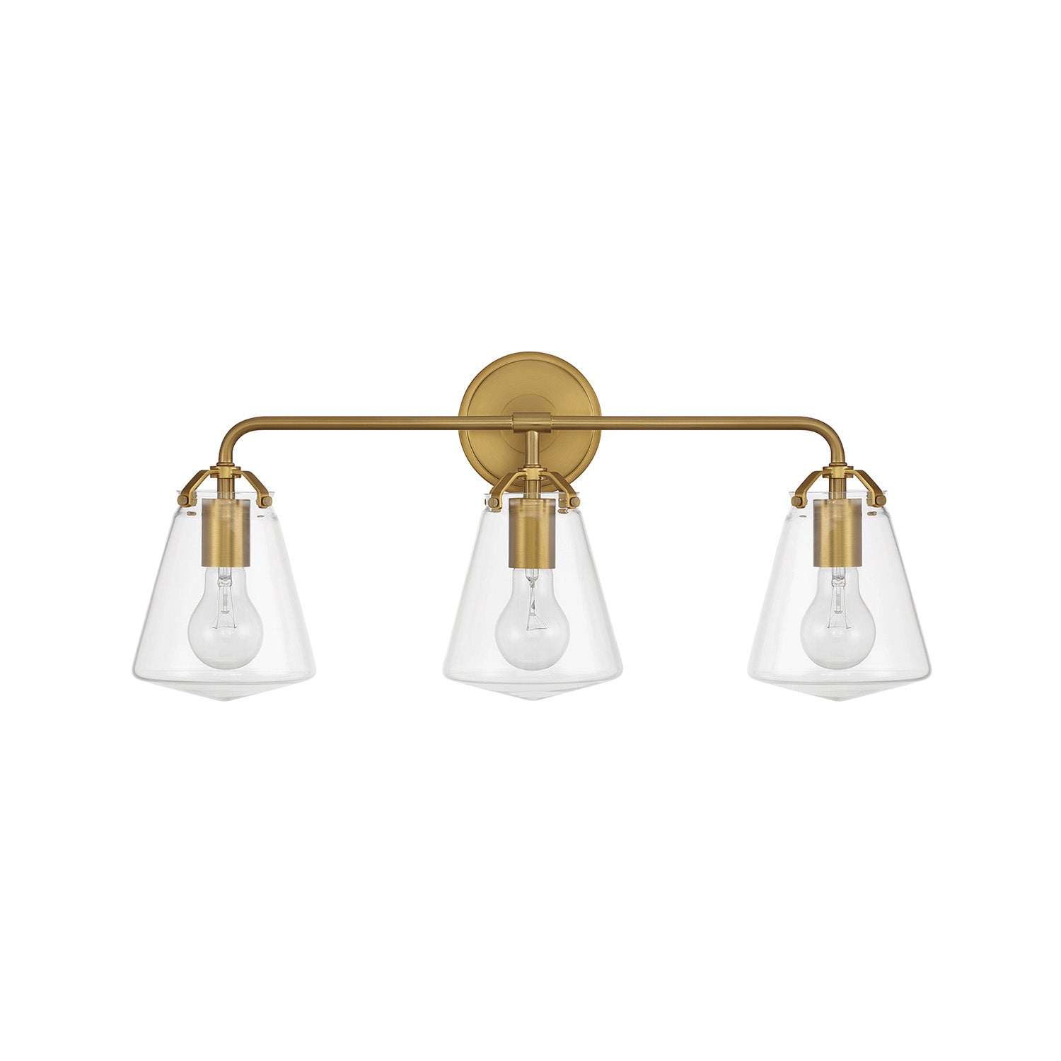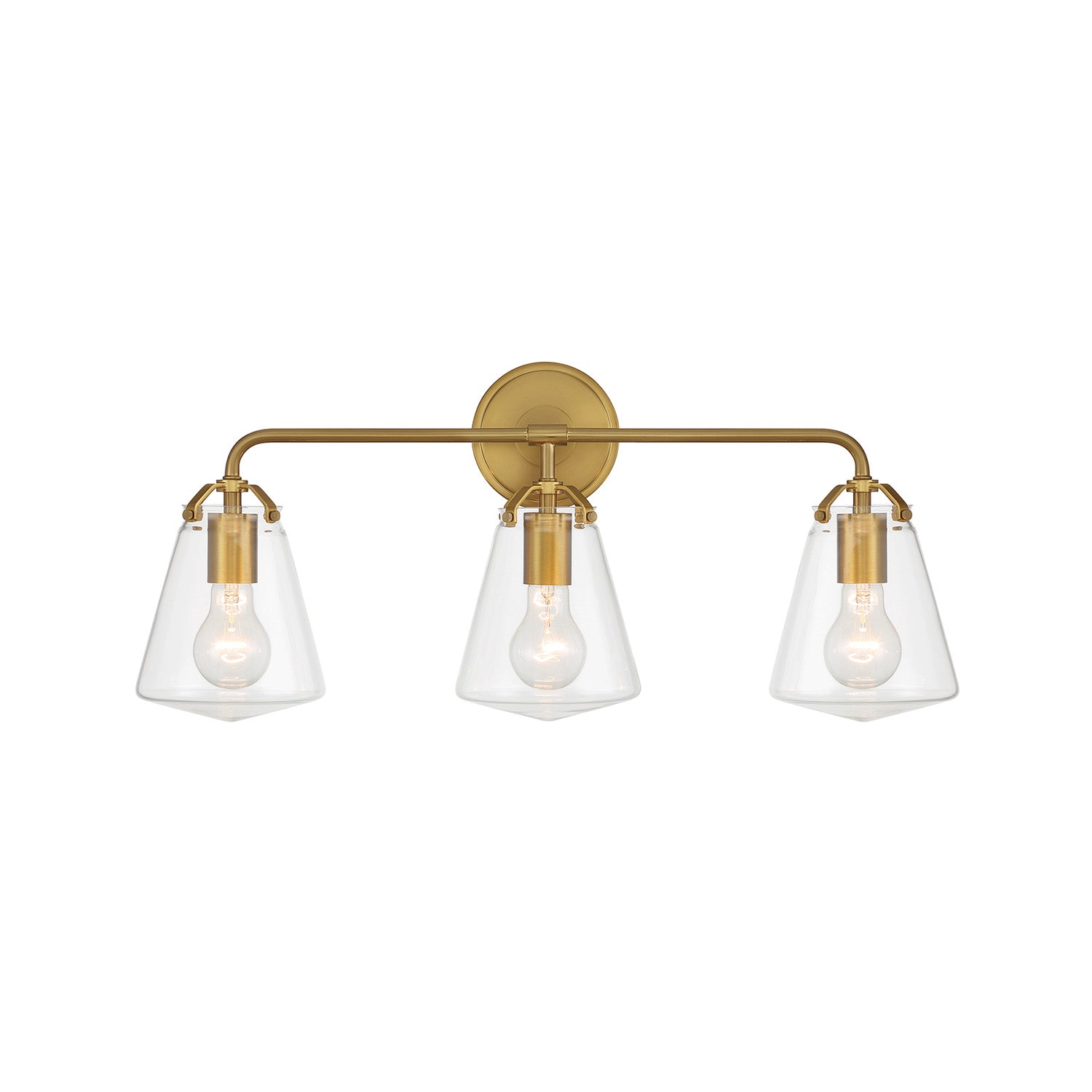 The Addison 3 Light Vanity Light brings timeless sophistication to bathrooms and vanity areas with its clean, architectural design. Featuring three tapered clear glass shades that showcase the bulbs within, this 25" fixture creates both focused task lighting and ambient illumination. The warm brass backplate and fixture hardware add a luxurious touch that complements both modern and traditional interiors. The Addison vanity light combines classic materials with contemporary sensibility to create a versatile lighting solution that enhances your space with refined elegance.