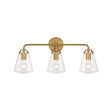 • Elegant vanity light featuring three tapered clear glass shades with warm brass accents for a sophisticated, timeless look