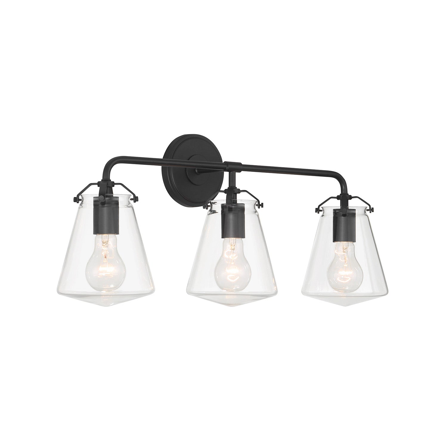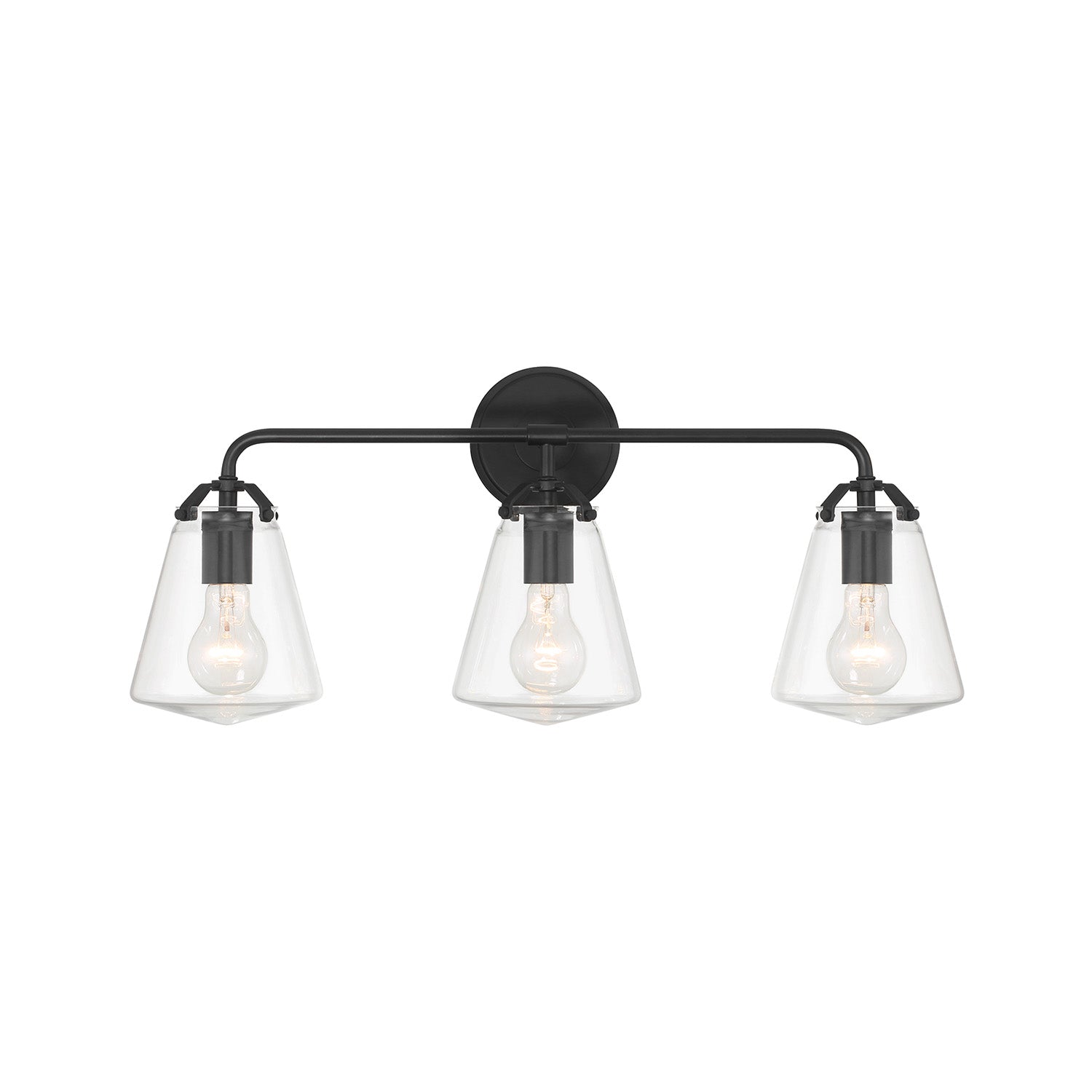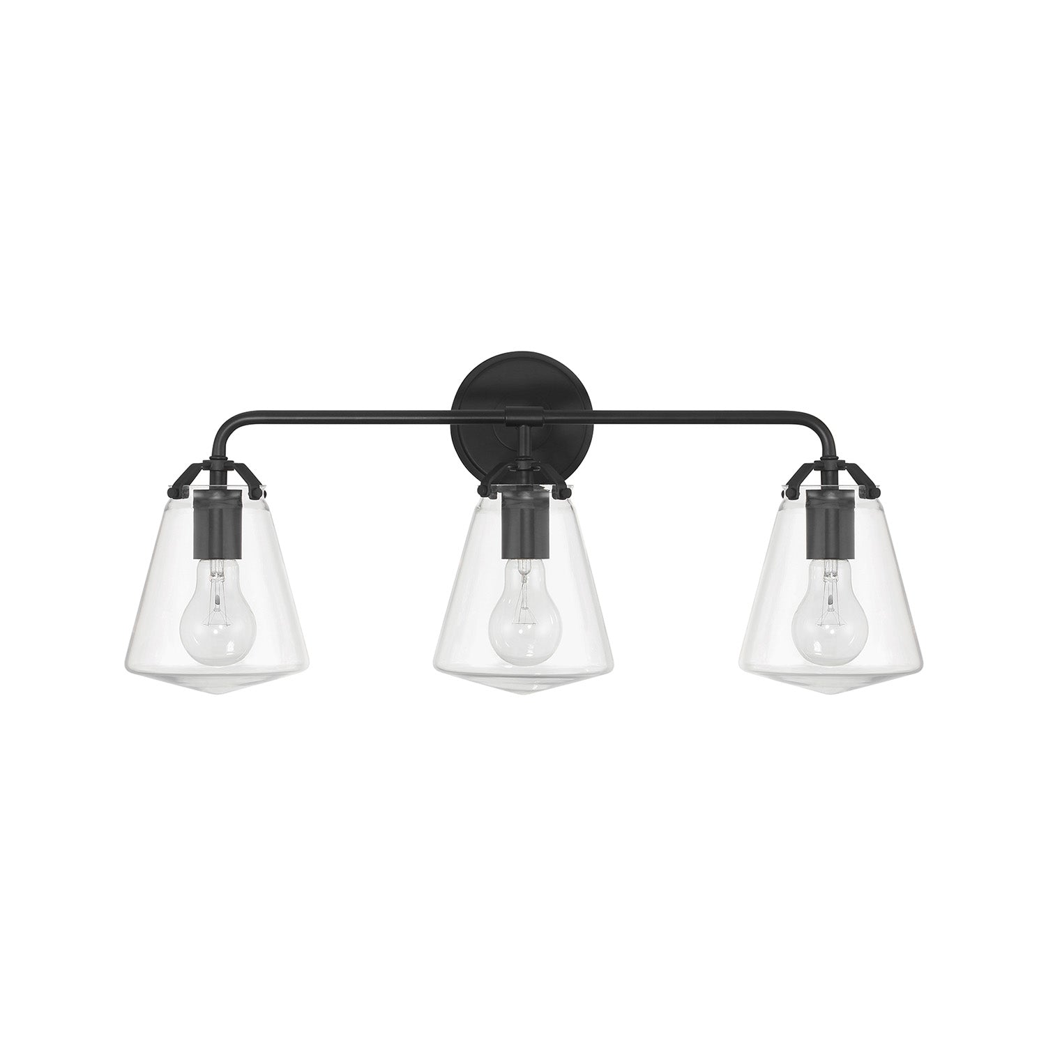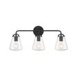 • Elegant vanity light featuring three tapered clear glass shades with sleek matte black accents for a sophisticated, timeless look