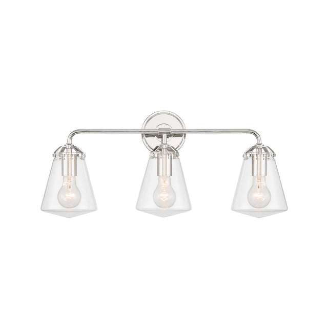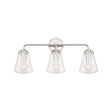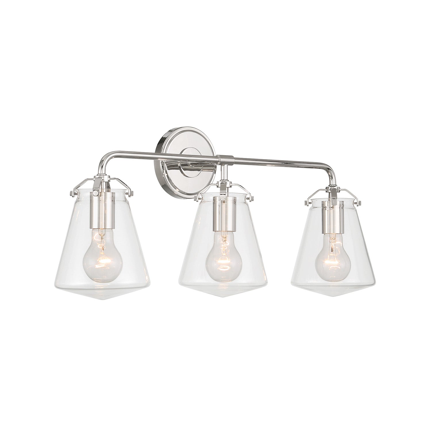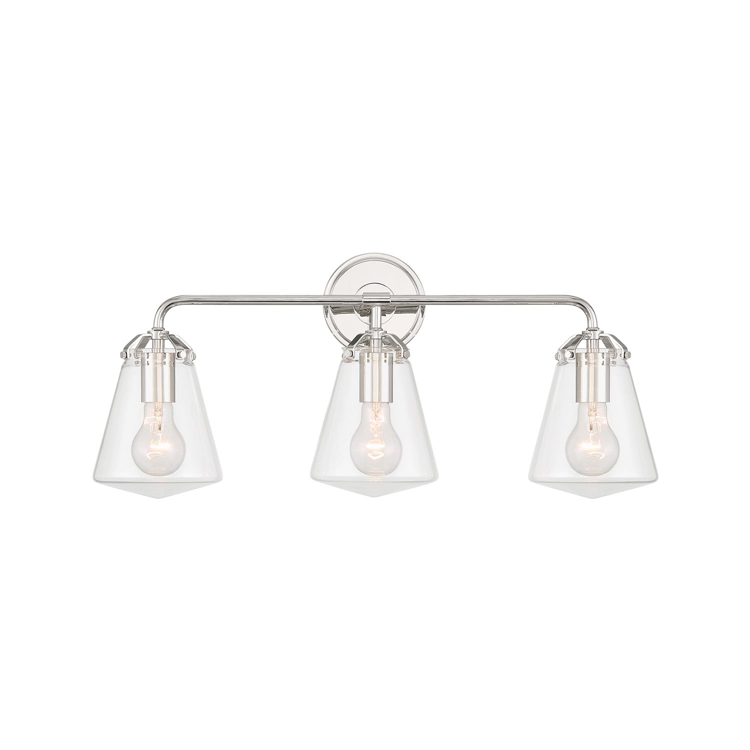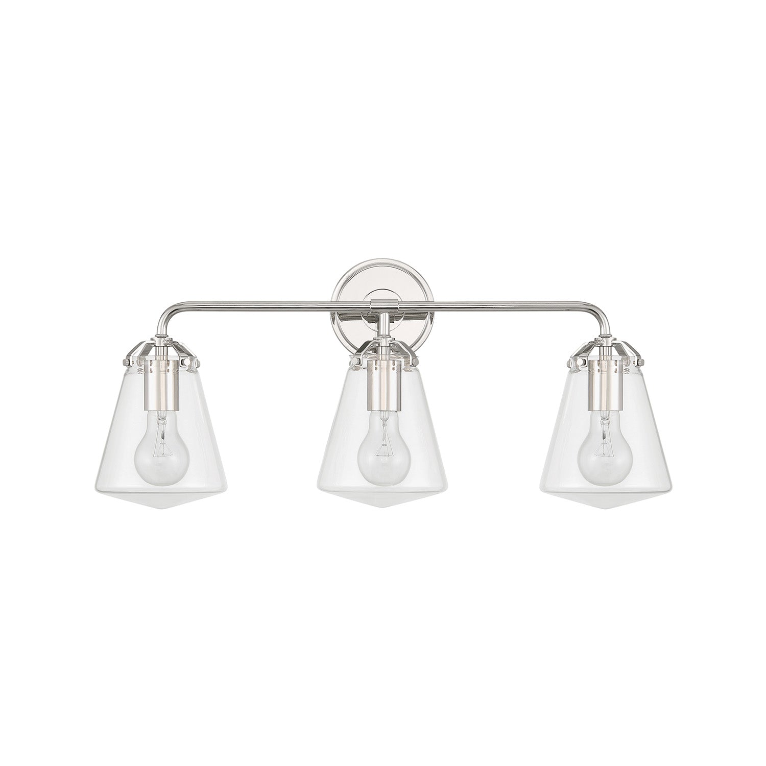 The Addison 3 Light Vanity Light brings timeless sophistication to bathrooms and vanity areas with its clean, architectural design. Featuring three tapered clear glass shades that showcase the bulbs within, this 25" fixture creates both focused task lighting and ambient illumination. The polished nickel backplate and fixture hardware add a bright, refined touch that complements both modern and traditional interiors. The Addison vanity light combines classic materials with contemporary sensibility to create a versatile lighting solution that enhances your space with refined elegance.