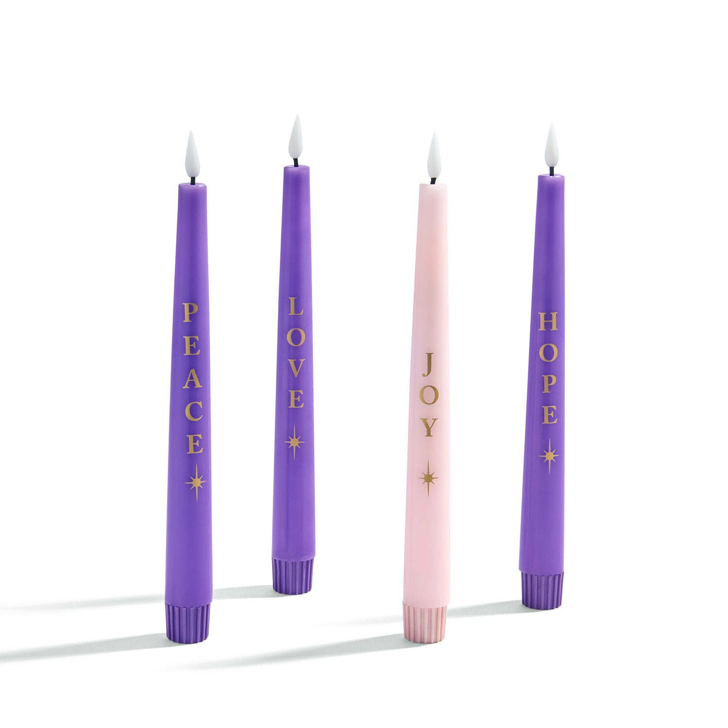 • Set includes one pink and three purple real-wax candles. Gold lettering adorns these candles with the words: Peace, Love, Hope, and Joy