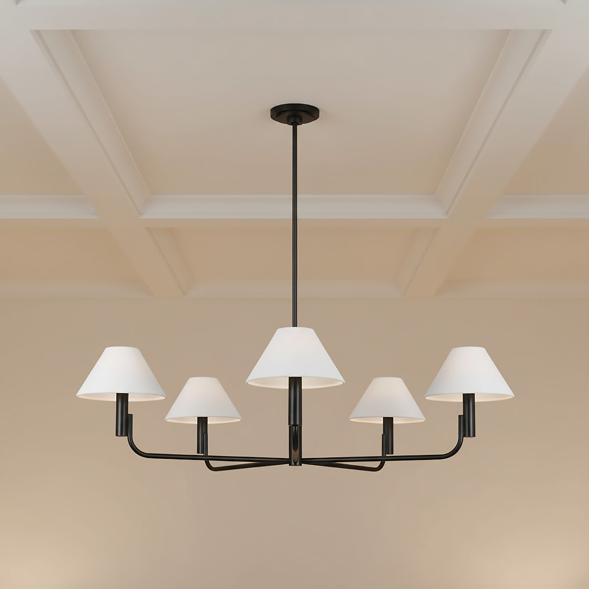 The Altair 5 Light Chandelier features an elegant modern design with simple lines and five distinctive linen shades that create sophisticated visual interest and soft, diffused illumination throughout the space. This refined 40" chandelier combines a clean contemporary silhouette with thoughtful design elements that effortlessly accent interior decor styles of any aesthetic, perfect for dining rooms, entryways, living spaces, and areas seeking statement chandelier lighting with distinctive appeal. The aged iron finish creates sophisticated contrast while the linen shades provide beautiful, even illumination with commanding presence. With its damp-rated construction, flexible hanging height, and dimmable capabilities, this gracefully designed chandelier transforms any space with distinctive style and performance.