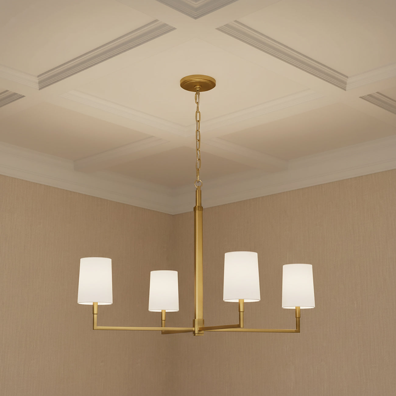 The Andrew 4 Light Chandelier seamlessly blends modern minimalism with vintage charm, showcasing clean, structured lines and simplicity that creates timeless aesthetic appeal throughout the space. This sophisticated 36" chandelier features thoughtfully balanced proportions with understated details that create a refined yet casual elegance, perfect for larger dining rooms, grand entryways, living spaces, and areas seeking substantial statement lighting that feels at home in both contemporary and traditional interiors. The warm modern brass finish exudes sophisticated elegance while the white linen shades deliver soft, even illumination with understated refinement. With its damp-rated construction and substantial hanging range, this beautifully designed chandelier elevates any space with timeless sophistication and enduring style.