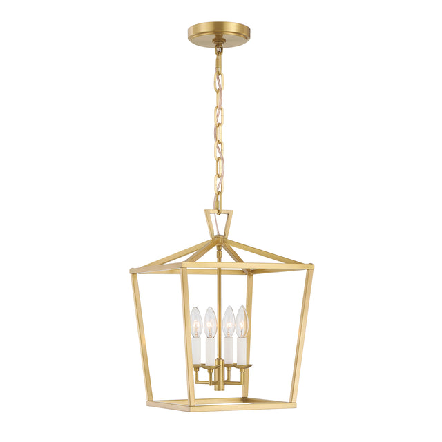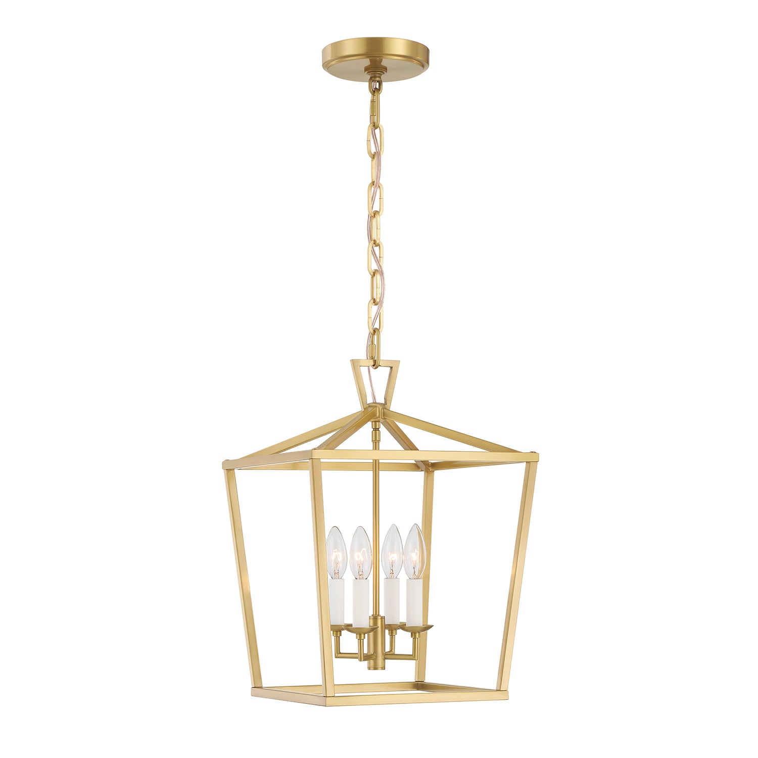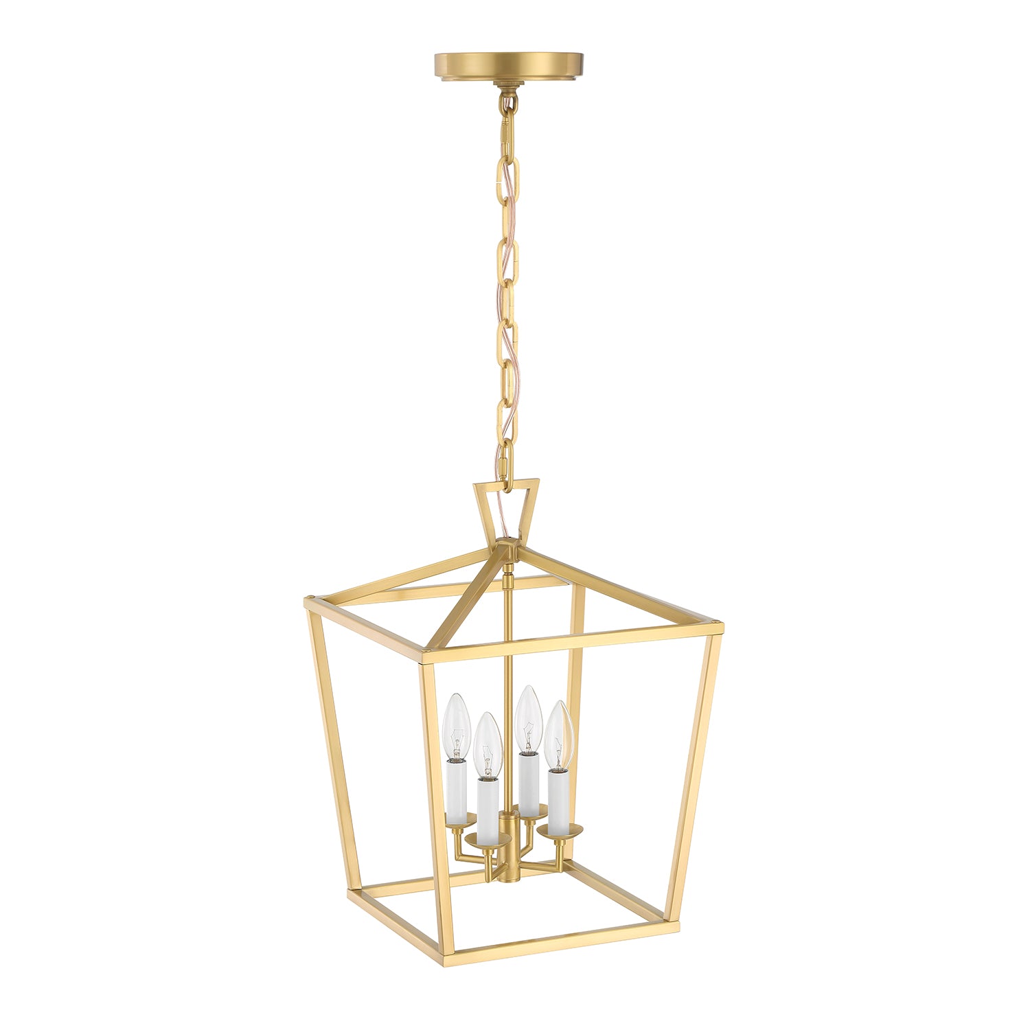The Anover Collection of dramatic, open frame pendant lights is inspired by a classic silhouette and enhanced with modern detailing and finishes. The Anover 13" wide Lantern Pendant features four candelabra lights set in a timeless open metal frame, finished in a warm satin brass. The entire structure is suspended by a beautiful, adjustable matching chain and circular canopy. Each component has been thoughtfully styled and produced; including a delicately tiered canopy, seamless body welds punctuated with rivets, stunning top loop, and flawless chain links. This beautiful fixture is dimmable with compatible bulbs and dimmer. Perfect for an entryway, kitchen, or above a dining table.
