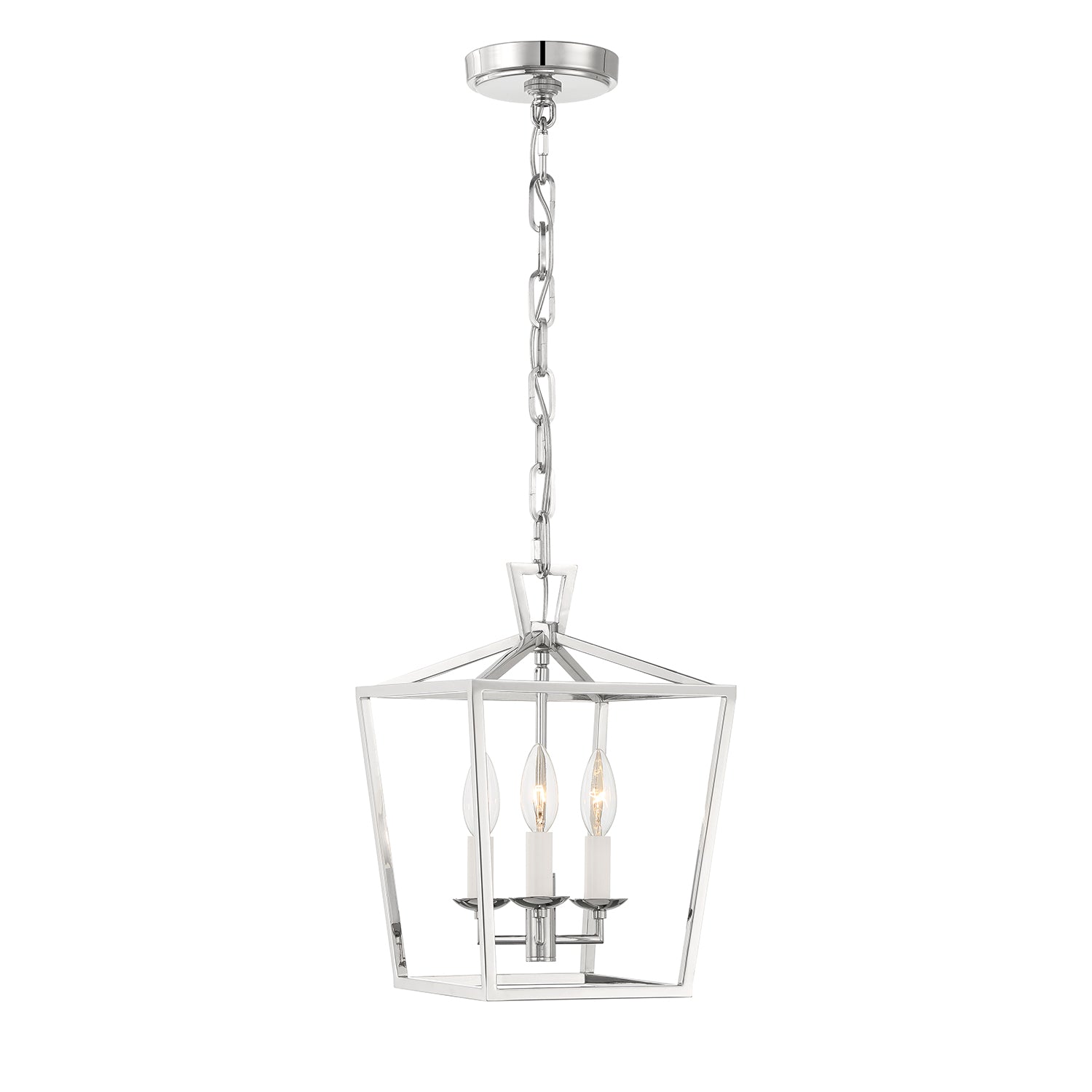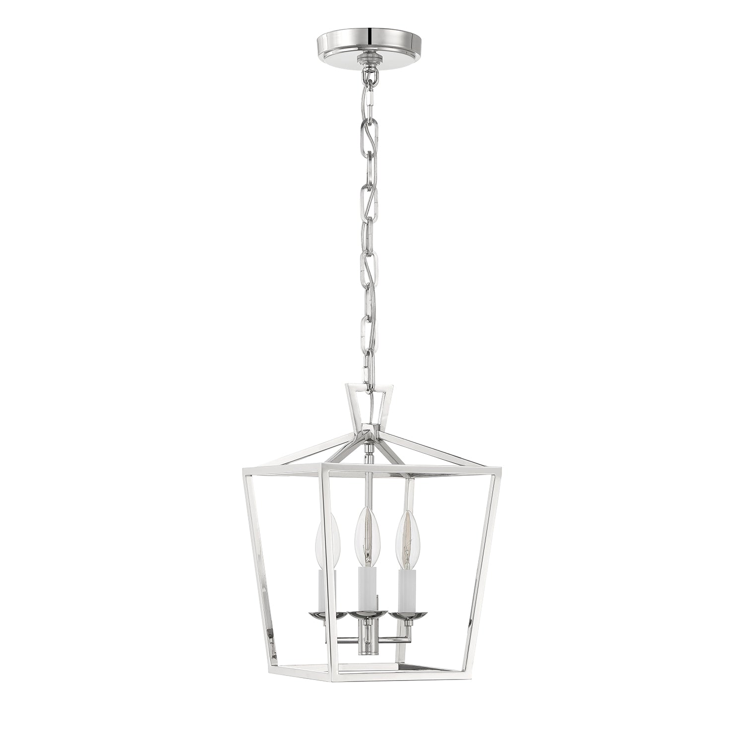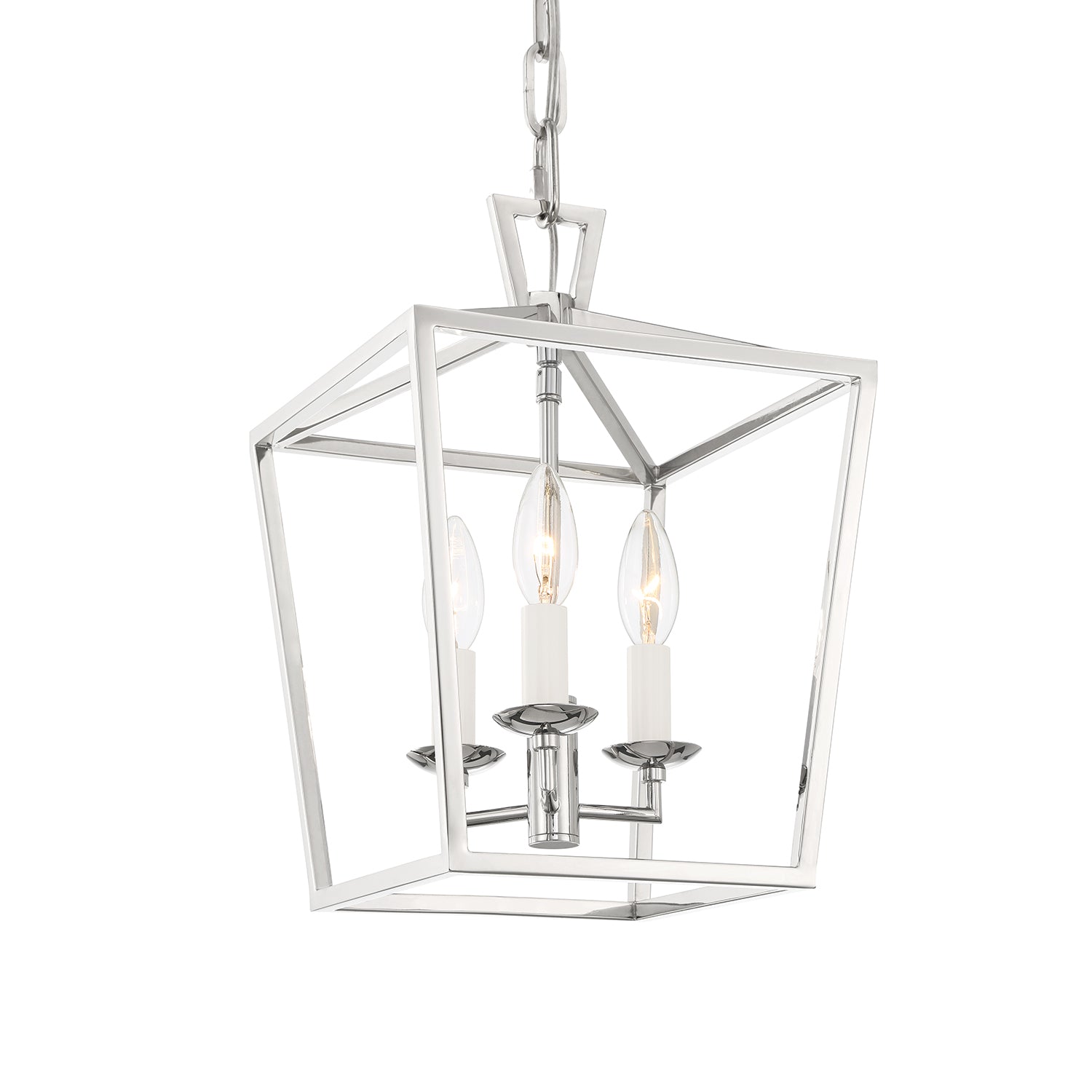 The Anover Collection of dramatic, open frame pendant lights is inspired by a classic silhouette and enhanced with modern detailing and finishes. The Anover 10" wide Lantern Pendant features three candelabra lights set in a timeless open metal frame, finished in a glossy polished nickel. The entire structure is suspended by a beautiful, adjustable matching chain and circular canopy. Each component has been thoughtfully styled and produced; including a delicately tiered canopy, seamless body welds punctuated with rivets, stunning top loop, and flawless chain links. This beautiful fixture is dimmable with compatible bulbs and dimmer. Perfect for an entryway, hallway, or above a small dining table.
