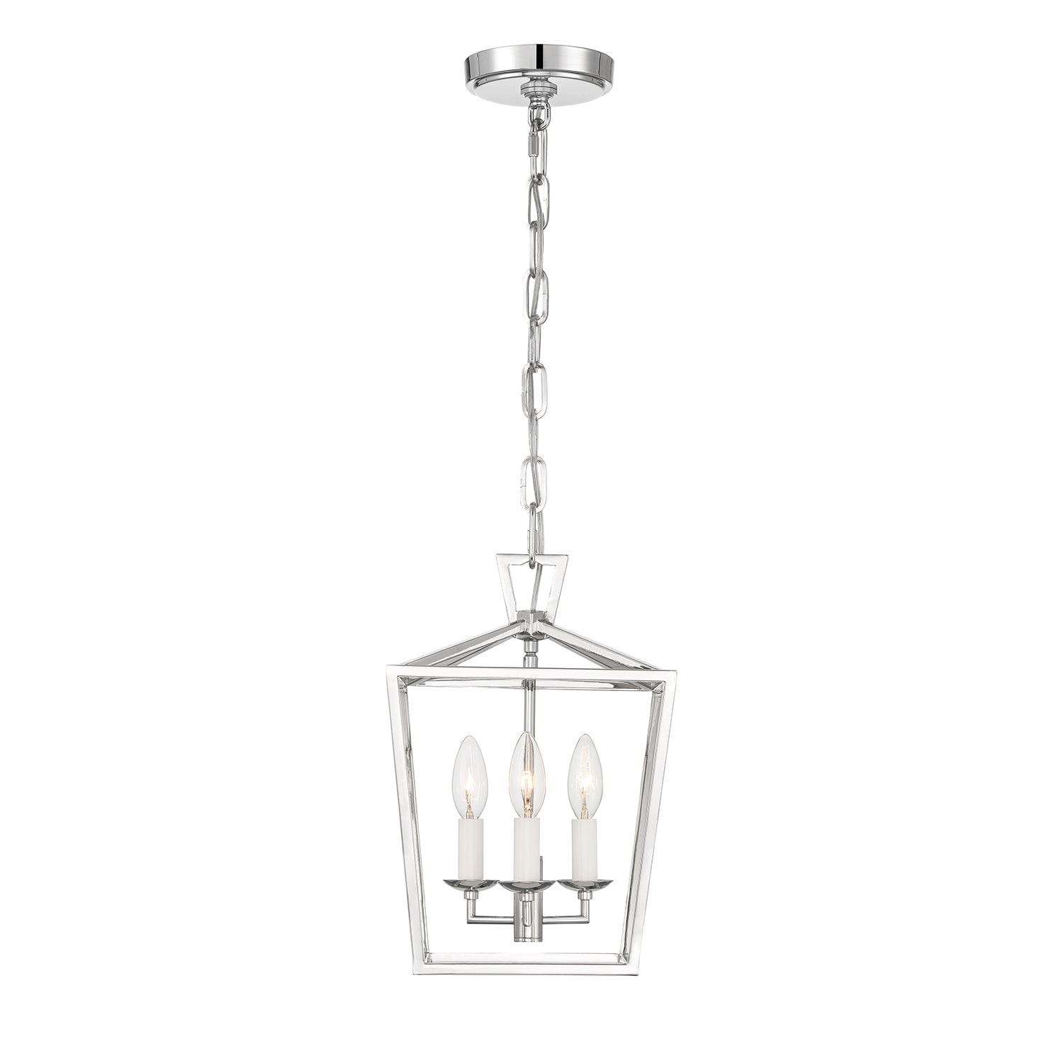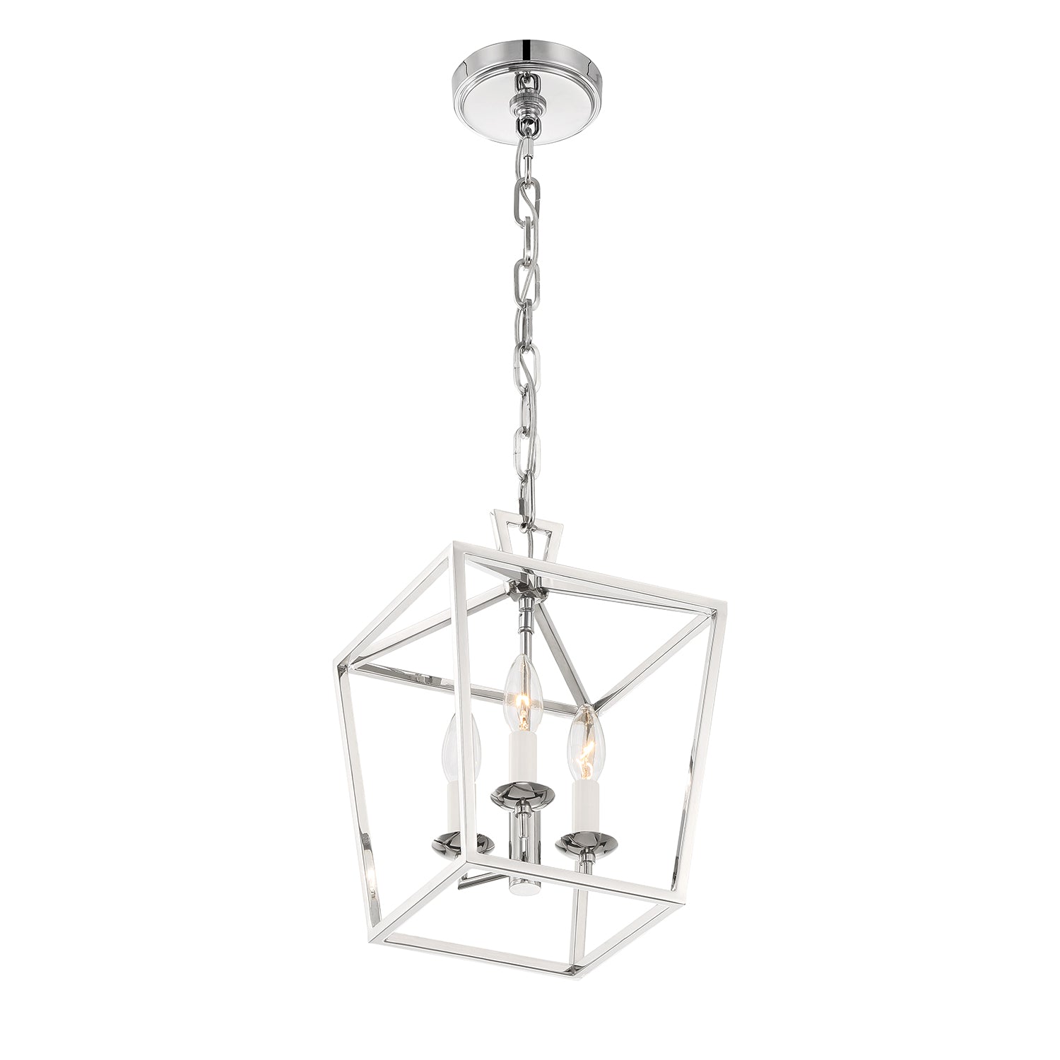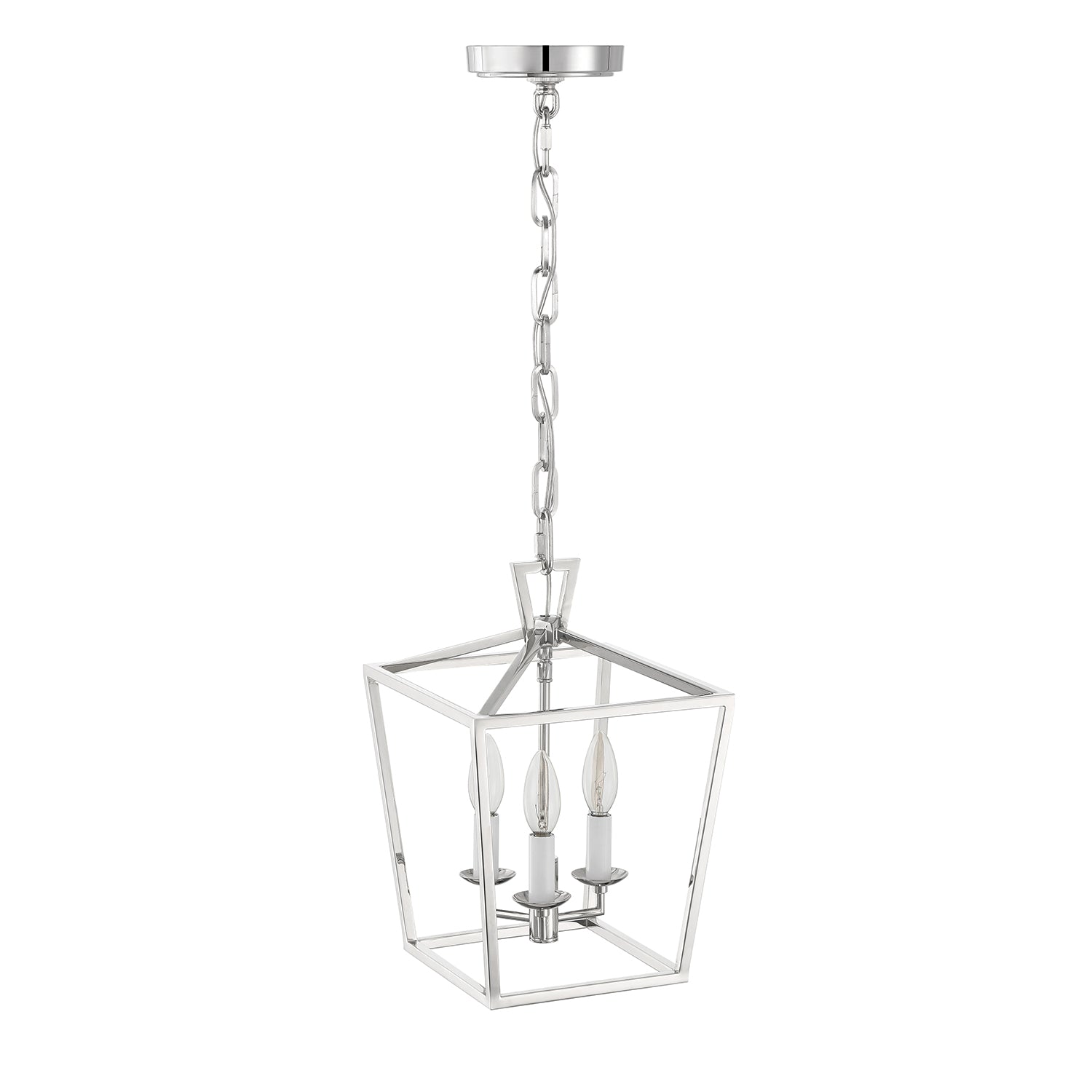 The Anover Collection of dramatic, open frame pendant lights is inspired by a classic silhouette and enhanced with modern detailing and finishes. The Anover 10" wide Lantern Pendant features three candelabra lights set in a timeless open metal frame, finished in a glossy polished nickel. The entire structure is suspended by a beautiful, adjustable matching chain and circular canopy. Each component has been thoughtfully styled and produced; including a delicately tiered canopy, seamless body welds punctuated with rivets, stunning top loop, and flawless chain links. This beautiful fixture is dimmable with compatible bulbs and dimmer. Perfect for an entryway, hallway, or above a small dining table.