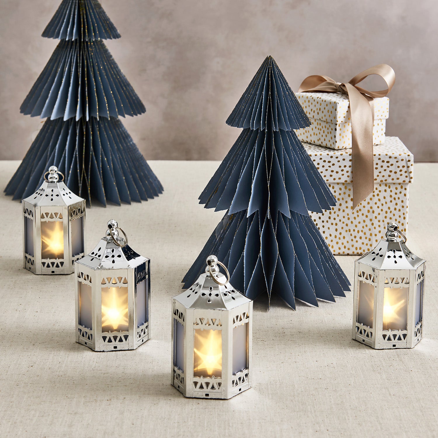 • Set of six festive, silver lanterns with a decorative star motif and enchanting, starry hologram