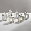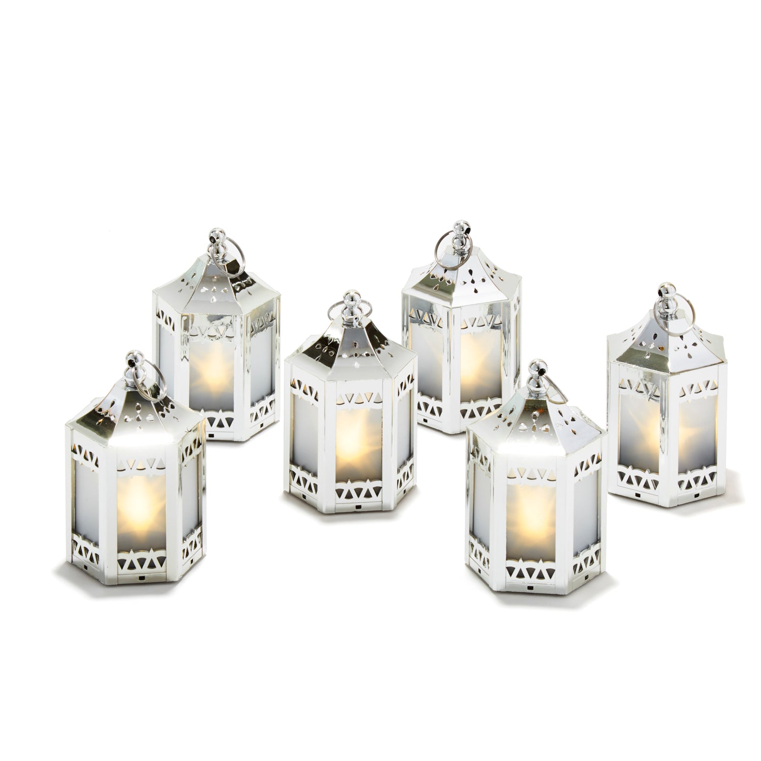 This set includes six intricate silver mini lanterns. Each petite lantern features translucent windowpanes, revealing a twinkling holographic star. A decorative, yet practical loop crowns the tapered top, and a fun keyhole pattern adorns each of the faceted sides. Hang as ornaments, use as part of a beautiful tablescape, or arrange along pathways and covered porches for a festive touch. Perfect for home, weddings, churches, restaurants, and events.