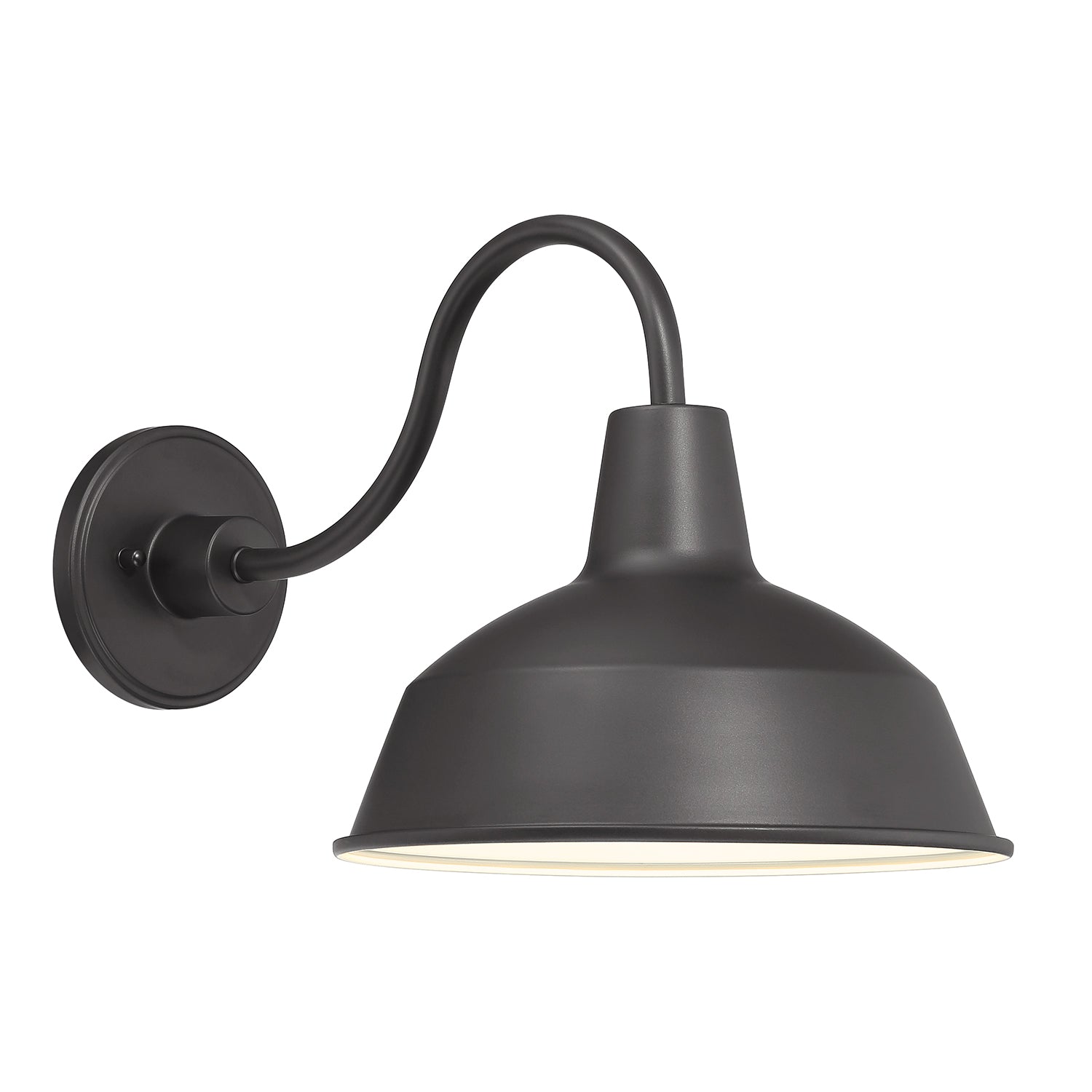 Inspired by turn-of-the-century industrial lighting, our Asher collection brings a modern farmhouse flair to your home or commercial space. The Asher 8.5" Outdoor Wall Light is rich in vintage styling and features a curved, gooseneck arm with an 8.5" round shade, suspended from a sturdy, tiered metal backplate. The matte black finish with white interior adds a refined note to this updated barn light. This light can be used outdoors or indoors and looks as great on a porch as it does in a kitchen or powder room. The Asher 8.5" Outdoor Wall Light is part of a larger collection of fixtures to complete your lighting needs.