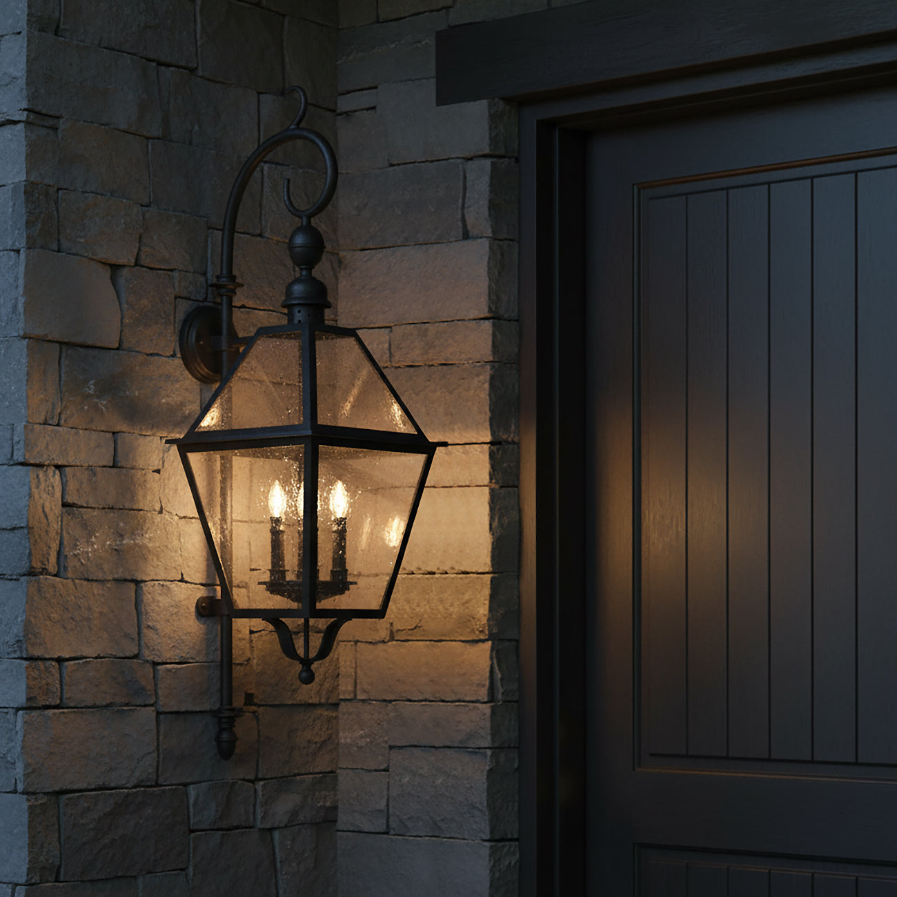 The Ashford Outdoor Wall Light brings timeless elegance to exterior spaces with its classic lantern design. This large version of the collection features a four-sided pyramid silhouette in textured black, suspended from a gracefully curved arm with decorative accents. Clear glass panels showcase the four candle-style lights within, creating a warm, inviting glow. A decorative pendant adorns the bottom, completing the refined aesthetic. Crafted from hand-worked iron, the Ashford offers traditional character while providing generous illumination. With its commanding scale, this fixture creates a grand focal point for larger facades, mansion entryways, or estate properties, delivering sophisticated style that complements various architectural designs from traditional to transitional.