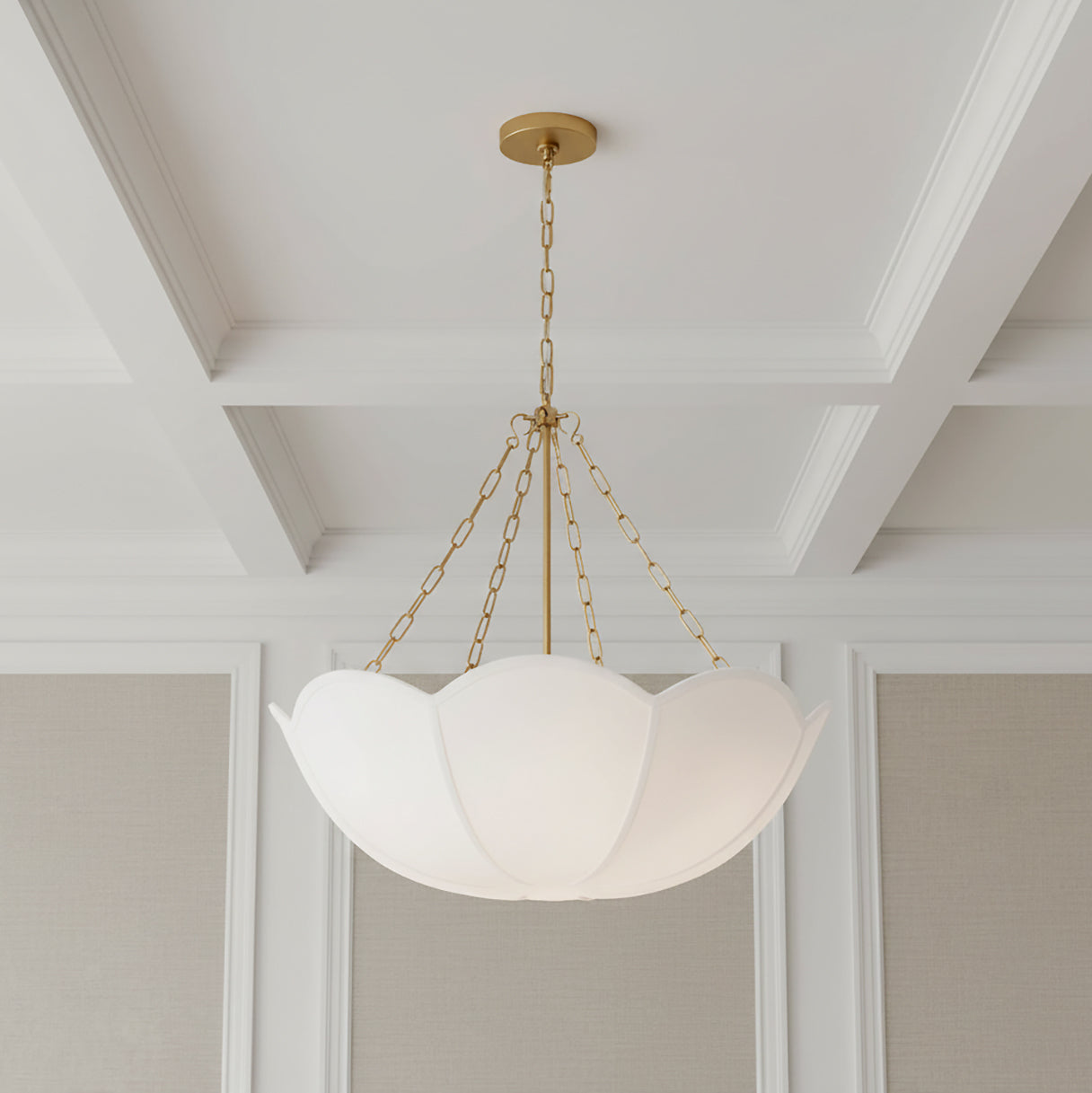 The Ava Pendant is reminiscent of a spring tulip, featuring a graceful silhouette that creates elegant illumination with organic charm and sophisticated presence. This refined 24" pendant showcases the beautiful contrast of metal chain detailing and white linen, creating a harmonious statement that enhances dining rooms, living spaces, entryways, foyers, and areas seeking substantial pendant lighting with distinctive character. The modern brass framework brings warm metallic sophistication to the curved form while the white linen shade provides soft, diffused illumination with natural elegance. With its damp-rated construction and flexible hanging height, this thoughtfully crafted pendant elevates any space with distinctive style and reliable performance.
