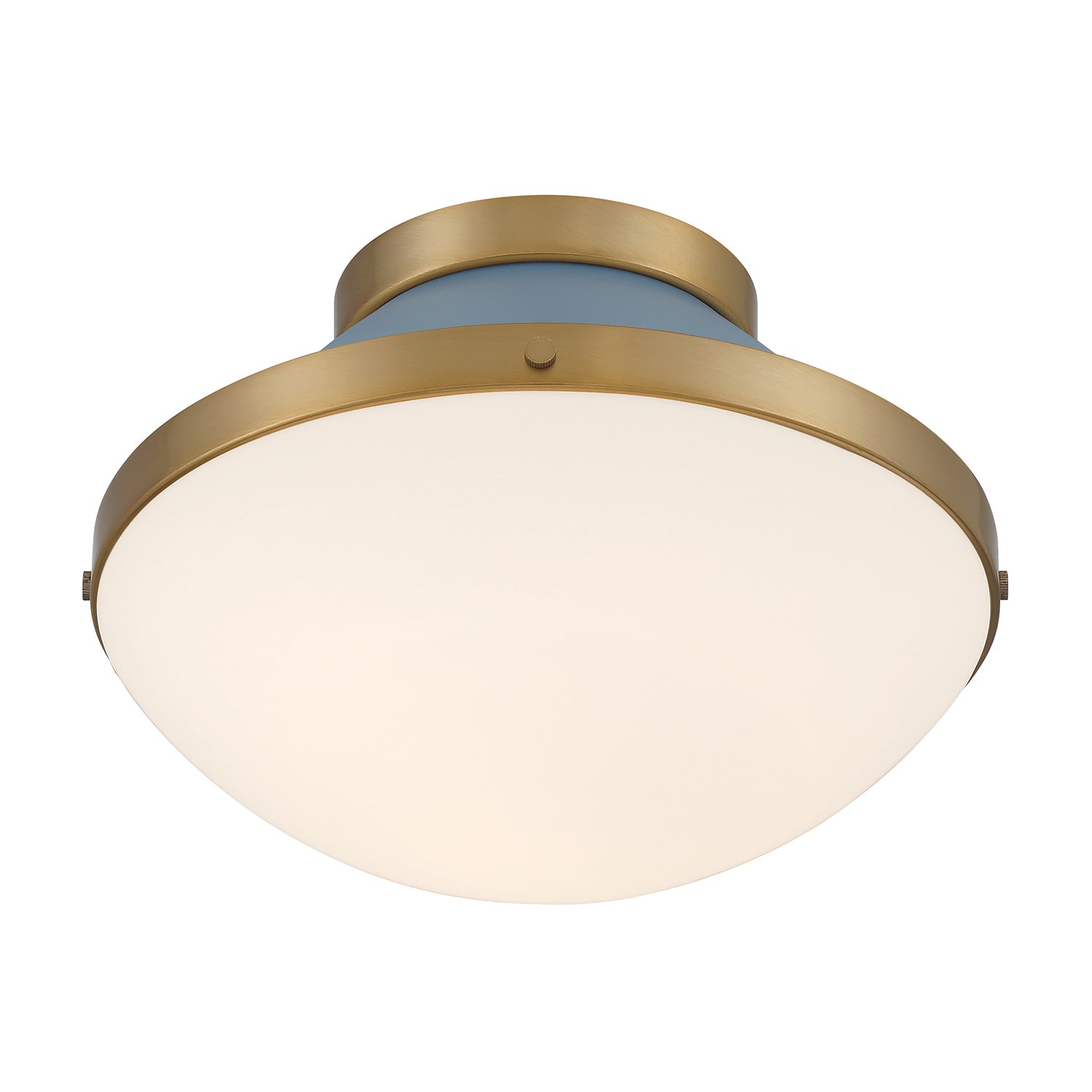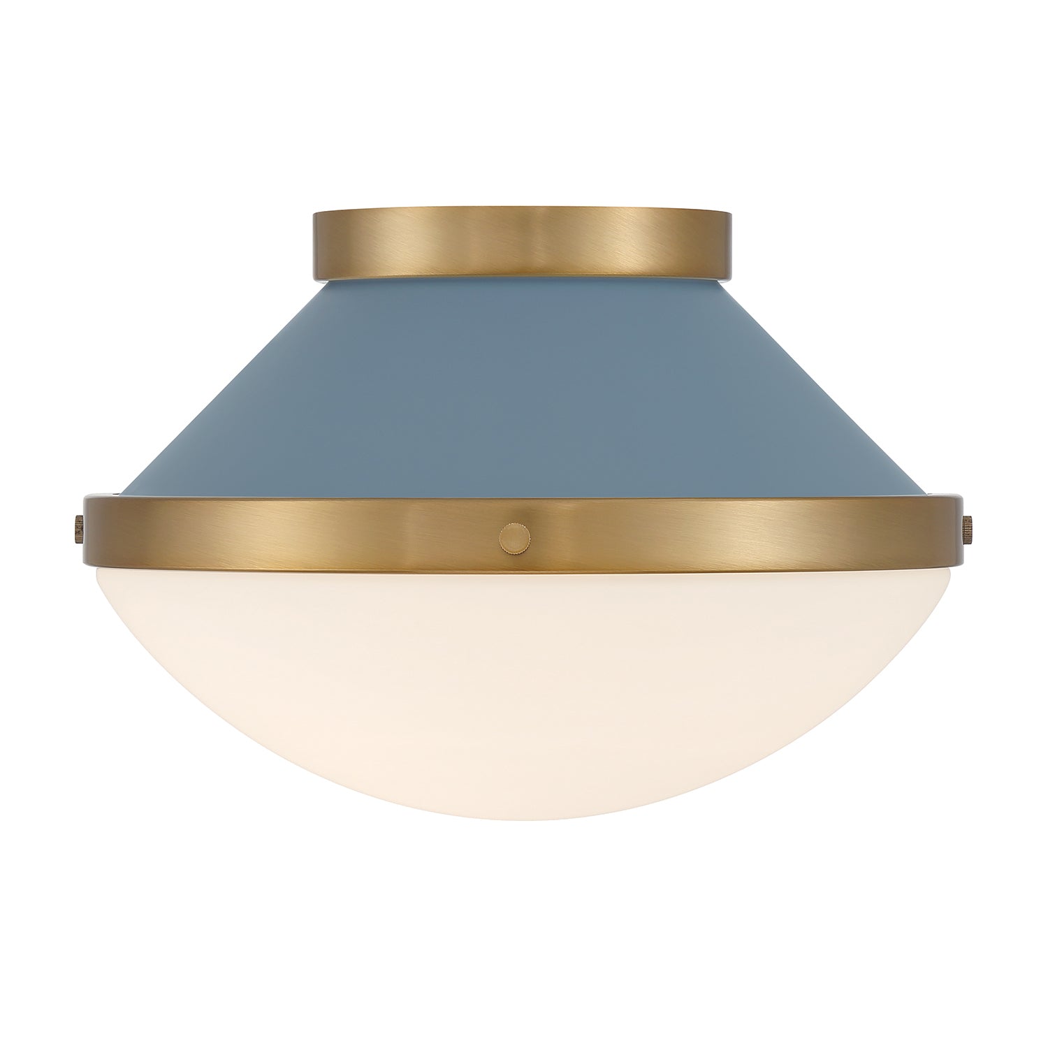 • The Blair Flush Mount features a mid-century inspired design with a French blue frame, white opal glass diffuser, and brass accents