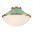 • The Blair Flush Mount features a mid-century inspired design with Sage green colored frame, white opal glass diffuser, and brass accents