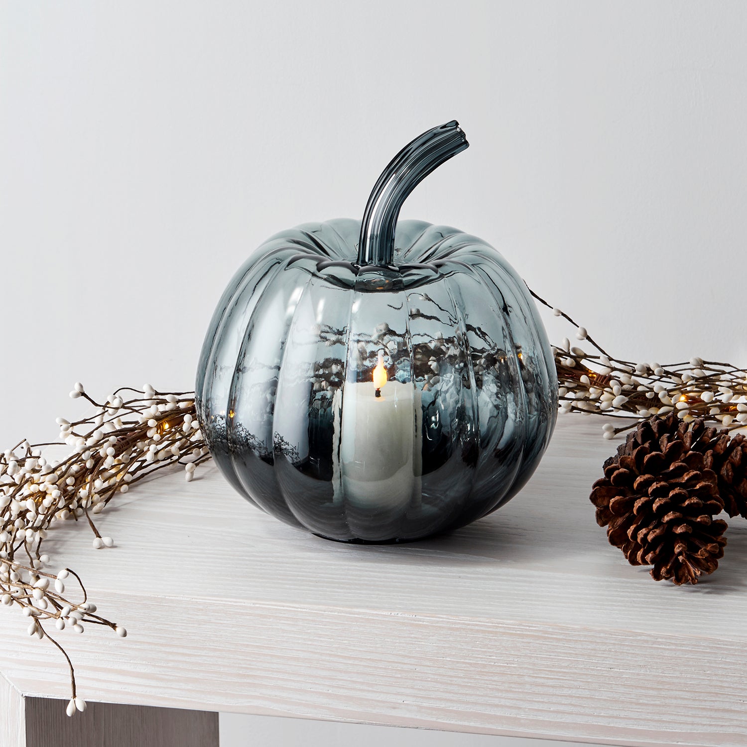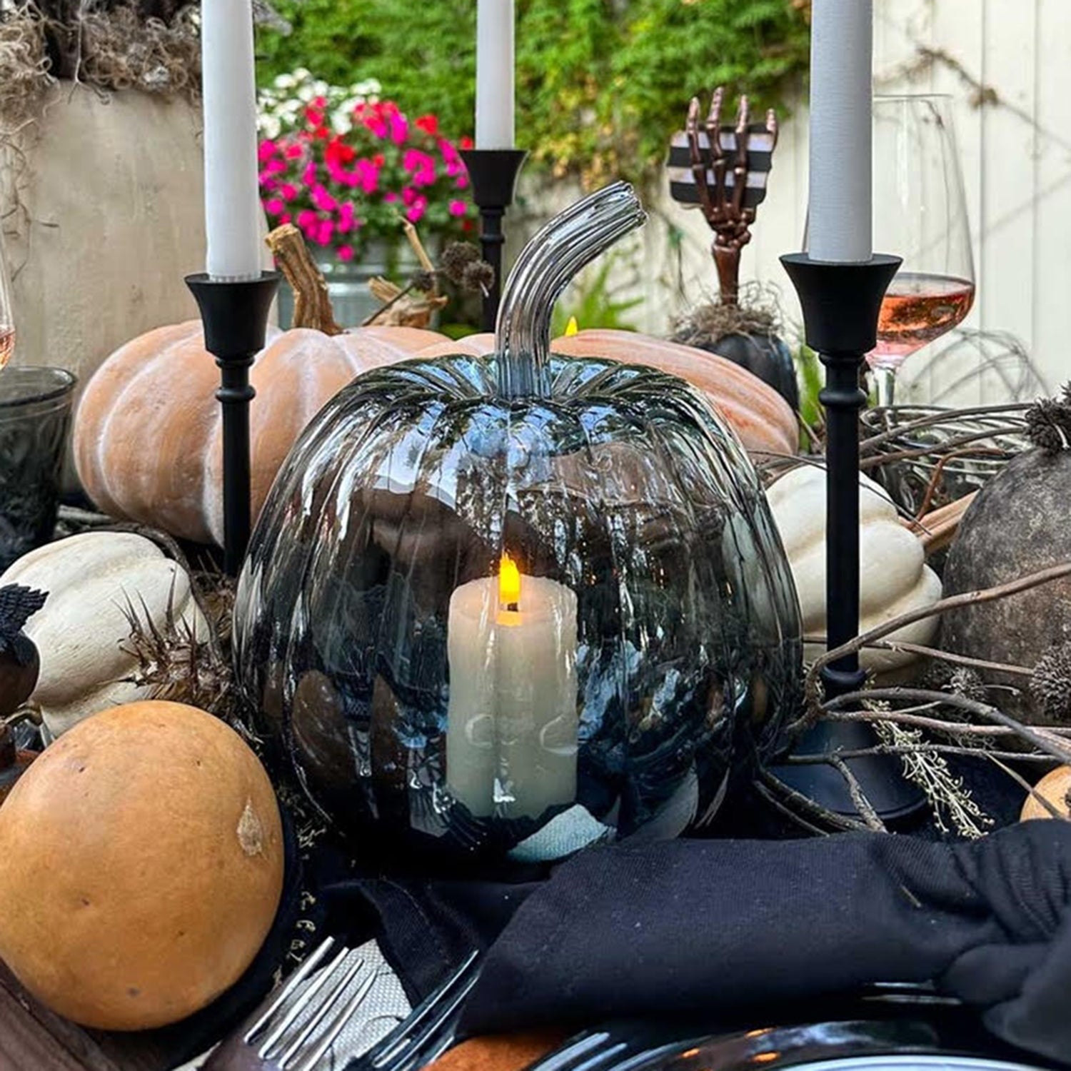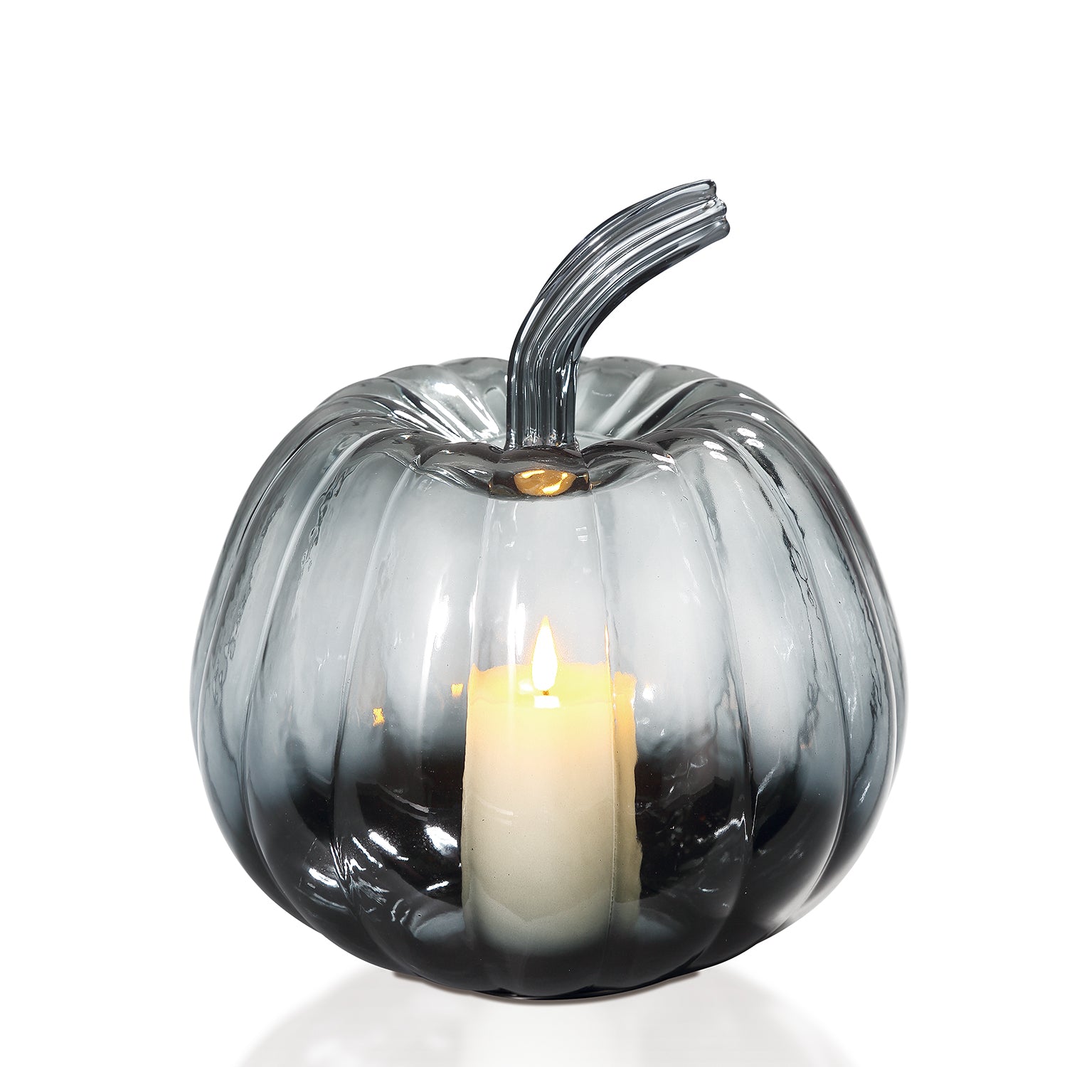 This beautiful decorative glass pumpkin cloche is a chic and modern update to your fall decor. Pair this 8" pumpkin with the included flameless LED votive candle to create a warm moody glow. The grey-to-black ombre-colored glass makes this perfect for Halloween or for a modern black-and-white Thanksgiving display. Intended for indoor use, it can be placed on your mantel or the focal point of your tablescape or window display. This can also be paired with string lights or placed outside with an outdoor candle for trick-or-treaters to enjoy. Substantial in size and versatile in style, the Blair pumpkin is suitable for the entire season!
