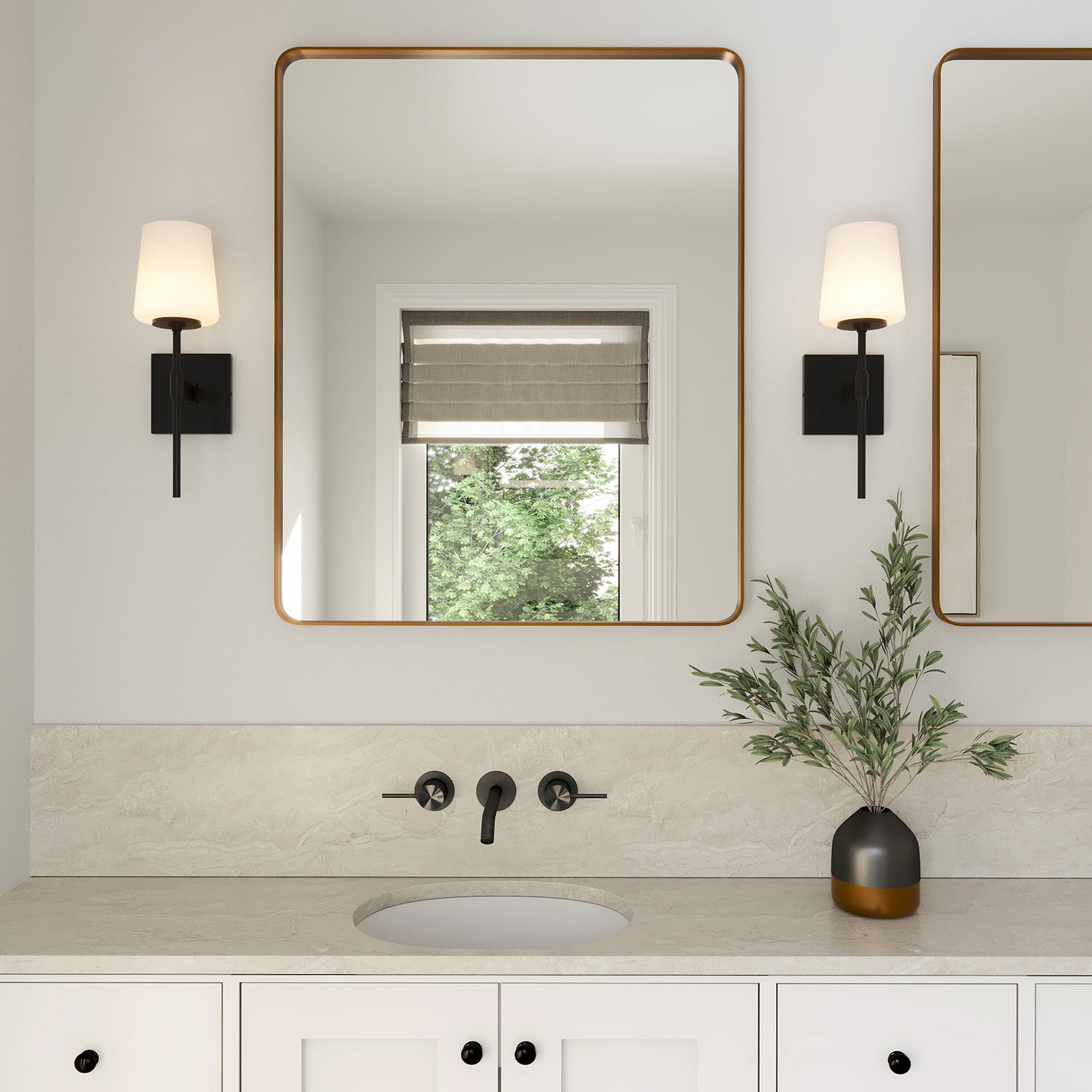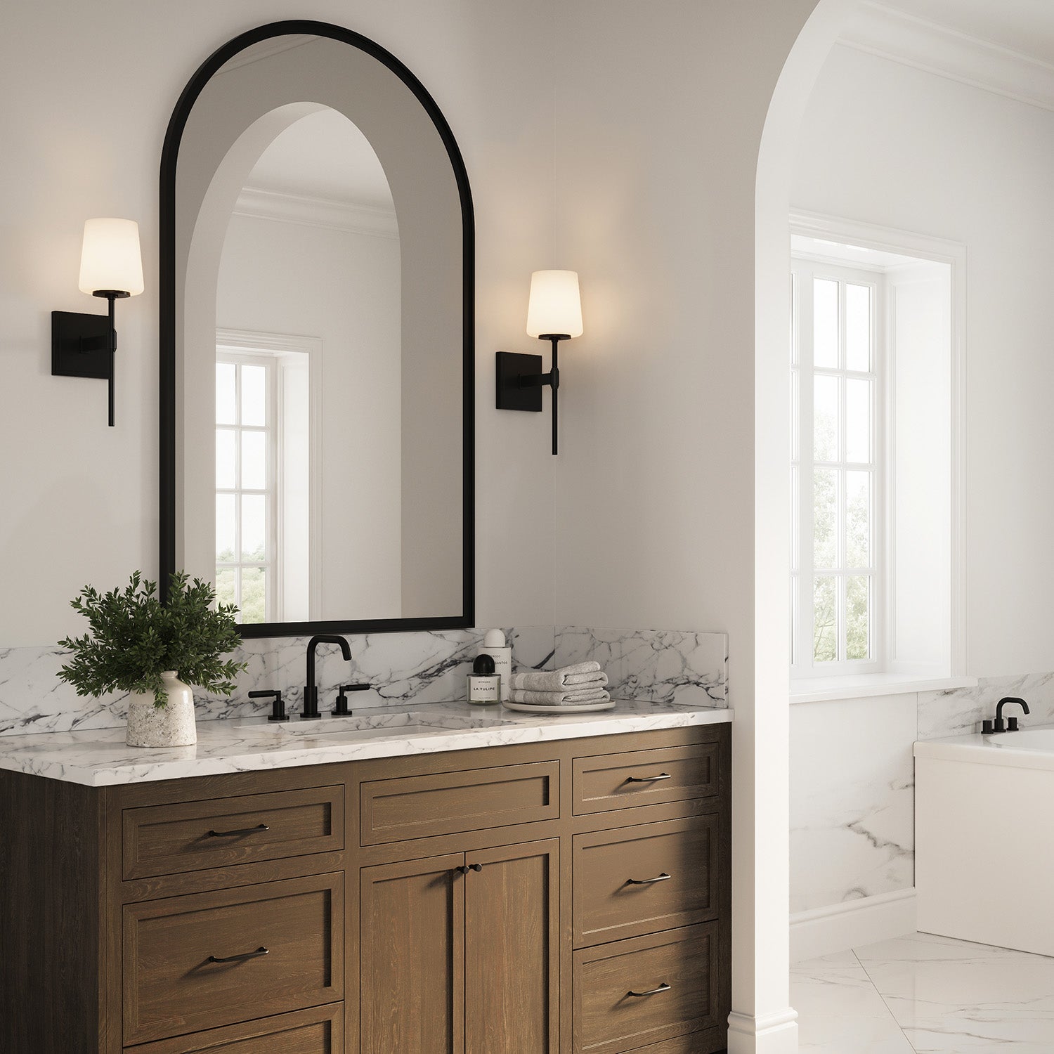 The Blake Vanity Collection references a classic silhouette paired with a modern, sleek finish in distinctive matte black. Versatile and stylish, this transitional wall sconce makes a wonderful addition to your primary bathroom vanity and adds sophistication to your powder room. Featuring a slim arm mounted to a square backplate, supporting a beautiful frosted glass shade, this 16” tall wall light provides soft illumination for your room. The Blake is also available in a coordinating 24" 3 light bathroom vanity.