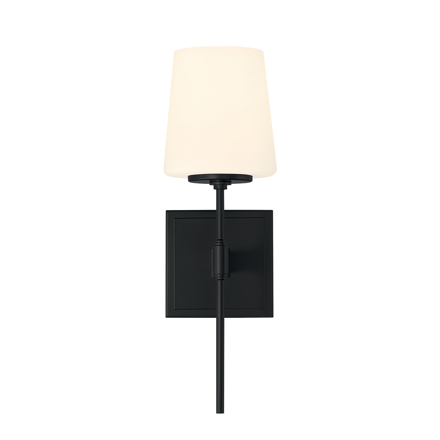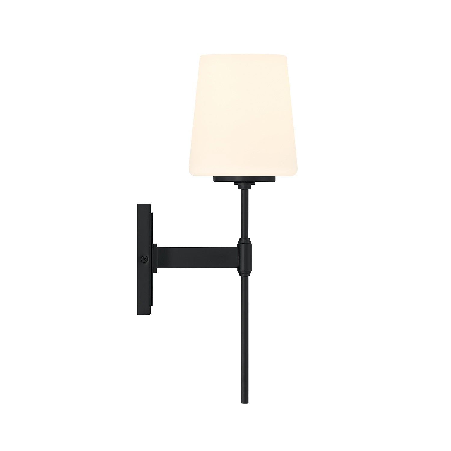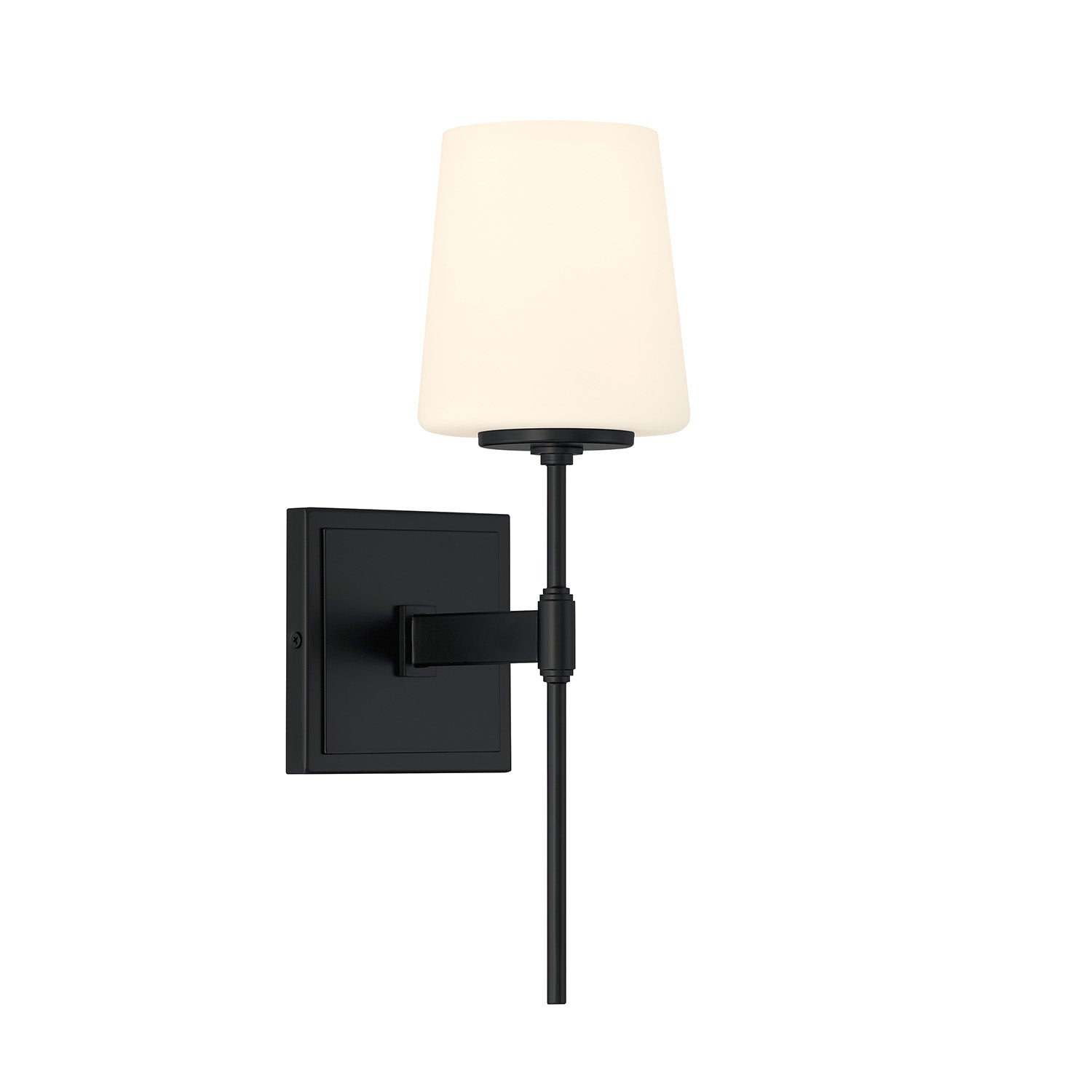• One stylish 16" tall wall sconce in a matte black finish with a white opal glass shade
