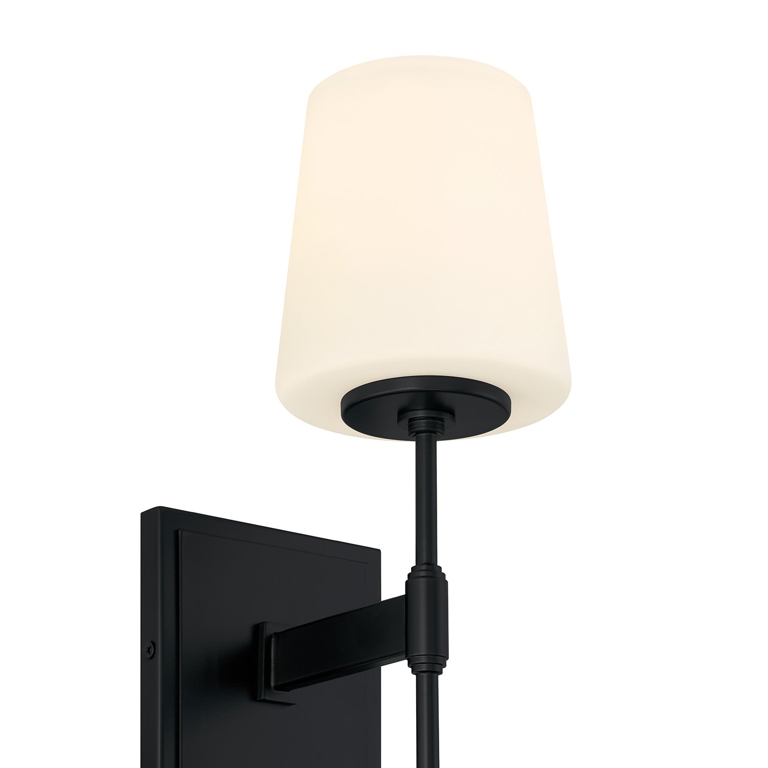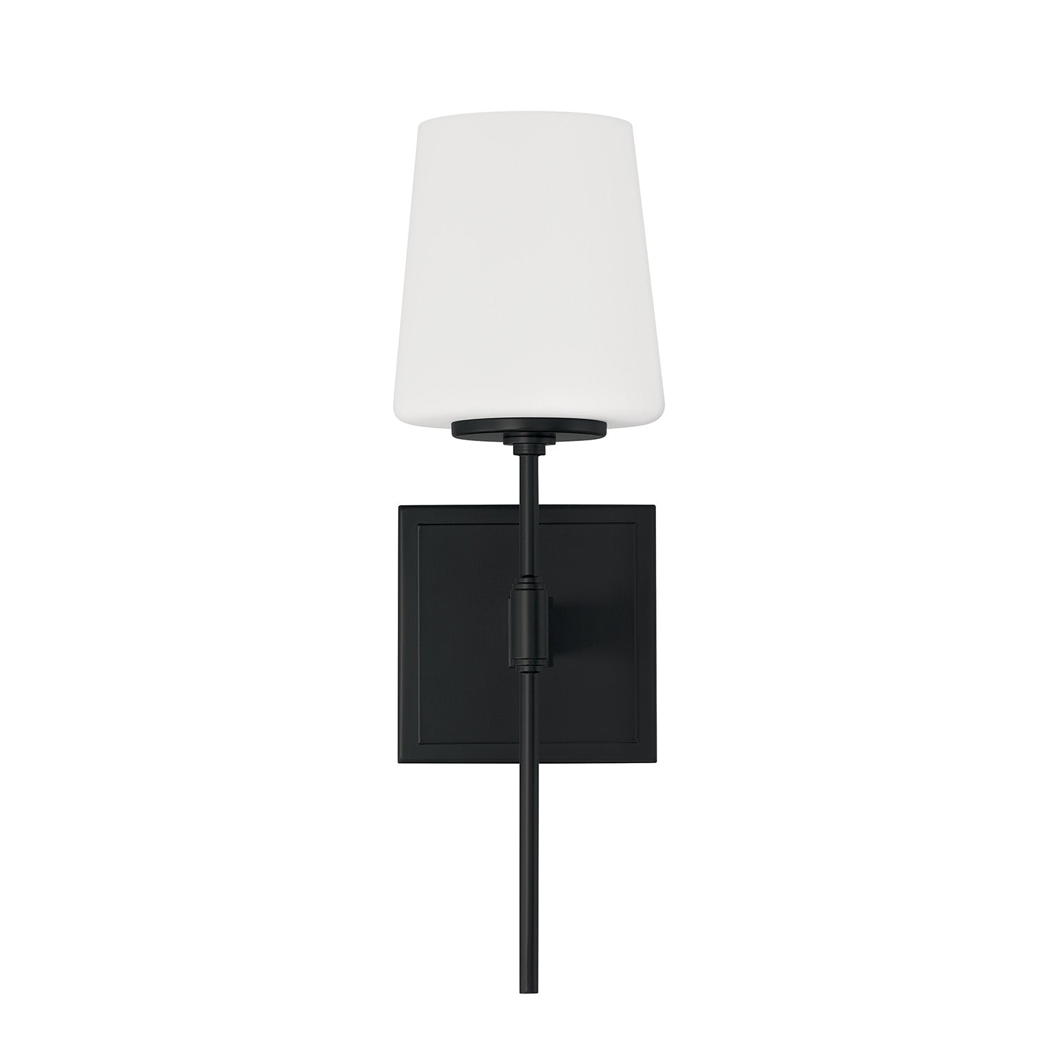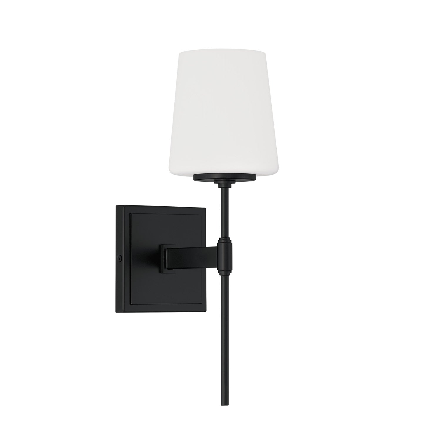 • One stylish 16" tall wall sconce in a matte black finish with a white opal glass shade