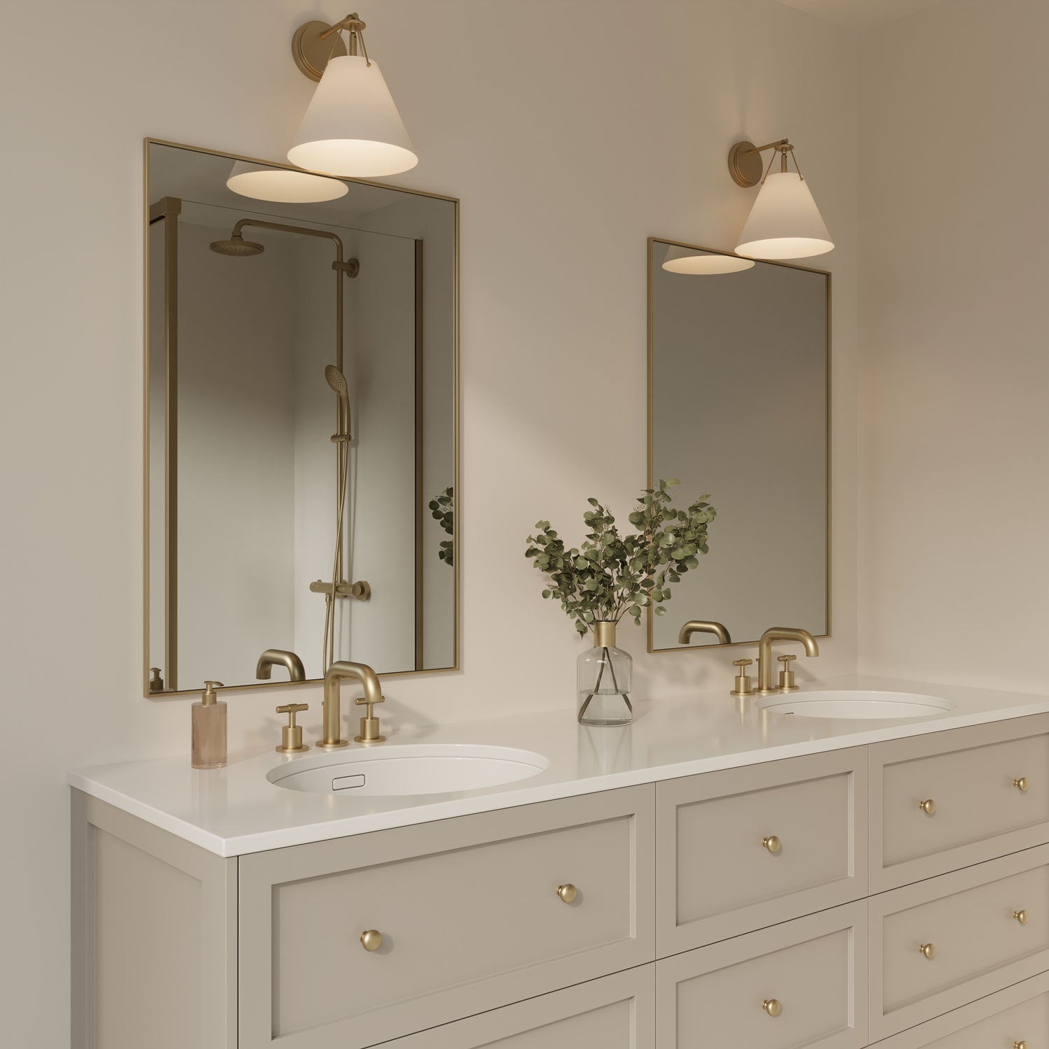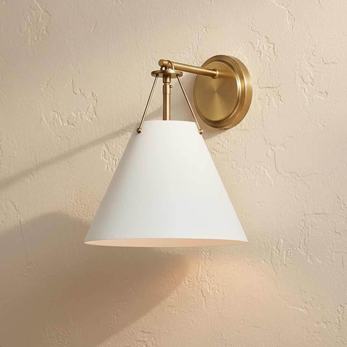 The Bowie Wall Sconce in white and brass brings a refined, architectural touch to your walls with its clean lines and modern design. The conical metal shade, featuring a white exterior and interior, directs light downward for ideal task illumination, perfect for hallways, bedside reading, or highlighting entryways and mirrors. The aged brass accents add warmth and contrast, seamlessly integrating into a variety of interior styles. Damp-rated for use in bathrooms, this versatile sconce fits beautifully in bedrooms, living rooms, or foyers, offering both style and function for any space.